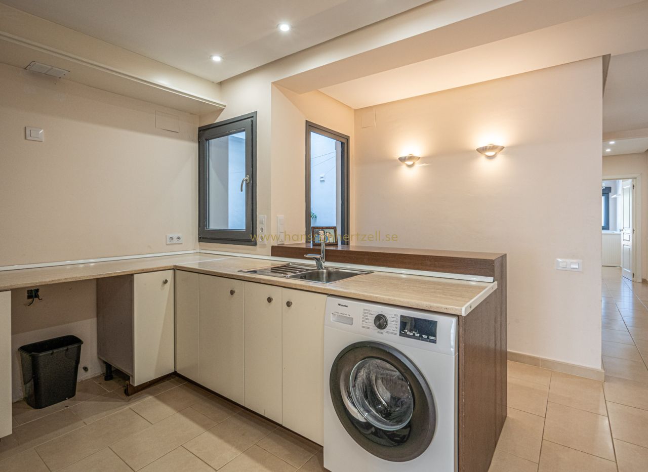 This terraced house is located on the outskirts of the historic center of Jávea, which to this day retains its medieval appearance. This makes it a unique network of narrow streets with southern-looking white facades and floral decorations to stroll through. You will also find many cozy restaurants and quaint stores. Also all amenities such as supermarkets, medical center, schools, restaurants, etc. are within walking distance. The house consists of 4 floors. The first floor is set up as a commercial office and has a separate entrance. The second floor consists of a large living-dining room with balcony, a kitchen, two double bedrooms one with en suite bathroom and a separate bathroom. There is also an interior terrace for outdoor dining. On the second floor we again find the same layout. Here there is a second living-dining room, a kitchen, two double bedrooms, one with en suite bathroom and a separate bathroom. The third floor consists of a large room that could be used as a 5th bedroom, office, yoga studio, gym, etc. Also here is a separate bathroom with toilet and shower. Through the third floor we enter the spacious roof terrace which offers beautiful views of the Montgó, the historic center of Jávea and the sea. From all the bedrooms there is also a view of the Montgó. Moreover, you never have to look for parking in the center because the house has a huge garage that fits up to 4 cars. The property has a separate electricity and water supply for each floor, making it possible to split the rooms into 2 independent apartments.