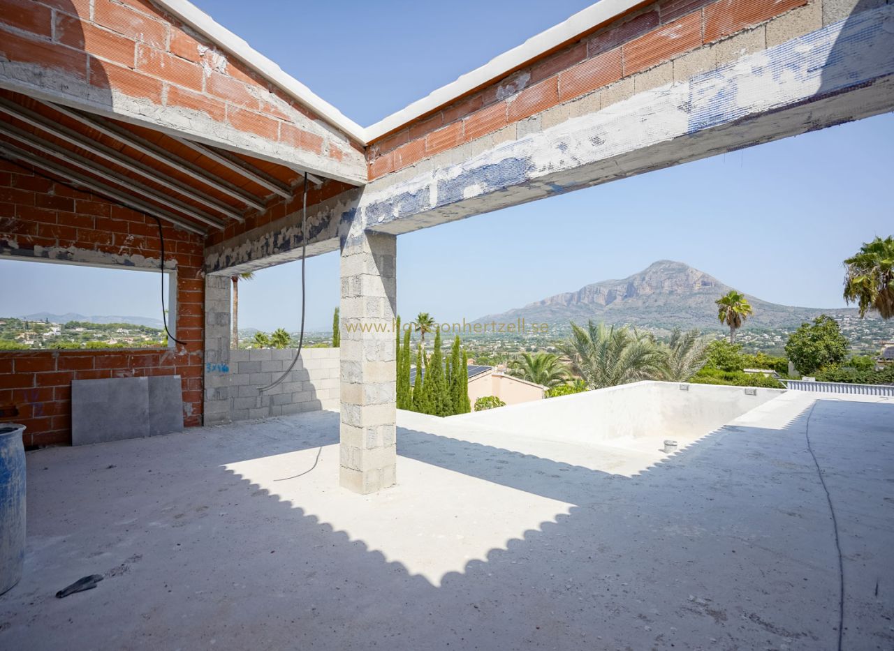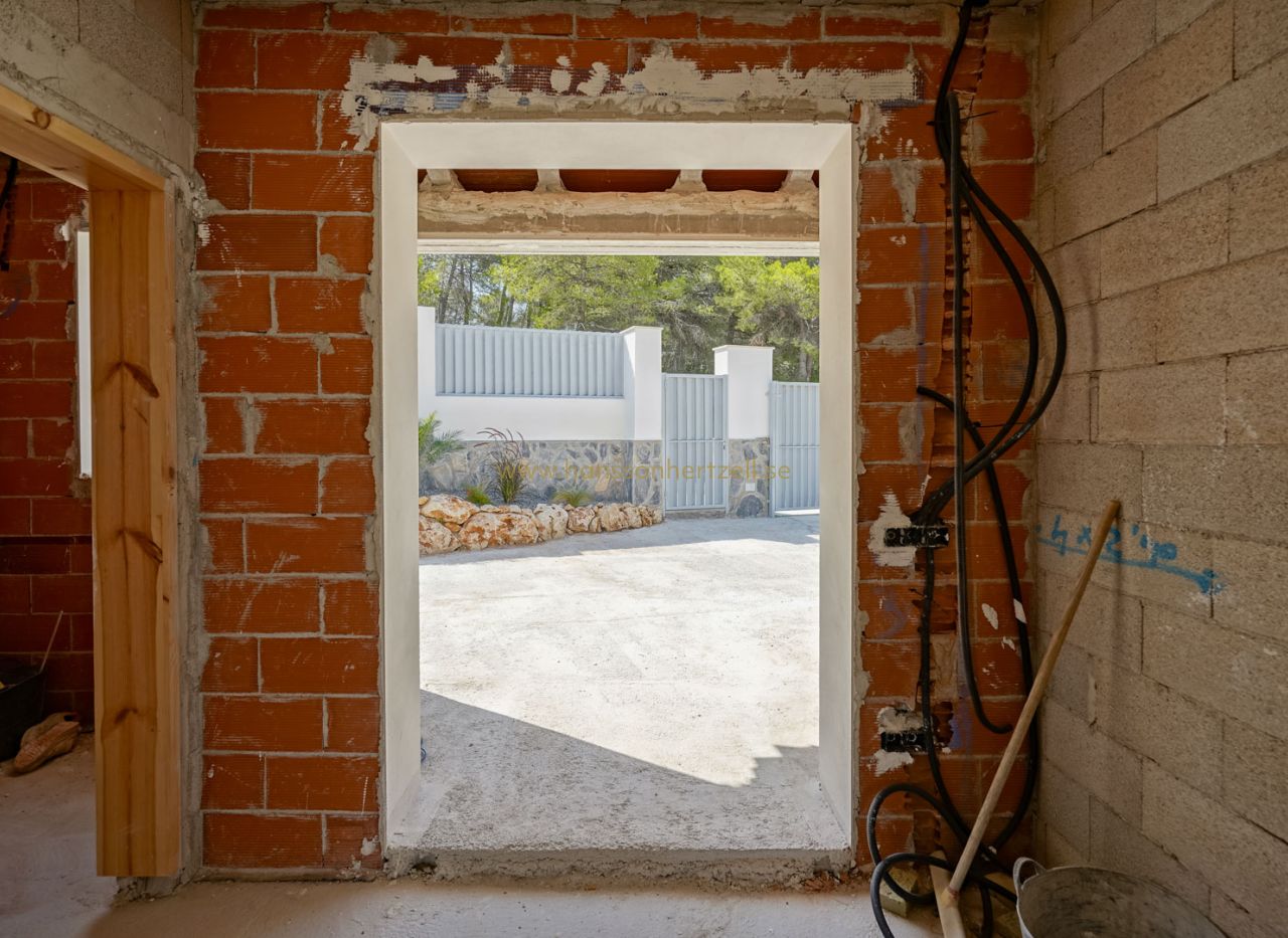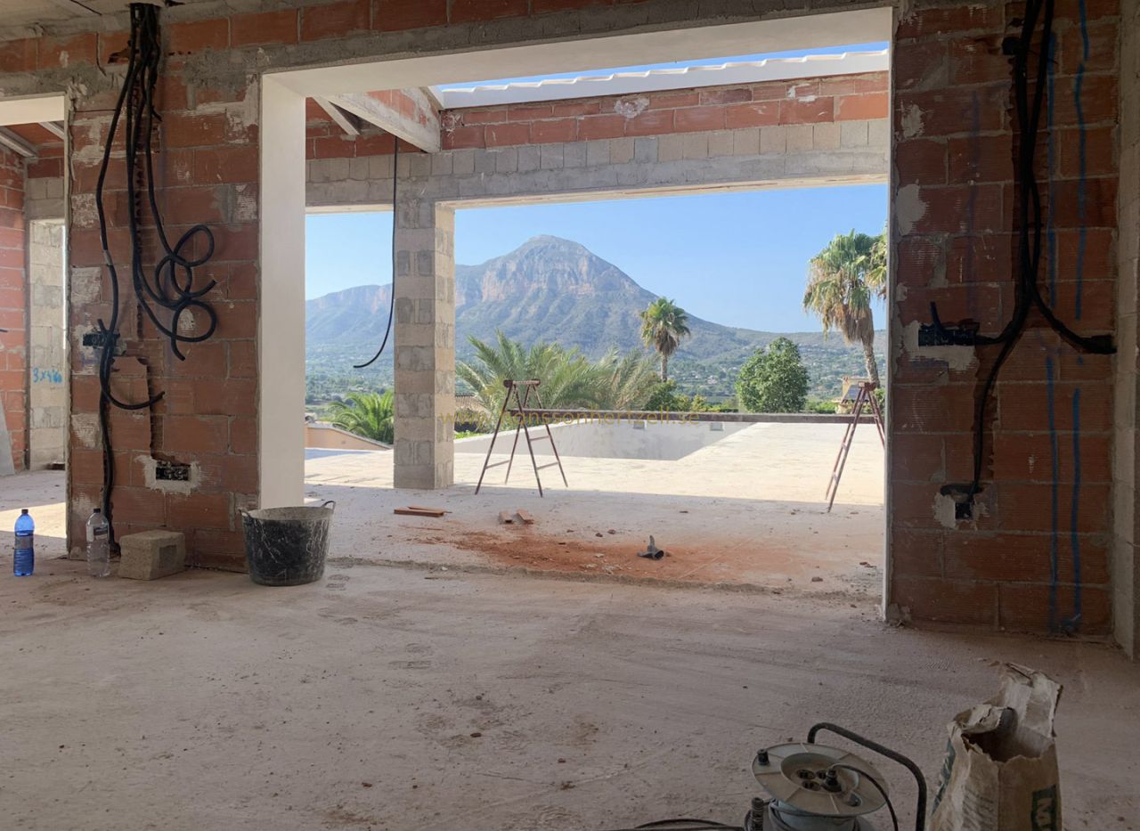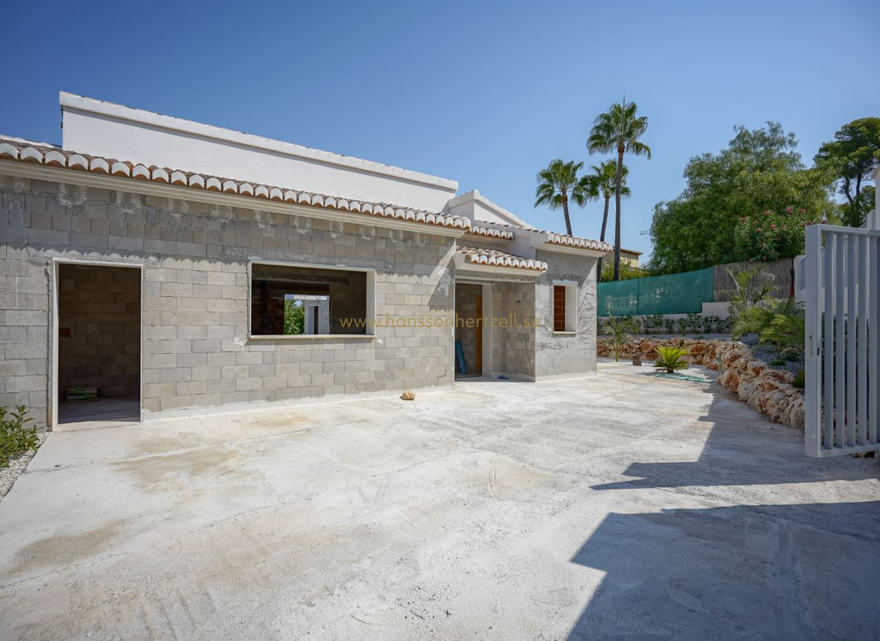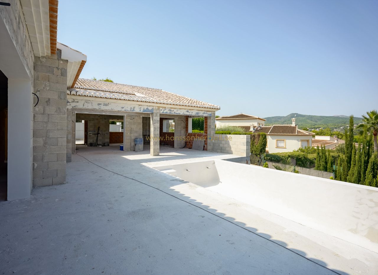 Beautiful traditional new build villa for sale in Jávea, This exclusive new build villa, located in the beautiful Piver urbanisation, offers beautifl views of the imposing Montgó and the mountainous interior. The villa is set on a spacious plot of 1,147.94 m2 and is designed entirely on one level for optimal comfort and accessibility. Upon entering, a stylish hall with guest toilet leads to the spacious living-dining room, where large windows provide abundant natural light and a beautiful panorama. Adjacent is a modern, fully equipped kitchen with a practical laundry room that offers direct access to the outside. Sliding windows in the living room open onto the inviting terrace with swimming pool, ideal for enjoying the view and the Mediterranean climate. The sleeping area comprises three bedrooms, including an elegant master bedroom with en-suite bathroom and direct access to the terrace, while the two other bedrooms share a second bathroom. The outdoor area is an oasis of tranquillity with a covered terrace, a pergola, a spacious sun terrace and a low-maintenance Mediterranean garden. With two parking spaces on site and a location just 2 km from the historic centre and 3 km from the coast, this villa combines luxury, privacy and excellent accessibility. The villa is currently under construction and is scheduled for completion at the end of 2025 (subject to change).