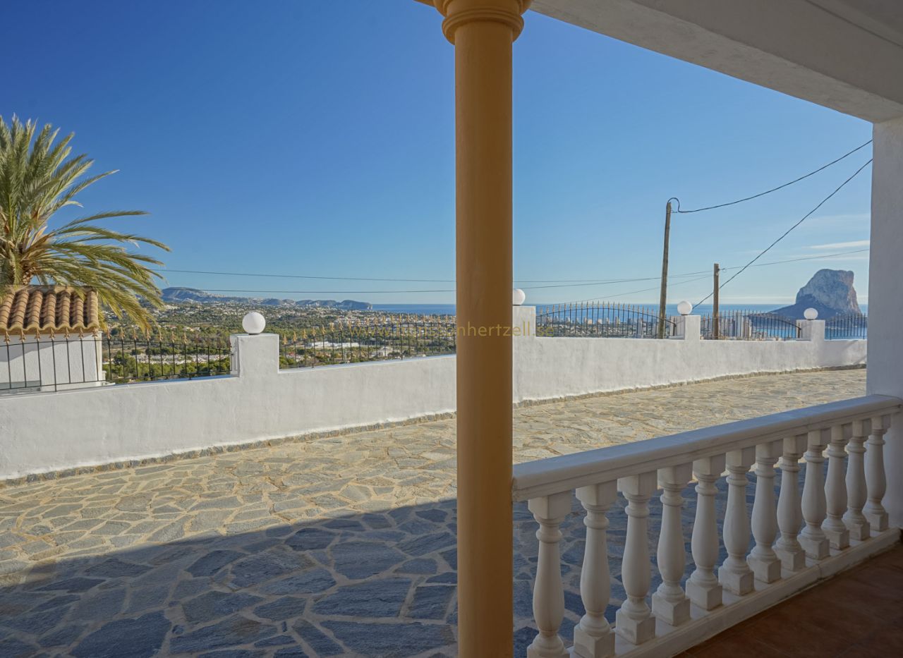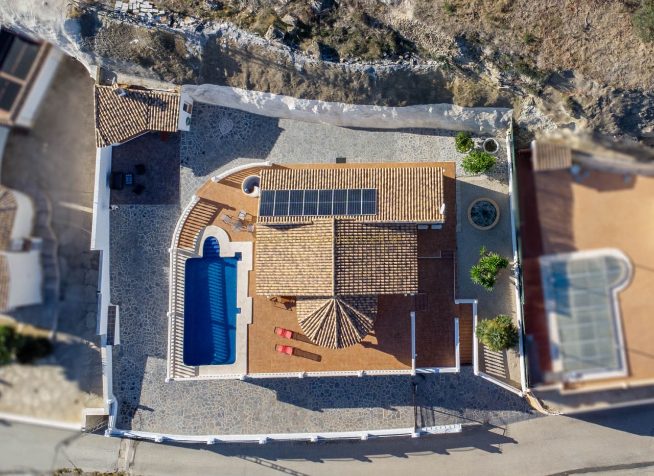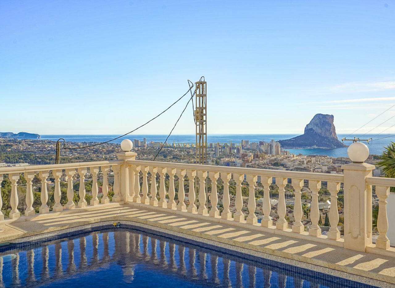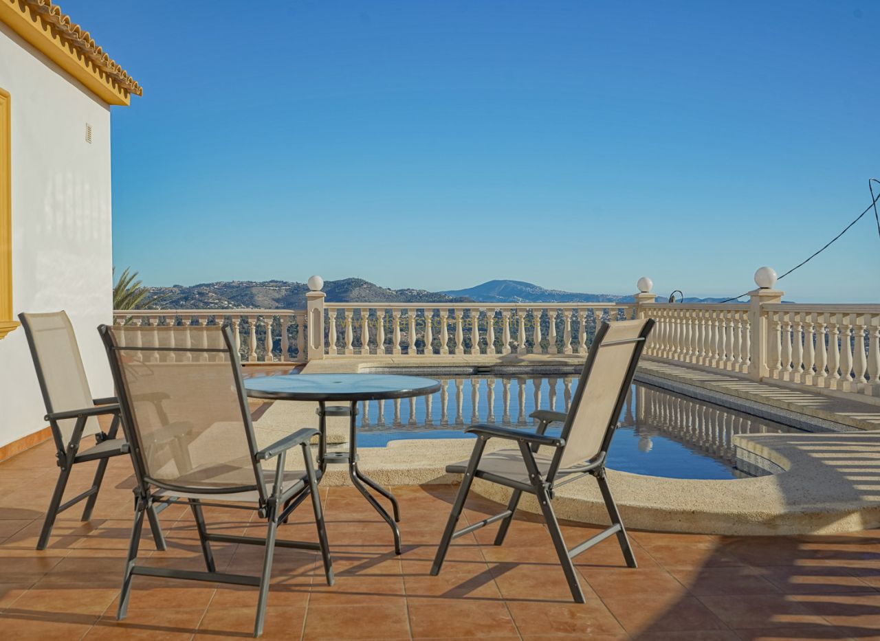 Traditional villa with spacious guest accommodation and panoramic sea views for sale in Partida Cucarres, This charming villa is located on the quiet eastern slope of the impressive Sierra de Oltà mountain range. Thanks to its elevated position, you can enjoy truly breathtaking panoramic views of the Mediterranean coastline, stretching from Cap d’Or in Moraira to beyond the iconic Peñón de Ifach in Calpe. The property also offers beautiful views of Calpe’s skyline, the vast inland area reaching towards the Montgó in Jávea, and of course the nearby Sierra de Oltà with its striking rock formations and deep green forests. Despite the exceptional views, the villa is situated just a short distance from the centre of Calpe, where you will find all amenities, beaches, and restaurants. The villa is divided over two separate floors. The main residence is on the lower floor and consists of a living-dining room, a semi-open kitchen, a master bedroom with en-suite bathroom, and a second bedroom with a separate bathroom. From the living room there is direct access to the covered terrace, while from the kitchen you reach the sunny south terrace. The semi-basement contains a fully independent guest apartment with a living room, an open kitchen, and two spacious bedrooms, each with an en-suite bathroom. The property is equipped with recently installed air conditioning (2021), central heating via radiators, built-in wardrobes, shutters, and photovoltaic panels. The villa also features a spacious garage, a storage room, and multiple parking spaces. Outside, next to the pool, you will find a generous terrace with an outdoor shower and a covered summer kitchen. On the north side of the villa there is also a large terrace, ensuring you can always find a pleasant shaded spot during warmer days. An ideal property for those looking to combine peace, wide-open views, and proximity to lively Calpe.