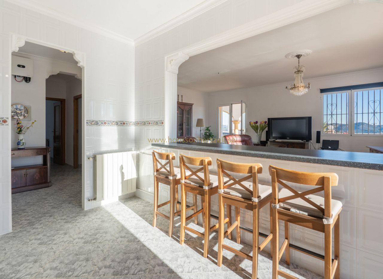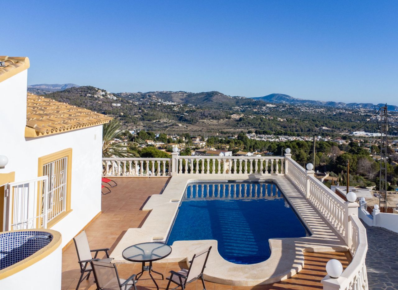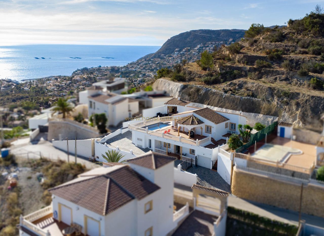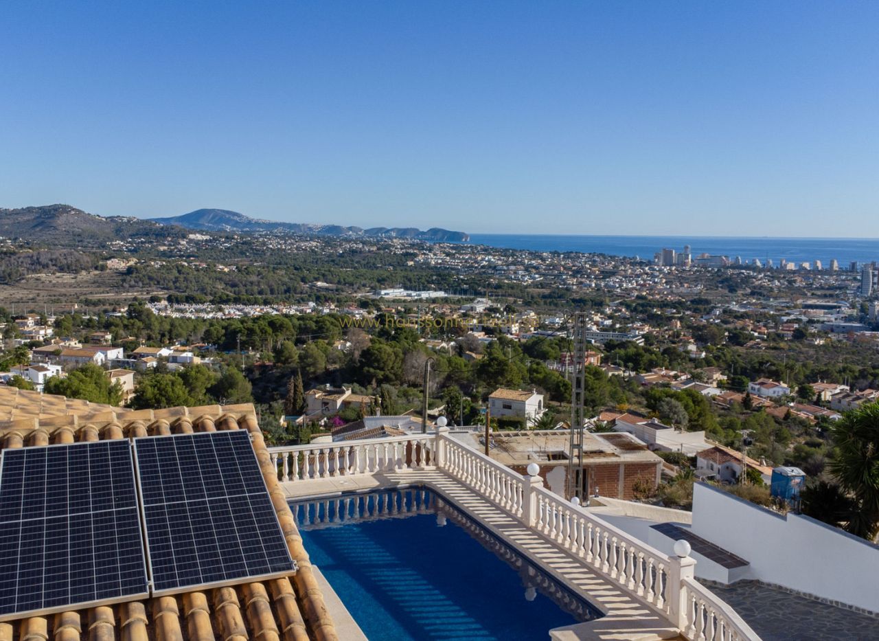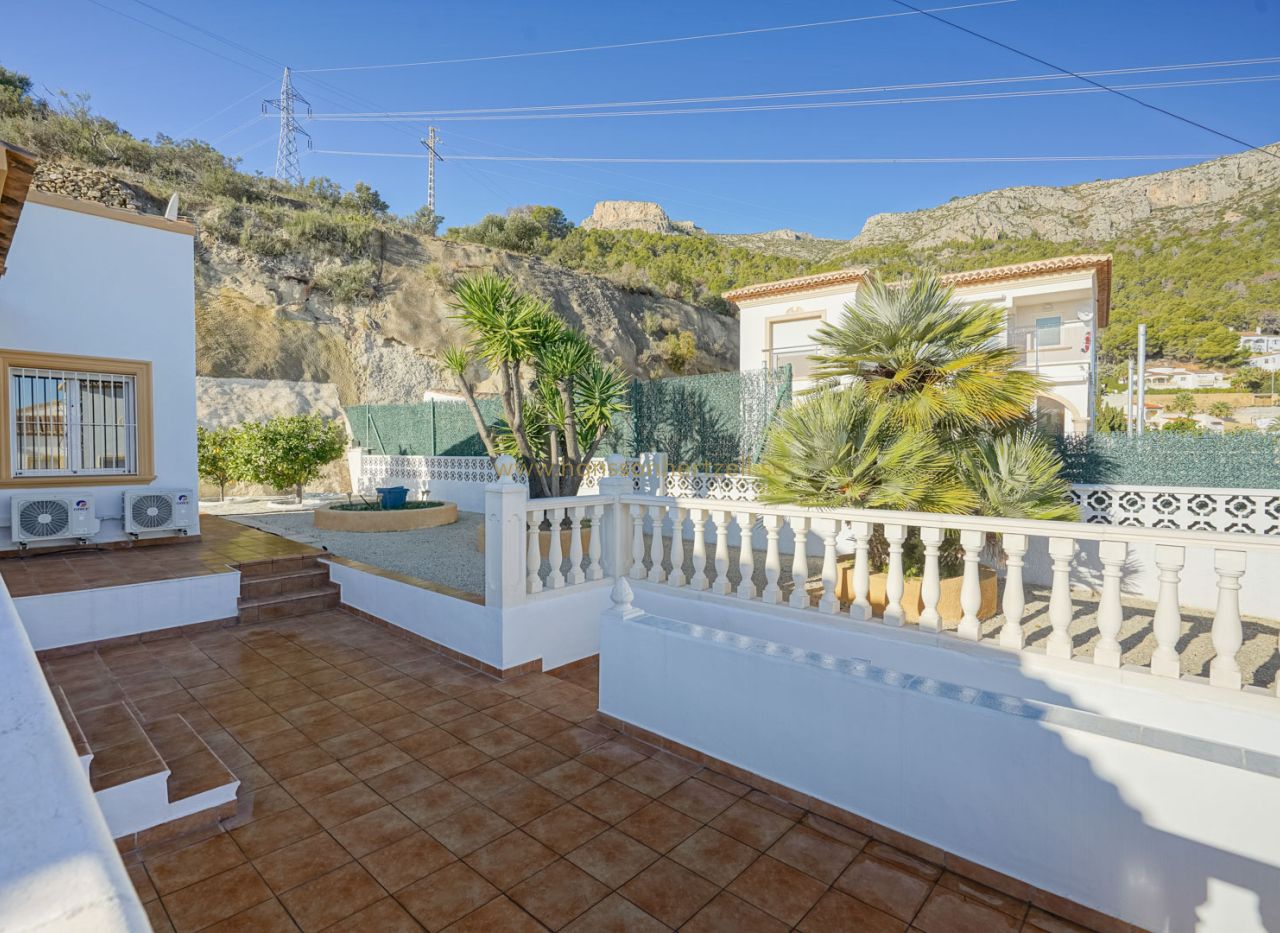 Traditional villa with spacious guest accommodation and panoramic sea views for sale in Partida Cucarres, This charming villa is located on the quiet eastern slope of the impressive Sierra de Oltà mountain range. Thanks to its elevated position, you can enjoy truly breathtaking panoramic views of the Mediterranean coastline, stretching from Cap d’Or in Moraira to beyond the iconic Peñón de Ifach in Calpe. The property also offers beautiful views of Calpe’s skyline, the vast inland area reaching towards the Montgó in Jávea, and of course the nearby Sierra de Oltà with its striking rock formations and deep green forests. Despite the exceptional views, the villa is situated just a short distance from the centre of Calpe, where you will find all amenities, beaches, and restaurants. The villa is divided over two separate floors. The main residence is on the lower floor and consists of a living-dining room, a semi-open kitchen, a master bedroom with en-suite bathroom, and a second bedroom with a separate bathroom. From the living room there is direct access to the covered terrace, while from the kitchen you reach the sunny south terrace. The semi-basement contains a fully independent guest apartment with a living room, an open kitchen, and two spacious bedrooms, each with an en-suite bathroom. The property is equipped with recently installed air conditioning (2021), central heating via radiators, built-in wardrobes, shutters, and photovoltaic panels. The villa also features a spacious garage, a storage room, and multiple parking spaces. Outside, next to the pool, you will find a generous terrace with an outdoor shower and a covered summer kitchen. On the north side of the villa there is also a large terrace, ensuring you can always find a pleasant shaded spot during warmer days. An ideal property for those looking to combine peace, wide-open views, and proximity to lively Calpe.