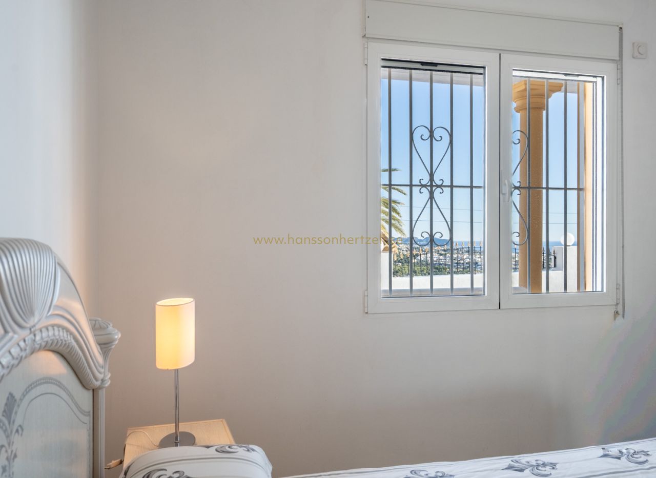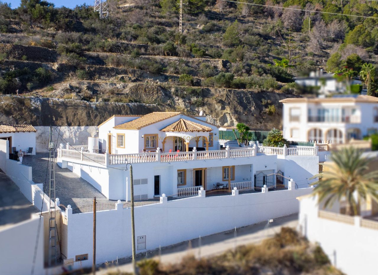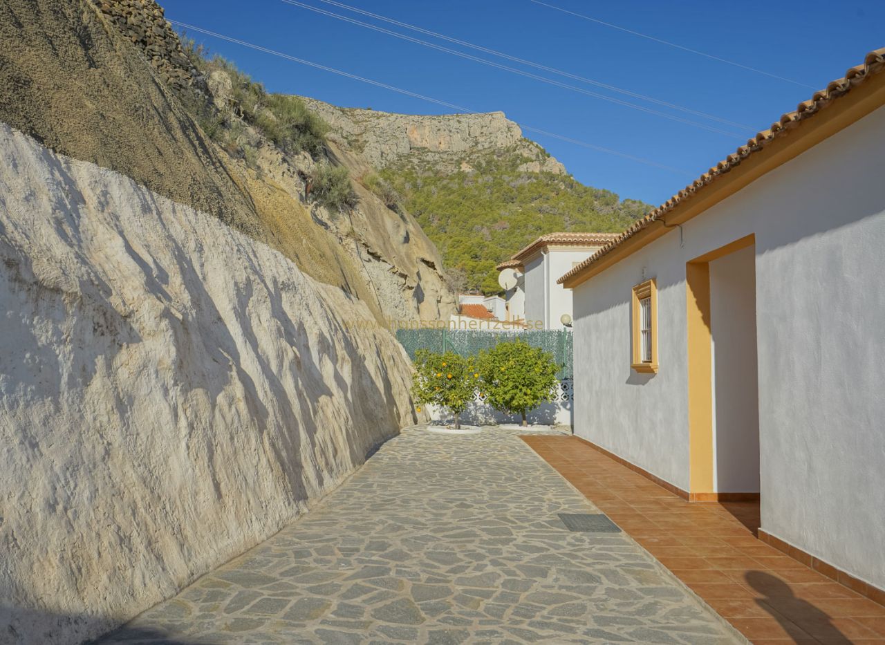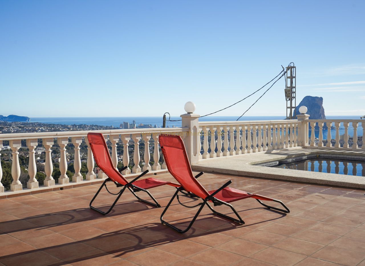 Traditional villa with spacious guest accommodation and panoramic sea views for sale in Partida Cucarres, This charming villa is located on the quiet eastern slope of the impressive Sierra de Oltà mountain range. Thanks to its elevated position, you can enjoy truly breathtaking panoramic views of the Mediterranean coastline, stretching from Cap d’Or in Moraira to beyond the iconic Peñón de Ifach in Calpe. The property also offers beautiful views of Calpe’s skyline, the vast inland area reaching towards the Montgó in Jávea, and of course the nearby Sierra de Oltà with its striking rock formations and deep green forests. Despite the exceptional views, the villa is situated just a short distance from the centre of Calpe, where you will find all amenities, beaches, and restaurants. The villa is divided over two separate floors. The main residence is on the lower floor and consists of a living-dining room, a semi-open kitchen, a master bedroom with en-suite bathroom, and a second bedroom with a separate bathroom. From the living room there is direct access to the covered terrace, while from the kitchen you reach the sunny south terrace. The semi-basement contains a fully independent guest apartment with a living room, an open kitchen, and two spacious bedrooms, each with an en-suite bathroom. The property is equipped with recently installed air conditioning (2021), central heating via radiators, built-in wardrobes, shutters, and photovoltaic panels. The villa also features a spacious garage, a storage room, and multiple parking spaces. Outside, next to the pool, you will find a generous terrace with an outdoor shower and a covered summer kitchen. On the north side of the villa there is also a large terrace, ensuring you can always find a pleasant shaded spot during warmer days. An ideal property for those looking to combine peace, wide-open views, and proximity to lively Calpe.