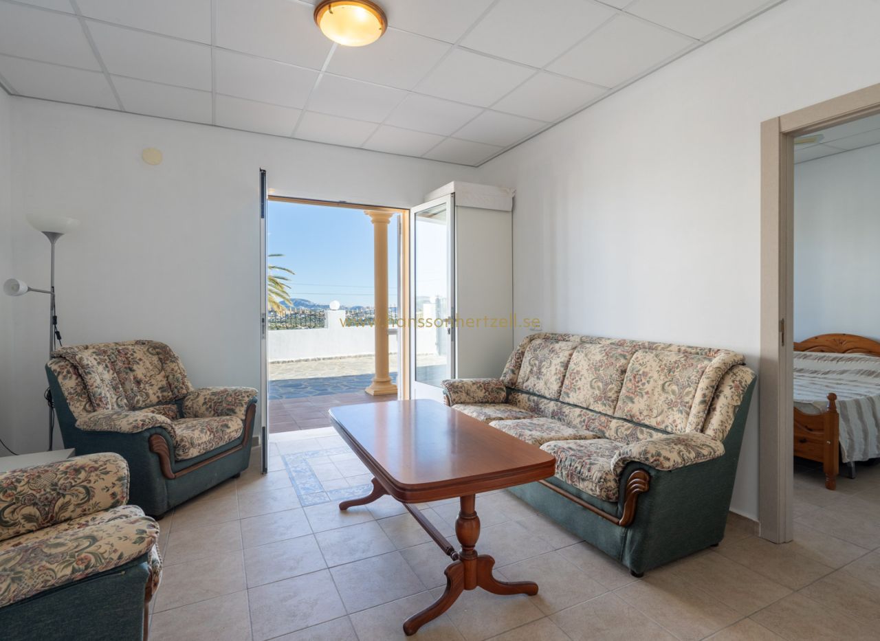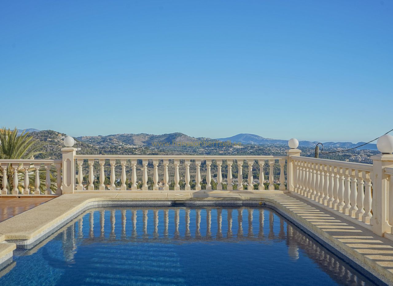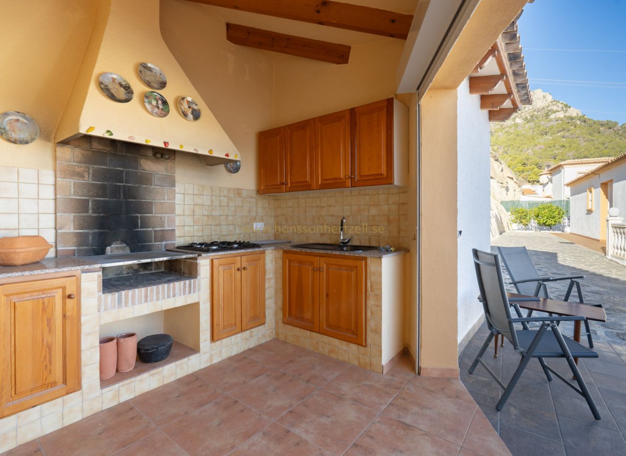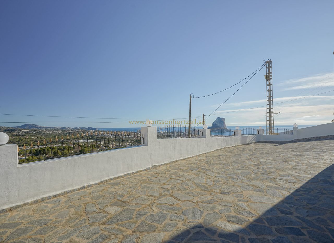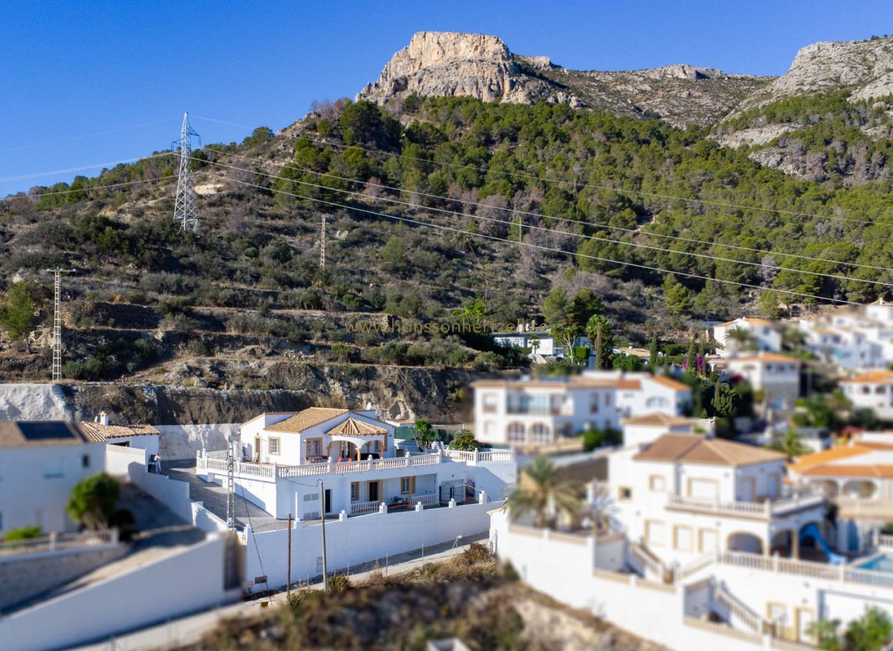 Traditional villa with spacious guest accommodation and panoramic sea views for sale in Partida Cucarres, This charming villa is located on the quiet eastern slope of the impressive Sierra de Oltà mountain range. Thanks to its elevated position, you can enjoy truly breathtaking panoramic views of the Mediterranean coastline, stretching from Cap d’Or in Moraira to beyond the iconic Peñón de Ifach in Calpe. The property also offers beautiful views of Calpe’s skyline, the vast inland area reaching towards the Montgó in Jávea, and of course the nearby Sierra de Oltà with its striking rock formations and deep green forests. Despite the exceptional views, the villa is situated just a short distance from the centre of Calpe, where you will find all amenities, beaches, and restaurants. The villa is divided over two separate floors. The main residence is on the lower floor and consists of a living-dining room, a semi-open kitchen, a master bedroom with en-suite bathroom, and a second bedroom with a separate bathroom. From the living room there is direct access to the covered terrace, while from the kitchen you reach the sunny south terrace. The semi-basement contains a fully independent guest apartment with a living room, an open kitchen, and two spacious bedrooms, each with an en-suite bathroom. The property is equipped with recently installed air conditioning (2021), central heating via radiators, built-in wardrobes, shutters, and photovoltaic panels. The villa also features a spacious garage, a storage room, and multiple parking spaces. Outside, next to the pool, you will find a generous terrace with an outdoor shower and a covered summer kitchen. On the north side of the villa there is also a large terrace, ensuring you can always find a pleasant shaded spot during warmer days. An ideal property for those looking to combine peace, wide-open views, and proximity to lively Calpe.