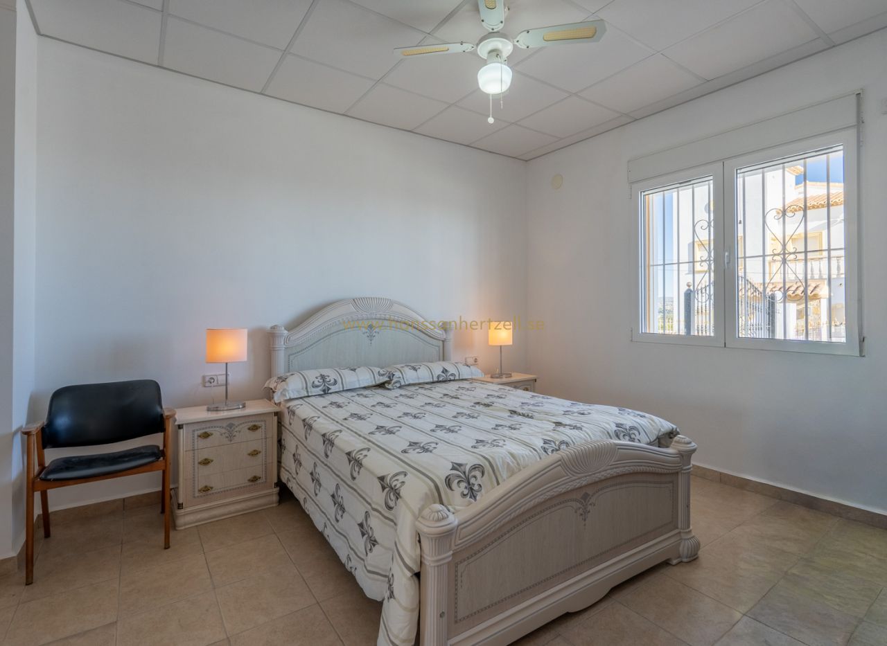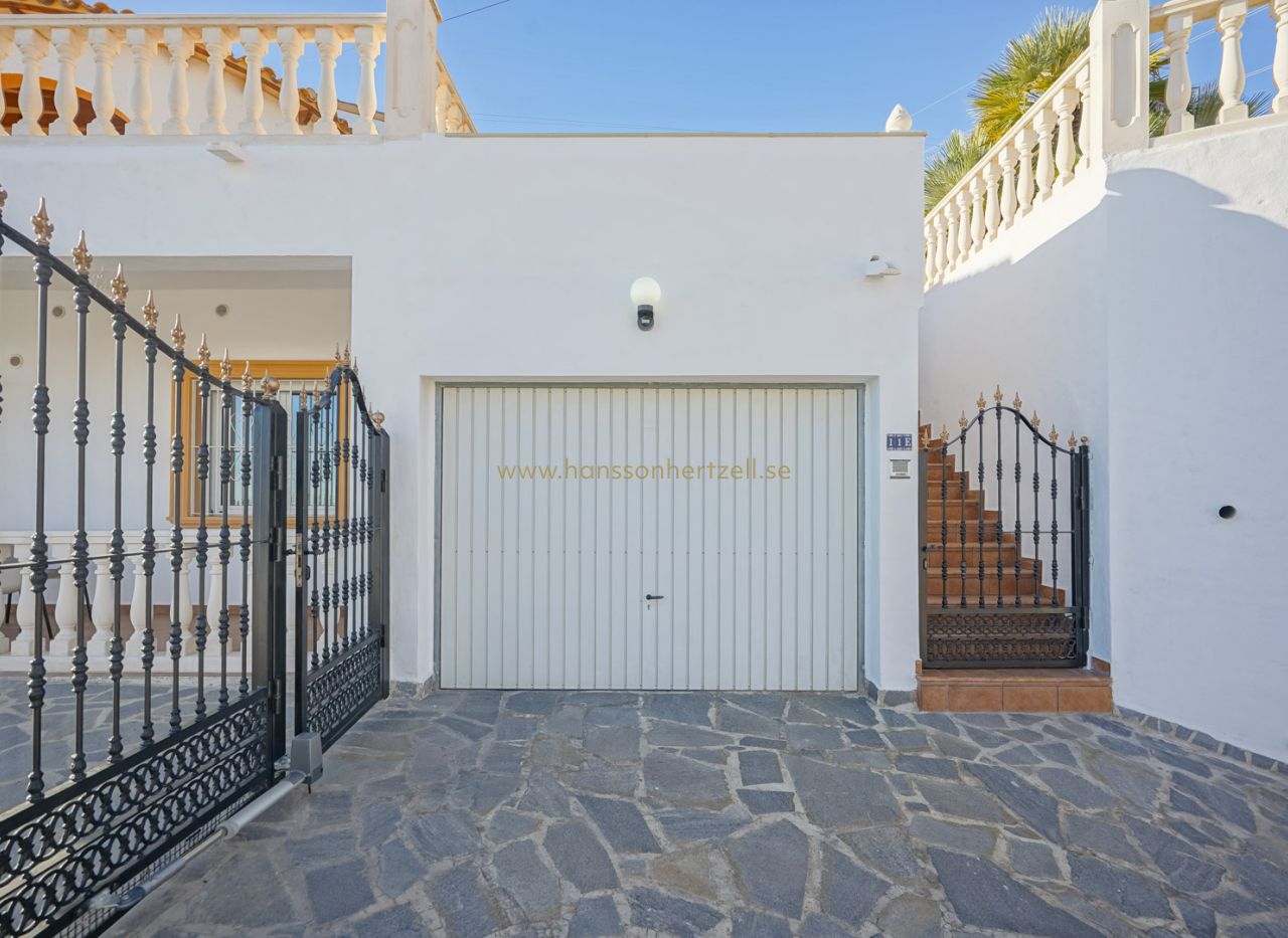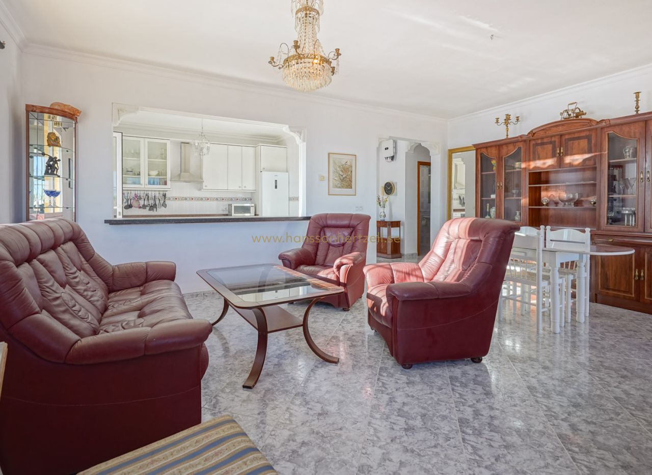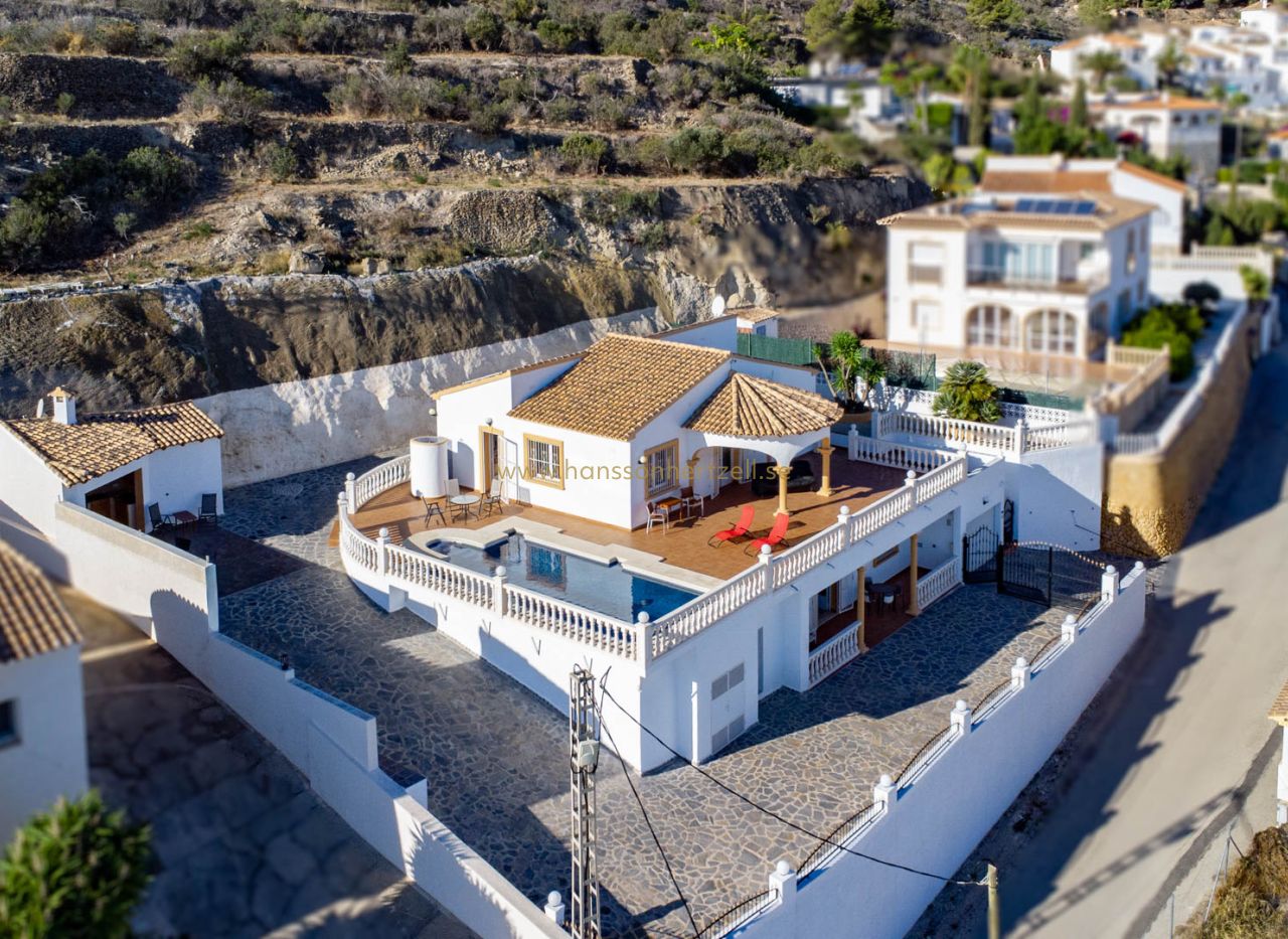 Traditional villa with spacious guest accommodation and panoramic sea views for sale in Partida Cucarres, This charming villa is located on the quiet eastern slope of the impressive Sierra de Oltà mountain range. Thanks to its elevated position, you can enjoy truly breathtaking panoramic views of the Mediterranean coastline, stretching from Cap d’Or in Moraira to beyond the iconic Peñón de Ifach in Calpe. The property also offers beautiful views of Calpe’s skyline, the vast inland area reaching towards the Montgó in Jávea, and of course the nearby Sierra de Oltà with its striking rock formations and deep green forests. Despite the exceptional views, the villa is situated just a short distance from the centre of Calpe, where you will find all amenities, beaches, and restaurants. The villa is divided over two separate floors. The main residence is on the lower floor and consists of a living-dining room, a semi-open kitchen, a master bedroom with en-suite bathroom, and a second bedroom with a separate bathroom. From the living room there is direct access to the covered terrace, while from the kitchen you reach the sunny south terrace. The semi-basement contains a fully independent guest apartment with a living room, an open kitchen, and two spacious bedrooms, each with an en-suite bathroom. The property is equipped with recently installed air conditioning (2021), central heating via radiators, built-in wardrobes, shutters, and photovoltaic panels. The villa also features a spacious garage, a storage room, and multiple parking spaces. Outside, next to the pool, you will find a generous terrace with an outdoor shower and a covered summer kitchen. On the north side of the villa there is also a large terrace, ensuring you can always find a pleasant shaded spot during warmer days. An ideal property for those looking to combine peace, wide-open views, and proximity to lively Calpe.