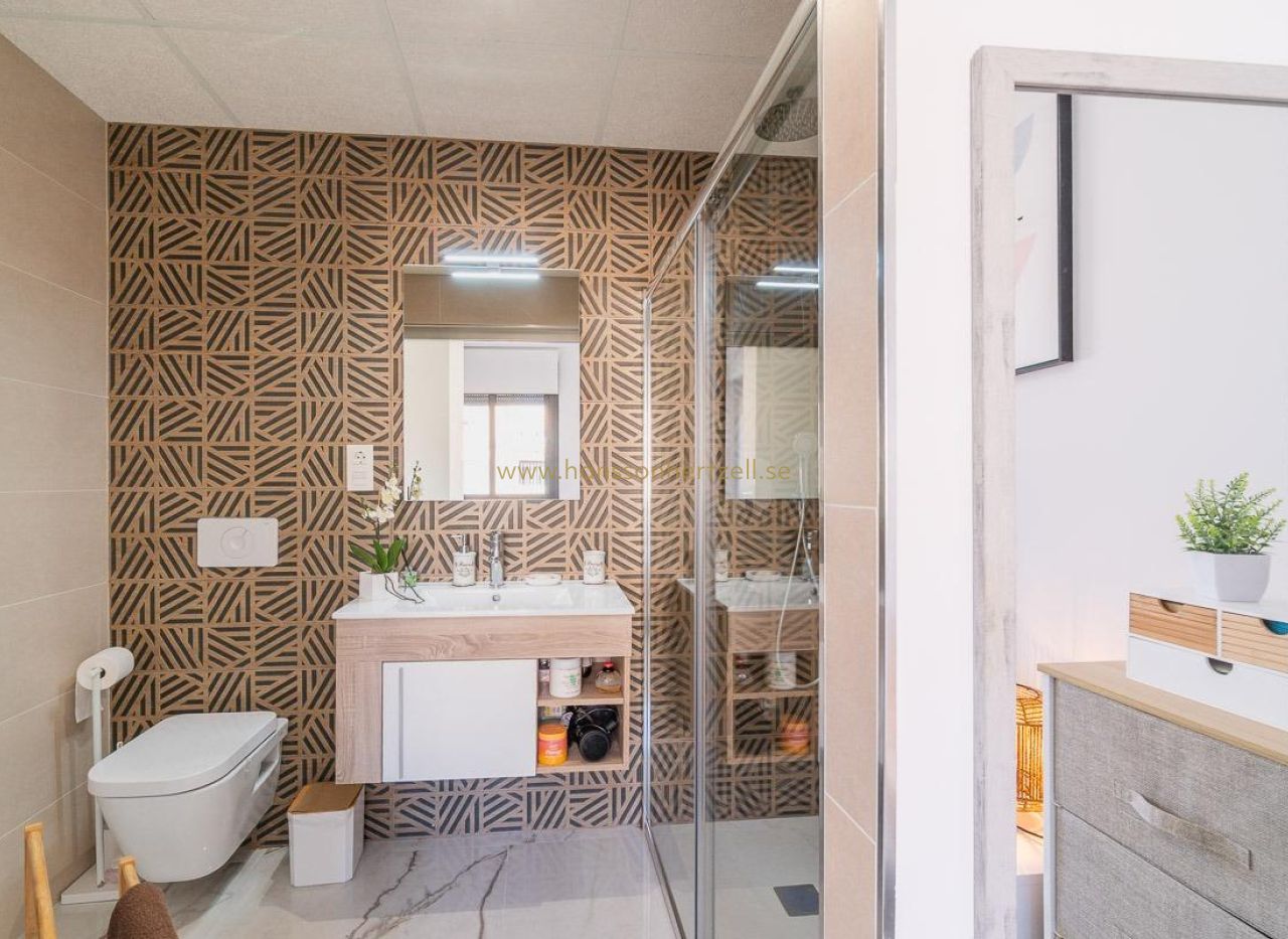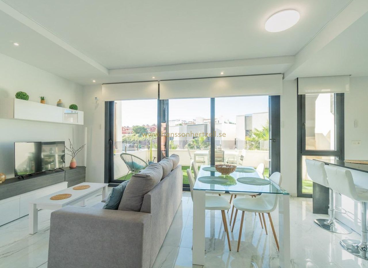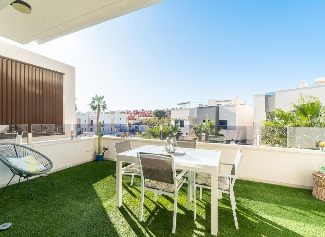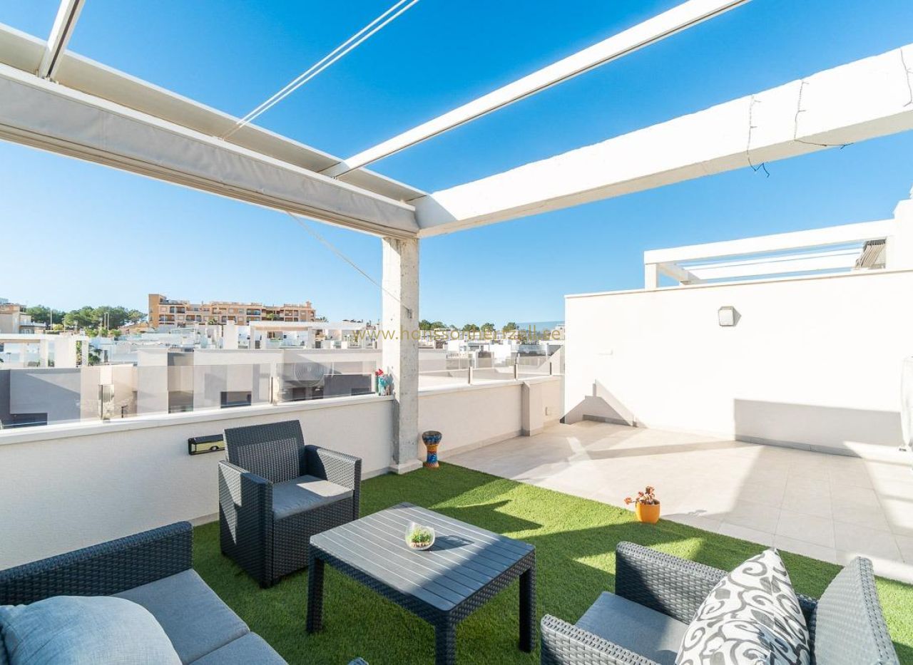 Discover this spectacular top-floor bungalow located in the prestigious PAU 26 area of Orihuela Costa, a privileged enclave where modern design, comfort, and quality of life come together.~~This nearly new property, built in 2022, offers 76 m2 of constructed area, a functional layout, and an excellent south-facing orientation, ensuring natural light throughout the day.~~From the street, you enter a private and exclusive residential complex with only 24 neighbors, guaranteeing peace, privacy, and a select atmosphere. Upon entering the home, you are welcomed by a bright and spacious living-dining area with a modern open-plan kitchen. From the living room, there is access to a 12 m2 balcony, equipped with an electric awning and artificial grass, perfect for enjoying outdoor living all year round thanks to its sunny orientation.~The property also features a laundry area, two spacious double bedrooms, and two full bathrooms, both with underfloor heating, offering exceptional comfort.~~From the balcony, a private staircase leads to the highlight of the property: an impressive private solarium of approximately 71 m2, finished with artificial grass and awnings, creating the perfect space for a private chill-out area, entertaining guests, or relaxing under the Mediterranean sun.~~Additional features include porcelain flooring, mosquito screens on all windows, security entrance door, electric awning on the balcony, and a manual awning on the solarium pergola, all designed to maximize comfort and functionality.~~The property is sold with a private parking space and a closed storage room, providing extra convenience and storage.~~The residential complex offers a beautiful communal swimming pool, immaculately maintained green areas, and high-quality communal spaces, making it a true luxury environment.~~Located just 3.5 km from the sea, the property is close to some of the most renowned beaches in Orihuela Costa, such as La Zenia and Playa Flamenca, famous for their crystal-clear waters and excellent services.~~Its proximity to prestigious golf courses makes this home a highly sought-after holiday rental investment with excellent rental potential.~~ A property designed to offer exclusivity, comfort, and an exceptional Mediterranean lifestyle.~A unique opportunity not to be missed. Contact us today.~Price: €325,000~Taxes and purchase costs not included (according to applicable regulations). A breakdown of additional costs will be provided prior to reservation.