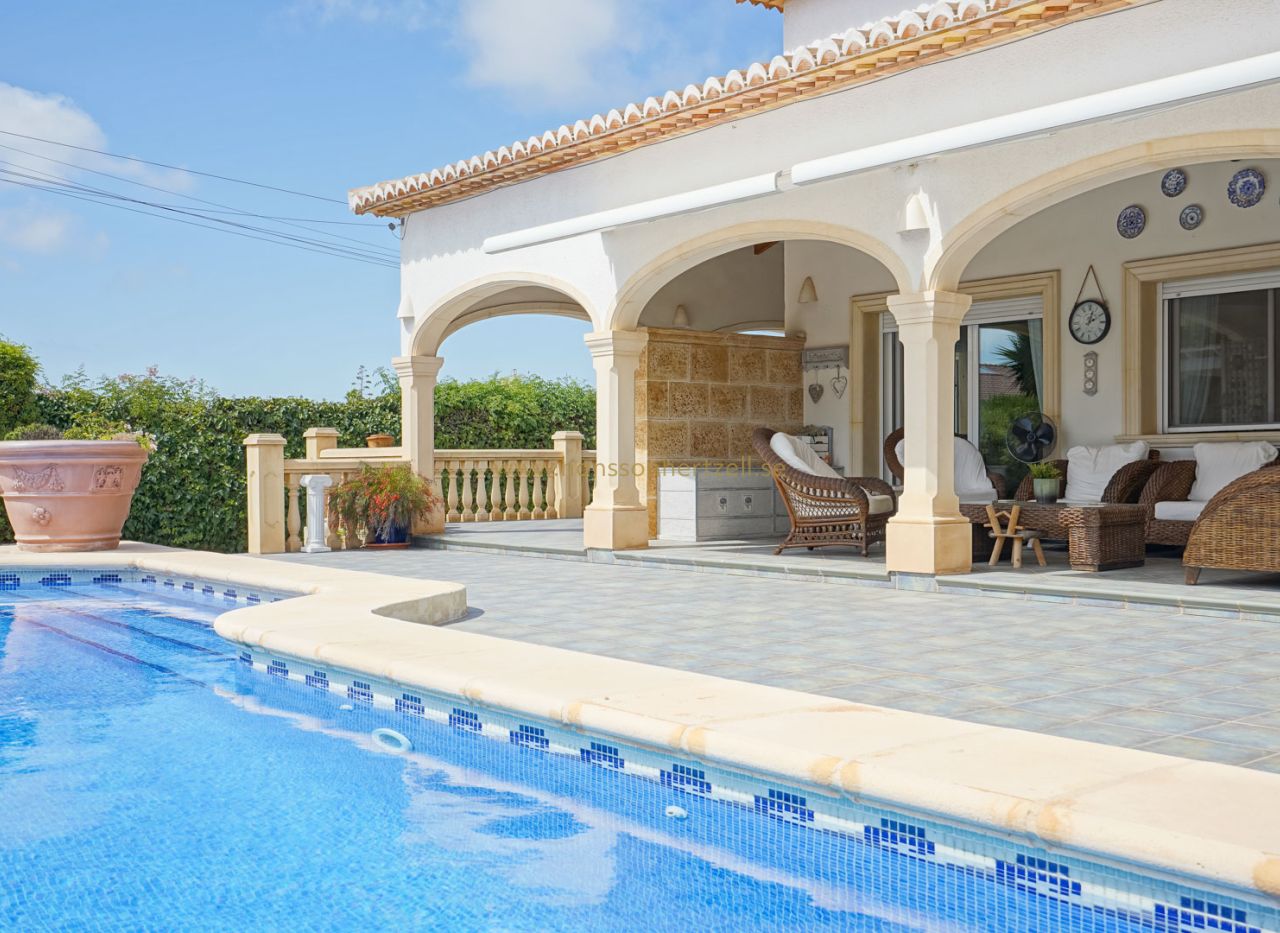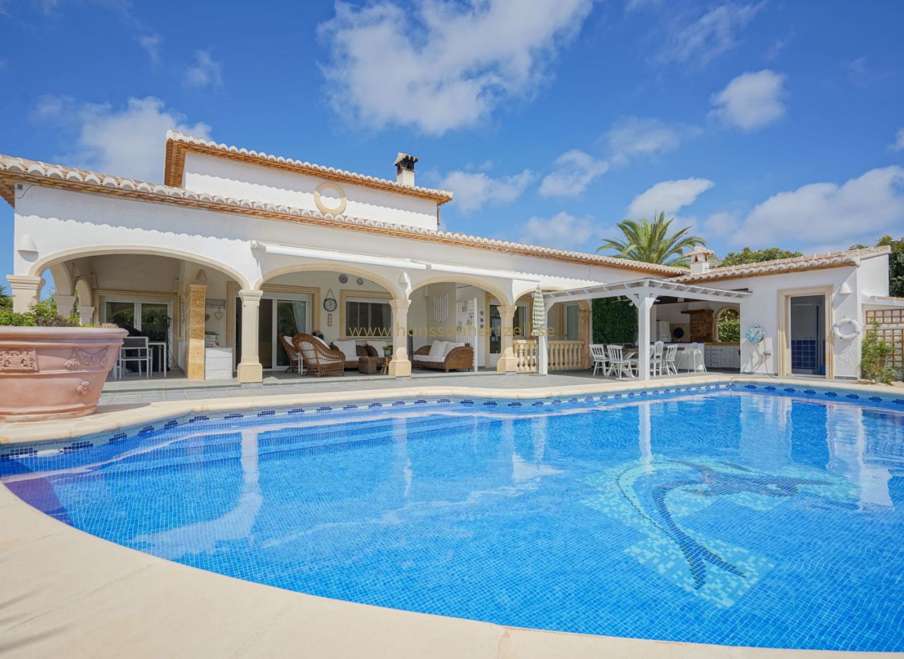 Villa tradicional en venta en Costa Nova. Esta villa de una sola planta con tres dormitorios está situada en una parcela llana en la encantadora Costa Nova, a poca distancia a pie de varios restaurantes, bares acogedores e instalaciones deportivas. Unos pocos escalones le llevan al porche de la puerta principal y a un amplio vestíbulo. Desde el vestíbulo se accede a la amplia cocina abierta con comedor contiguo. Junto al comedor hay un amplio salón con chimenea. Además, la villa cuenta con un dormitorio principal con baño en suite y dos dormitorios con baño compartido. Todos los dormitorios disponen de armarios empotrados, persianas y aire acondicionado. Además, la villa cuenta con calefacción por suelo radiante y chimenea. En el exterior hay una amplia terraza cubierta tanto en el lado sur como en el oeste de la villa. Además, hay una gran piscina y una cocina al aire libre. La villa está rodeada por un jardín mediterráneo maduro y cuenta con varias plazas de aparcamiento, una cochera y un trastero. Costa Nova es una tranquila urbanización residencial situada al sur de Jávea, conocida por su proximidad a algunas de las calas más bonitas y vírgenes de la Costa Blanca. A solo unos minutos en coche, o incluso a poca distancia a pie, se encuentran Cala Portitxol (La Barraca), Cala Ambolo, Cala Granadella y Cala Sardinera. Estas pequeñas e idílicas playas se caracterizan por sus aguas cristalinas, sus escarpados acantilados y su entorno natural, perfecto para nadar, bucear o practicar kayak. Una preciosa villa en una ubicación privilegiada. Solicite su visita ahora.