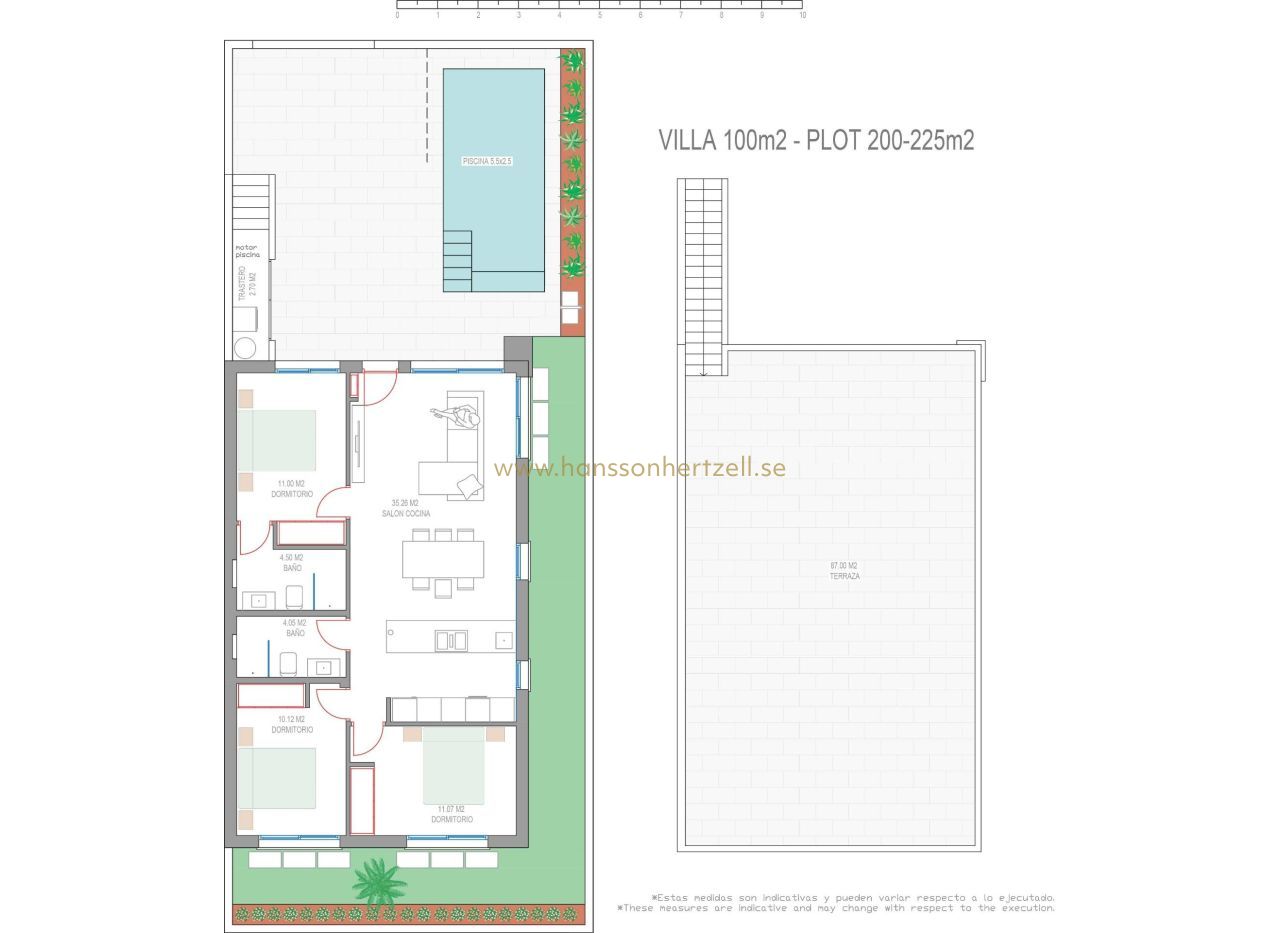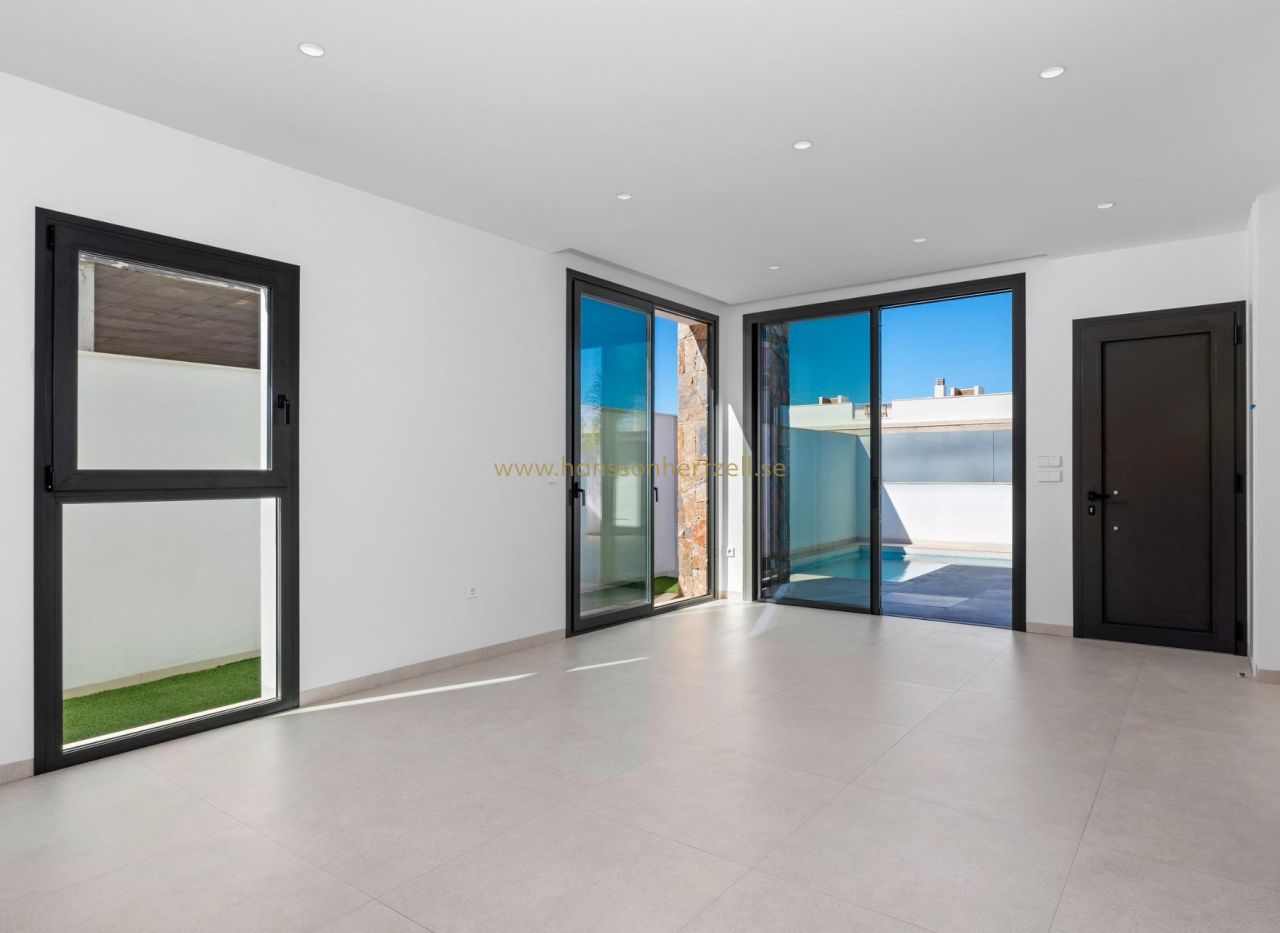 VILLAS PAREADAS DE OBRA NUEVA EN SAN JAVIER Residencial de obra nueva de villas independientes y pareadas en San Javier. Villas construidas en 1 planta y consta de 3 dormitorios, 2 baños, cocina americana, el salón con vistas abiertas a la terraza, solarium, jardín privado con la piscina. Cocina totalmente amueblada en color blanco brillo o madera incluye Placa de inducción con extractor integrado, horno, microondas, lavadora, frigorífico integrado y lavavajillas integrado. Instalación completa de Aire Acondicionado por conductos. La piscina tiene preinstalación para bomba de calor. San Javier está cerca de todos los servicios con fácil acceso a la playa, deportes acuáticos, tiendas y la red de transporte. Aquí se puede disfrutar de todas las instalaciones que San Javier tiene para ofrecer, como las tiendas locales, bares y restaurantes, así como estar cerca de centros comerciales, el aeropuerto de Murcia y todos los hermosos lugares que se encuentran a lo largo del Mar Menor. El aeropuerto de Corvera/Murcia está a 30 minutos y el aeropuerto de Alicante a 45 minutos.