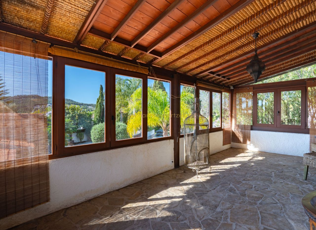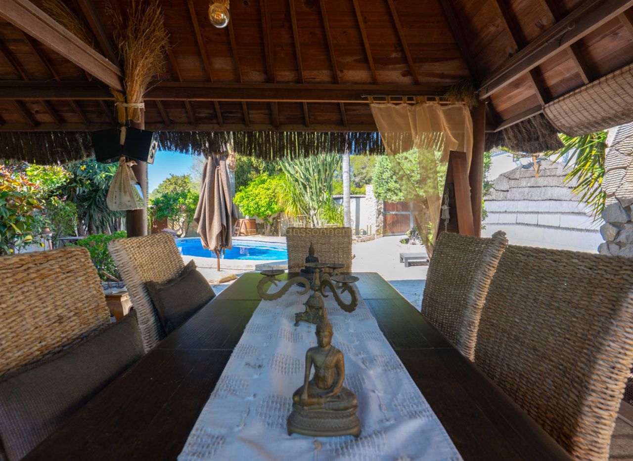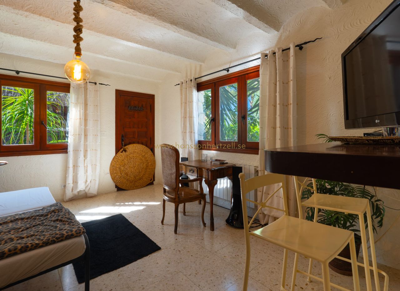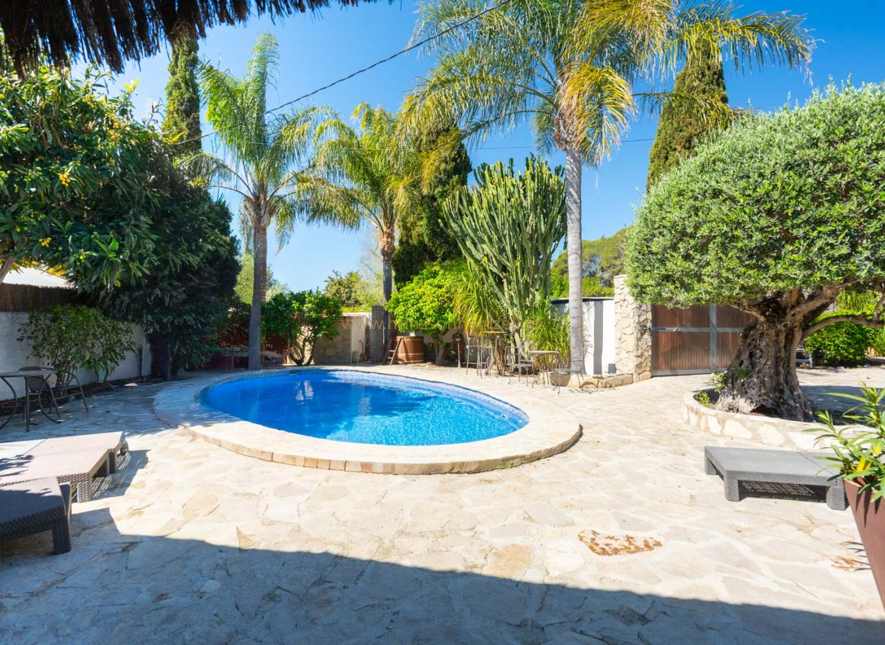 Esta encantadora villa rústica se encuentra al final de una calle sin salida y ofrece un auténtico oasis de tranquilidad, privacidad y naturaleza, con todos los servicios a corta distancia. La villa se sitúa en una parcela llana orientada al sur, con un precioso jardín mediterráneo que crea un ambiente cálido y relajante desde el primer momento. En el exterior encontrará varias terrazas con encanto, ideales para largas veladas de verano con familia y amigos, así como una amplia piscina con una elegante pérgola balinesa donde disfrutar del clima mediterráneo con total tranquilidad. La vivienda principal se distribuye en dos plantas y combina elementos con carácter con espacios confortables. Se accede a través de una amplia y acogedora naya con vistas al jardín, que conecta con el comedor con chimenea. Junto a este se encuentra la cocina, con acceso directo a un encantador patio, perfecto para cocinar y comer al aire libre. En la planta baja también hay un dormitorio y un baño. En la planta superior se encuentra un amplio dormitorio doble y una gran naya acristalada, ideal como espacio adicional de estar, oficina o zona de relax. Un gran valor añadido es la casa de invitados totalmente independiente con entrada propia. Este apartamento dispone de dos dormitorios, una cocina con barra y un baño, siendo perfecto para recibir a familiares y amigos. La propiedad cuenta además con lavadero, trastero y un carport. La ubicación hace que esta propiedad sea especialmente atractiva: una zona residencial tranquila con mucha privacidad, combinada con la cercanía al animado centro, restaurantes, tiendas y playas. Una oportunidad única para quienes buscan una vivienda mediterránea con encanto en una de las zonas más cotizadas de Jávea.