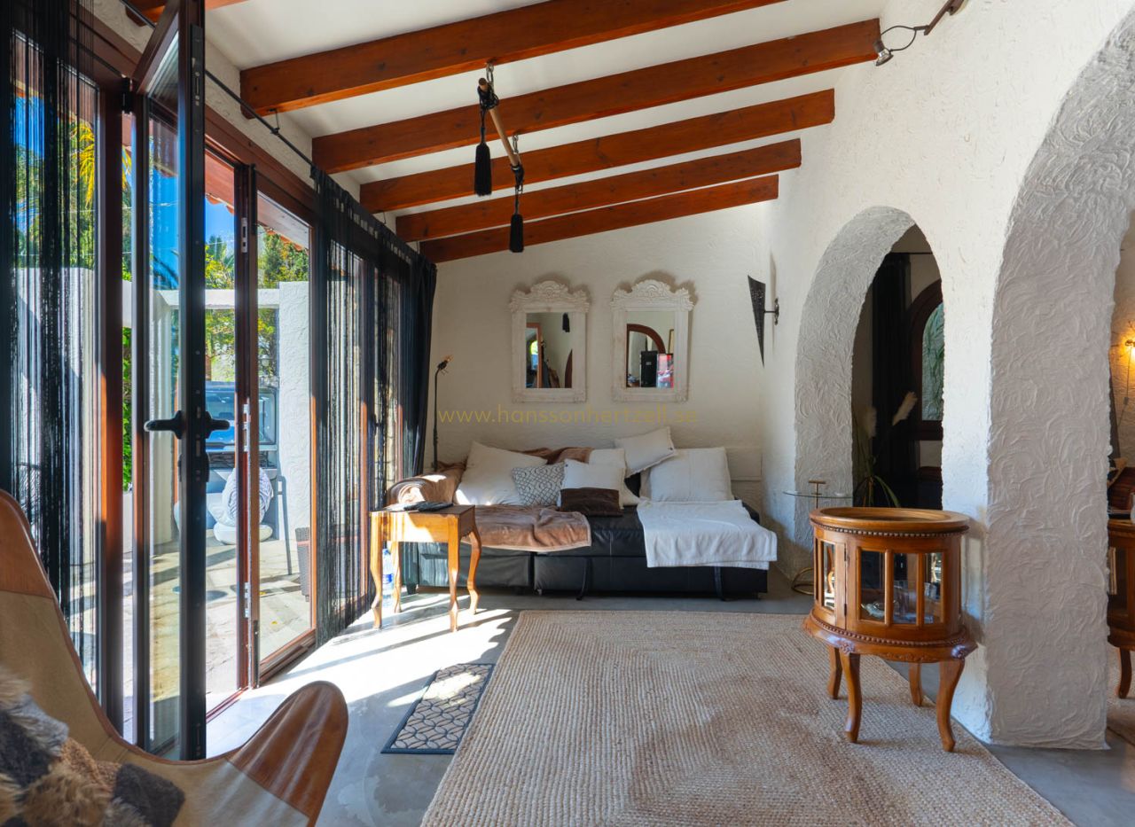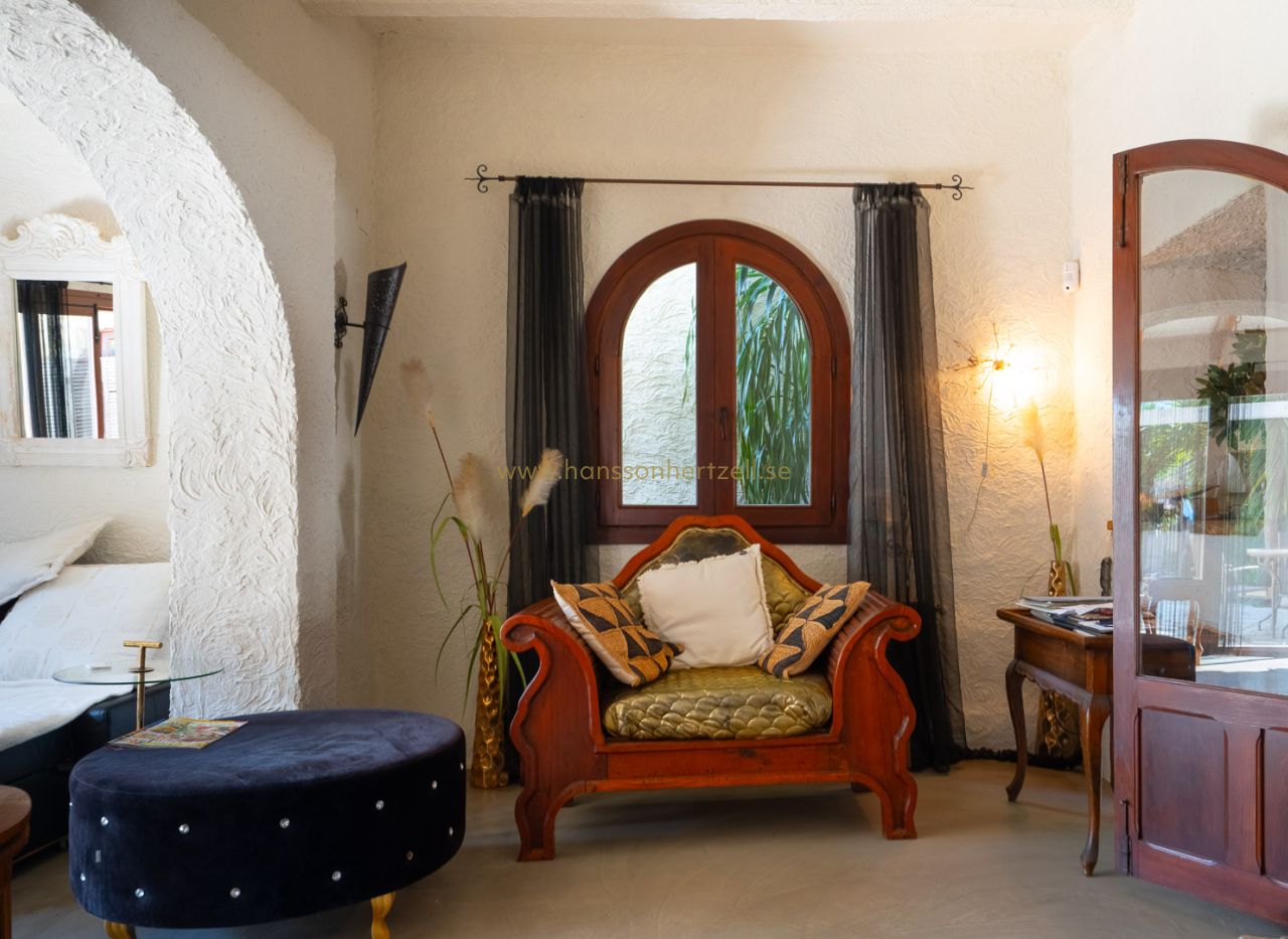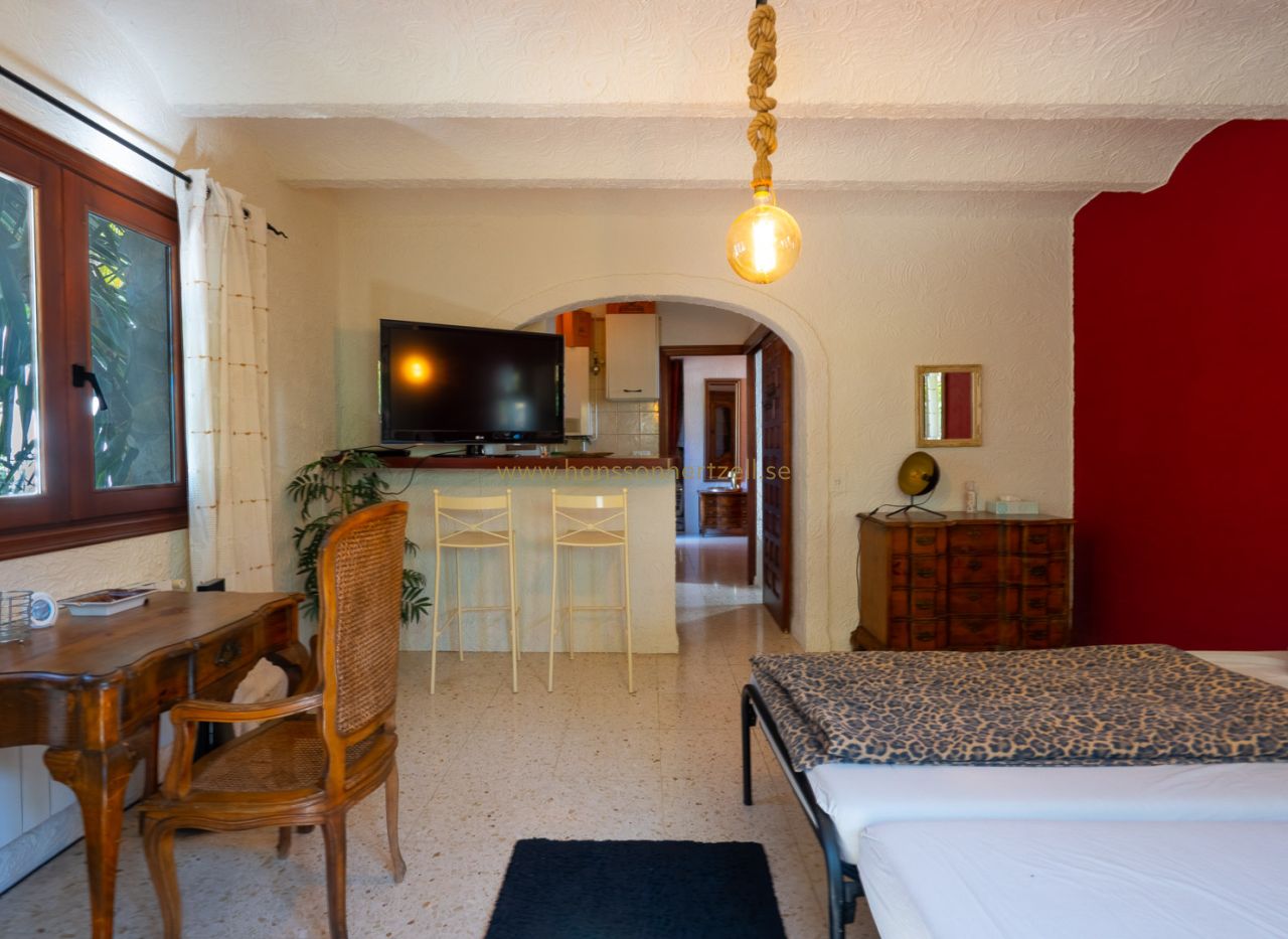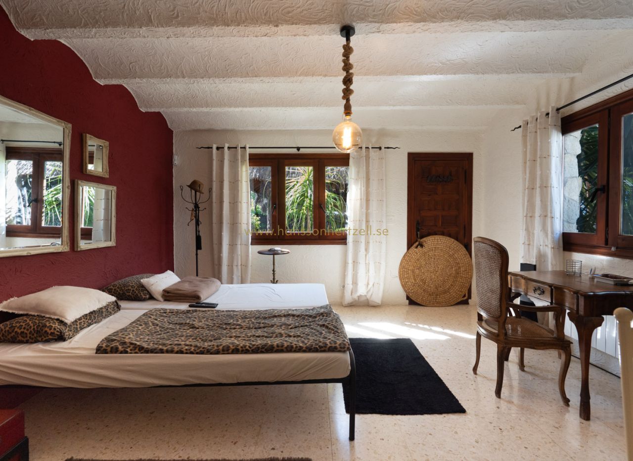 Esta encantadora villa rústica se encuentra al final de una calle sin salida y ofrece un auténtico oasis de tranquilidad, privacidad y naturaleza, con todos los servicios a corta distancia. La villa se sitúa en una parcela llana orientada al sur, con un precioso jardín mediterráneo que crea un ambiente cálido y relajante desde el primer momento. En el exterior encontrará varias terrazas con encanto, ideales para largas veladas de verano con familia y amigos, así como una amplia piscina con una elegante pérgola balinesa donde disfrutar del clima mediterráneo con total tranquilidad. La vivienda principal se distribuye en dos plantas y combina elementos con carácter con espacios confortables. Se accede a través de una amplia y acogedora naya con vistas al jardín, que conecta con el comedor con chimenea. Junto a este se encuentra la cocina, con acceso directo a un encantador patio, perfecto para cocinar y comer al aire libre. En la planta baja también hay un dormitorio y un baño. En la planta superior se encuentra un amplio dormitorio doble y una gran naya acristalada, ideal como espacio adicional de estar, oficina o zona de relax. Un gran valor añadido es la casa de invitados totalmente independiente con entrada propia. Este apartamento dispone de dos dormitorios, una cocina con barra y un baño, siendo perfecto para recibir a familiares y amigos. La propiedad cuenta además con lavadero, trastero y un carport. La ubicación hace que esta propiedad sea especialmente atractiva: una zona residencial tranquila con mucha privacidad, combinada con la cercanía al animado centro, restaurantes, tiendas y playas. Una oportunidad única para quienes buscan una vivienda mediterránea con encanto en una de las zonas más cotizadas de Jávea.
