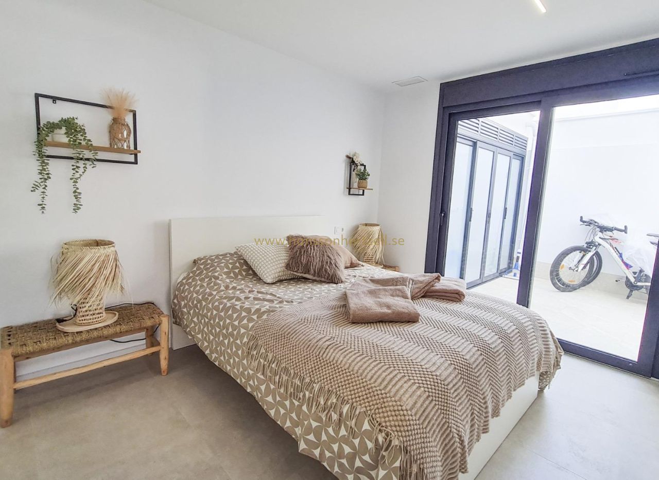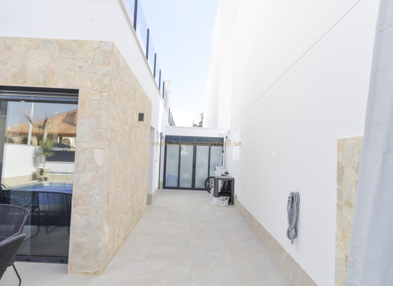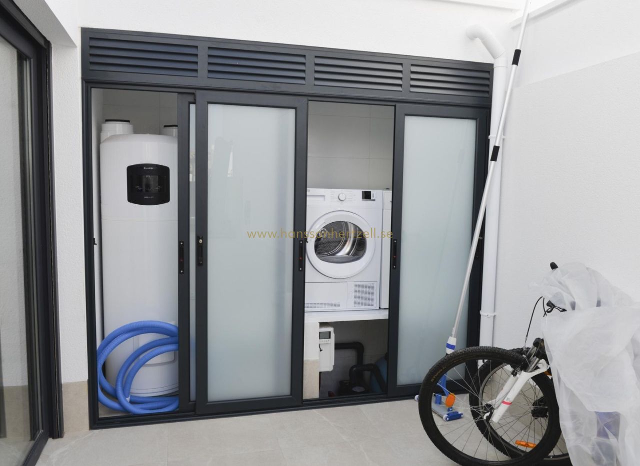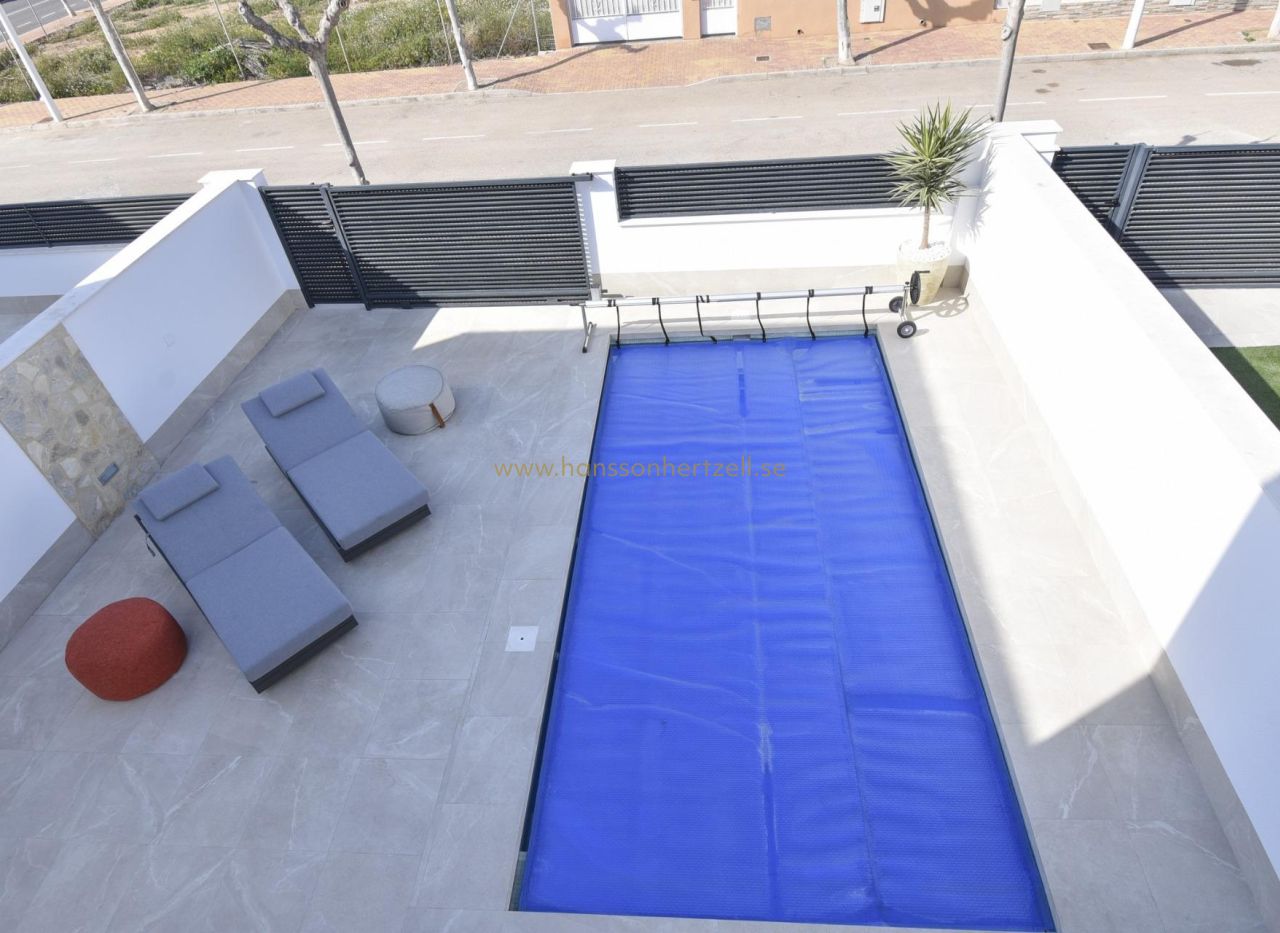 Moderna nybyggda villor i San Pedro del Pinatar med privat pool Elegant design och premiumkvalitet Välkommen till den andra fasen av en exklusiv utveckling i San Pedro del Pinatar, där modernitet möter funktionalitet. Dessa 12 parhusvillor är utformade med en minimalistisk design och högkvalitativa ytbehandlingar, vilket ger en sofistikerad och elegant boendeupplevelse. Varje villa har 3 rymliga sovrum, 3 badrum och en privat pool, tillsammans med terrasser och en privat trädgård. Detta är den perfekta fristaden för dem som söker lugn, avskildhet och oöverträffad komfort. Genomtänkt designade hem för ett modernt liv Dessa nybyggda villor har ett kök med öppen planlösning som är anslutet till ett ljust vardagsrum, vilket skapar ett sömlöst utrymme för familjeliv och underhållning. Viktiga funktioner inkluderar: 3 sovrum med inbyggda garderober. 3 badrum med duschväggar i genomskinligt glas för en elegant look. Privat pool och trädgård, perfekt för avkoppling utomhus. Terrasser på första våningen och ett valfritt takterrass för solbad. Parkeringsplats på tomten. Stora fönster i vardagsrummet ger direkt tillgång till poolområdet och översvämmar interiören med naturligt ljus. Energieffektiva tillägg som solpaneler och förinstallerad luftkonditionering med kanaler garanterar modern komfort och hållbarhet. Balay-apparater som ingår (induktionshäll, ugn, mikrovågsugn, fläkt, kylskåp, integrerad diskmaskin och tvättmaskin) gör det enkelt att flytta in. Förstklassigt läge i San Pedro del Pinatar San Pedro del Pinatar ligger vid den vackra Mar Menor- och Medelhavskusten och är en drömdestination för vattensportentusiaster och strandälskare. Området är känt för sina lugna stränder, naturliga gyttjebad och livliga småbåtshamn, som erbjuder aktiviteter året runt i ett milt klimat. Intressanta platser i närheten av dessa villor inkluderar: Dos Mares Shopping Center: 5 km (5 minuter med bil). Murcia-Corvera flygplats: 30 km (30 minuter med bil). Alicante flygplats: 80 km (1 timme med bil). Lokala golfbanor: Olika alternativ inom 10-15 km. Stränder i Lo Pagán: Bara en kort bilresa på 3 km bort. Området är välförsörjt med skolor, idrottsanläggningar, affärer och kollektivtrafik, vilket gör det idealiskt för både familjer och pensionärer. Upptäck ditt drömhem idag Missa inte chansen att äga en av dessa exklusiva villor i ett blomstrande samhälle. Upplev det bästa av kustlivet och gör San Pedro del Pinatar till ditt nya hem. Kontakta oss nu för att boka en visning och säkra din bit av paradiset!