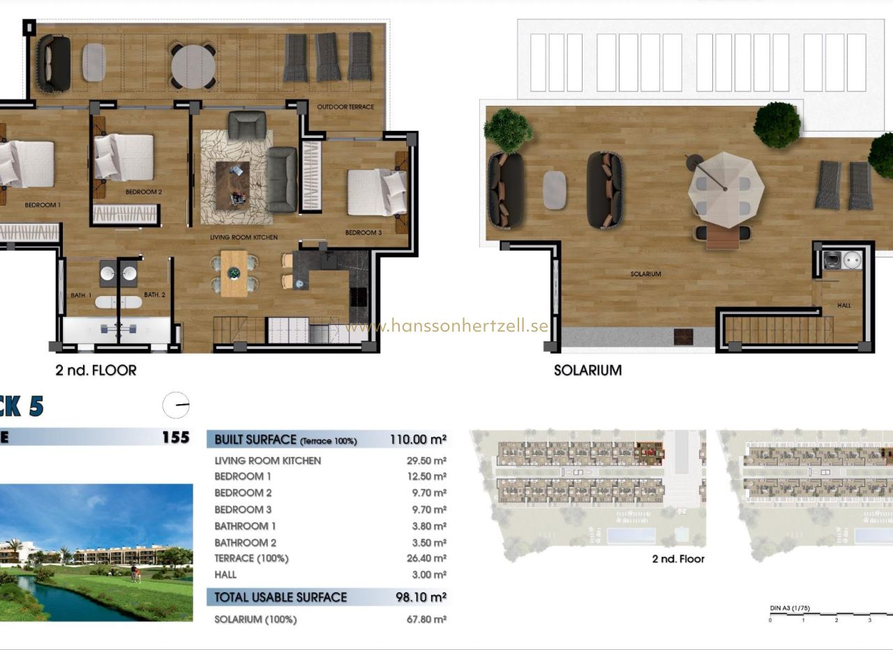 NYBYGGT BOSTADSKOMPLEX NÄRA LA SERENA GOLF, LOS ALCAZARES Detta fantastiska komplex kommer att bestå av 244 lägenheter med 2 och 3 sovrum, fördelade på 8 kvarter och 20 privata villor. Moderna lägenheter i 3 våningar (bottenvåning plus 2), bottenvåningen med fina trädgårdar, och några av dem med privat pool och andra våningen med fina terrasser och privata solarium. Hörnlägenheter (4 per våning) och lägenheter på översta våningen har 3 sovrum och resten 2 sovrum. Fastigheter i österläge med utsikt över de gemensamma områdena och västerläge med underbar utsikt över golfbanan. Komplex med den gemensamma poolen och de gemensamma utrymmena. Varje lägenhet har sin egen parkeringsplats och privat förvaring i källaren, ingår i priset. Bostad beläget i en frontlinje av den prestigefyllda golfbanan "La Serena Golf". Denna golfbana är välkänd för sina sjöar och vegetation som vävs samman med golfbanan. Vattnet och sjöarna finns i 16 av de 18 hålen, men hela banan är utformad för att erbjuda golfaren olika strategier i varje hål. En annan aspekt som gör denna golfbana unik är att den är ansluten genom att gå till stadens centrum, något som är omöjligt att hitta på andra golfplatser som gör att vi kan njuta av lugnet och skönheten i området utan att vägra tillgång till de tjänster som Los Alcázares erbjuder. Los Alcázares är ett exceptionellt område på Costa Cálida, bara 25 minuter från Murcias flygplats och 55 minuter från Alicantes flygplats. Området är anslutet via motorväg med städerna Cartagena, Murcia och Alicante och resten av stränderna på Costa Cálida och Costa Blanca.