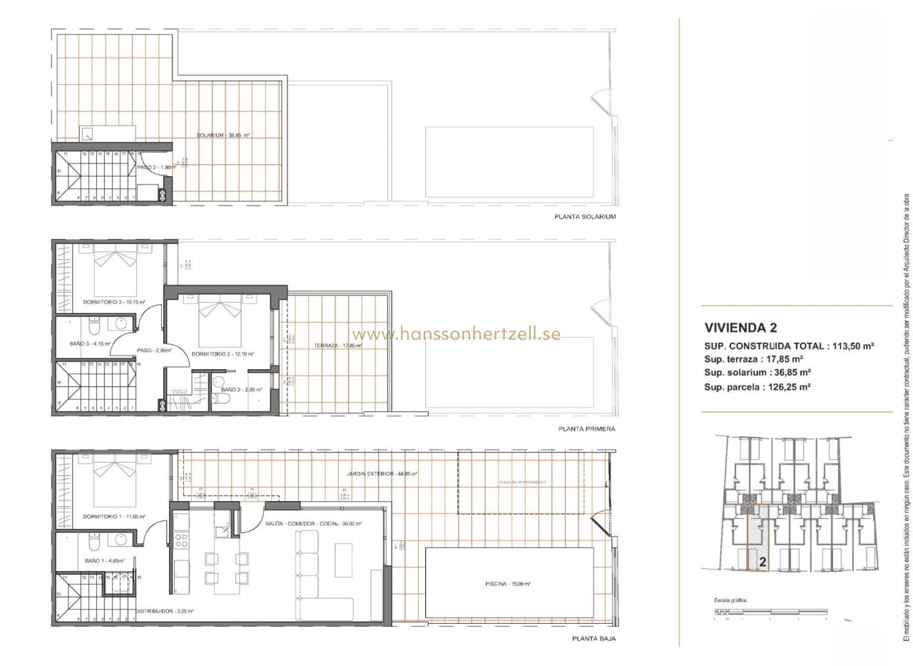 Moderna radhusvillor med privat pool nära havet i Santiago de la Ribera Beläget i området San Blas i Santiago de la Ribera, Murcia, ett av de mest attraktiva områdena vid Mar Menor. Detta projekt består av 12 villor med 3 sovrum och 2/3 badrum, inklusive privat pool, terrass och solarium med sommarkök i utvalda bostäder. Villorna har eleganta och funktionella interiörer, fullt utrustade kök med alla vitvaror och dessutom förinstallation för luftkonditionering. Detta projekt erbjuder en unik möjlighet att njuta av design, komfort och stil bara några minuter från havet. Exklusivt nybyggnadsprojekt bara 1 km från stranden Upptäck detta begränsade nybyggnadsprojekt med radhusvillor i Santiago de la Ribera, en charmig kustort på Murcias kust, känd för sin avslappnade livsstil, rena stränder och utmärkta klimat året om. Dessa nya bostäder ligger bara 1 km från Mar Menors kust och erbjuder den perfekta kombinationen av avskildhet, bekvämlighet och närhet till viktiga tjänster och fritidsaktiviteter. Modernt design med funktionell planlösning Varje villa är omsorgsfullt fördelad på två våningar och vissa enheter har en takterrass, vilket ger gott om utrymme för ett modernt boende. Fastigheterna har: 3 rymliga sovrum, varav ett på bottenvåningen 2 eller 3 kompletta badrum. Privat trädgård och pool. Terrass på första våningen och vissa enheter har takterrass, perfekt för att sola eller ta emot gäster. Privat parkering på tomten. Dessutom har två av bostäderna solcellspaneler för energibesparing. Högkvalitativa ytbehandlingar och prestanda Bostäderna är byggda med omsorg om detaljer och enligt moderna standarder och inkluderar: Pansrad ytterdörr Motoriserade aluminiumrulljalusier Möblerat kök med vitvaror Badrumsmöbler med spegel och belysning Duschkar i porslin anpassat efter badrummet med duschväggar installerade Förinstallation för luftkonditionering med kanaler Dessa bostäder är utformade för att kunna njutas året runt, vare sig det är som huvudbostad, fritidsbostad eller investering för semesteruthyrning. Privilegierat läge på Costa Cálida Santiago de la Ribera erbjuder en dynamisk medelhavslivsstil med allt inom räckhåll: Strand (Mar Menor) – 1 km La Ribera shoppingcenter – 2 km Roda Golf – 5 km San Javier flygplats – 6 km Lo Pagán marina – 4 km Dos Mares shoppingcenter – 3 km Utmärkta vägförbindelser till Murcia (40 km) och Cartagena (30 km) Med sin rika lokala kultur, veckomarknader, strandpromenader och möjligheter till vattensporter är Santiago de la Ribera en idealisk plats för att njuta av det bästa av Costa Cálida. Förverkliga din dröm om att bo vid kusten Missa inte denna unika möjlighet att köpa en elegant nybyggd villa i ett av de mest eftertraktade områdena på Murcias kust. Kontakta oss nu för mer information eller för att boka en visning.