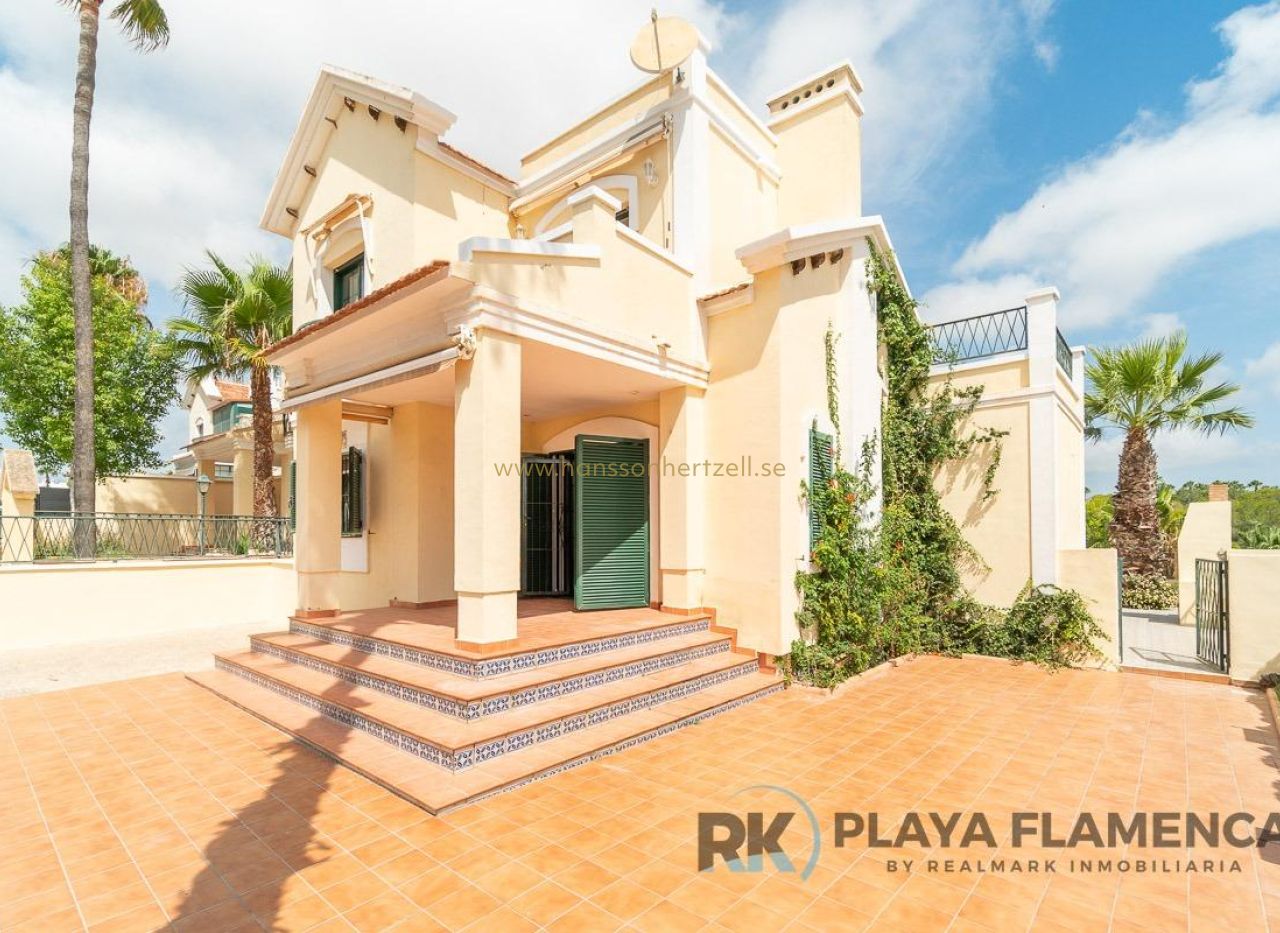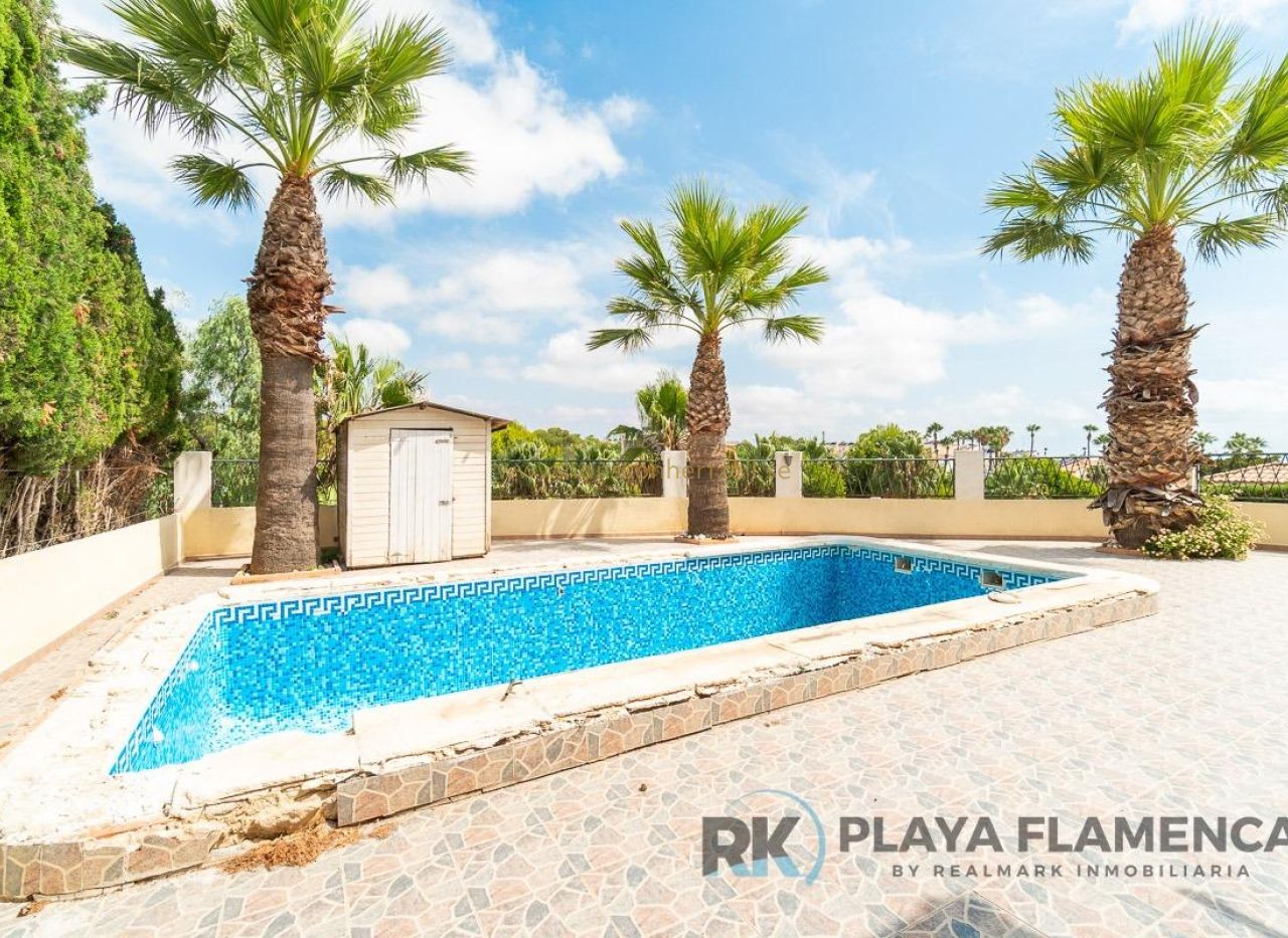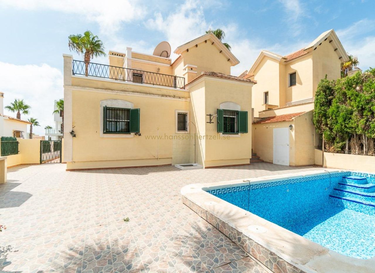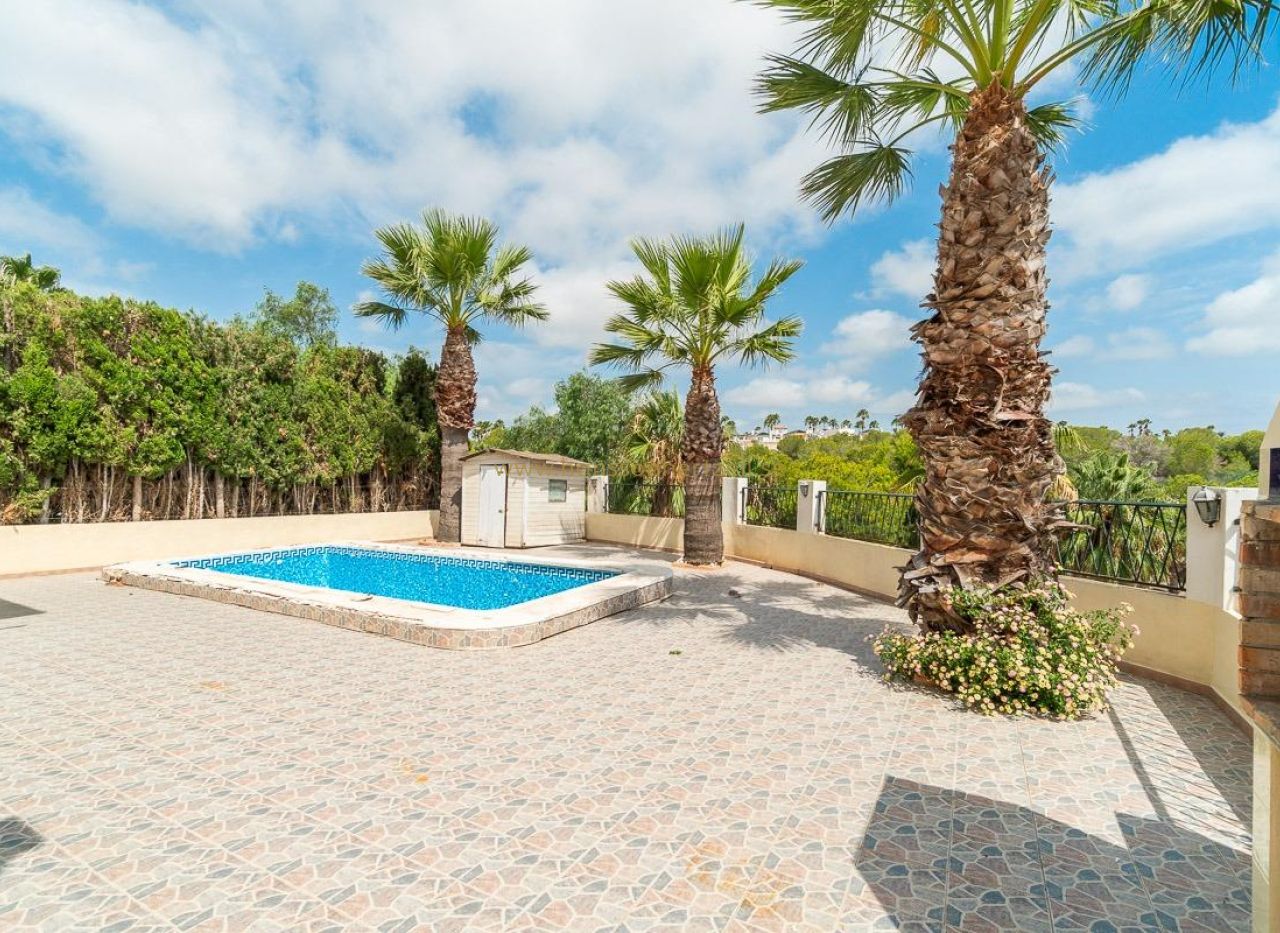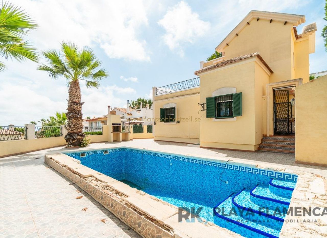 I ett av de lugnaste och mest exklusiva områdena i VillaMartin-området, mycket nära tre golfbanor och med egen trädgård och pool, ligger denna vackra villa med utsikt över grönområden, perfekt för en stor familj.~Fastigheten ligger nära tre golfbanor: Las Ramblas, Campoamor och Villamartín. Den har också enkel tillgång till avfarten från motorväg AP-7, med direkta förbindelser till flygplatserna i Alicante (ca 40 km) och Murcia (ca 40 km).~Den har en gemensam pool med trädgårdar, där du kan njuta av solbad och bad med resten av grannarna. Den har också en egen trädgård och kaklade terrasser, samt en pool i behov av renovering.~Villans storlek är idealisk för dem som söker utrymme, eller för att underhålla gäster och vänner; med sina 3 sovrum, 2 badrum och en rymlig tomt och trädgårdsområde.~Den 410 kvadratmeter stora tomten är perfekt för att ha utrymme och en känsla av självständighet, med sin stenlagda trädgård på framsidan med en bilinfart och en stenlagd bakgård med fri utsikt. Men eftersom den är stenlagd och inte har många träd och växter kräver den inte mycket underhåll eller arbete. Villan vetter mot söder på sin huvudfasad, terrasser och solarium, så den har sol praktiskt taget hela dagen. Denna villa är utan tvekan mångas dröm.~Och husets planlösning: från trädgården nås, som nämnts, den första terrassen, som vetter mot syd-sydväst. Den har sol hela dagen, men samtidigt, eftersom den är öppen mot trädgården och gatan, släpper den in en frisk bris. Denna rymliga terrass, med plats för soffor och bord, leder till husets huvudentré med en säkerhetsdörr, som öppnar sig mot det rymliga och ljusa vardagsrummet och matsalen med öppen spis. Det finns också ett separat kök med egen dörr och fönster, så att du kan laga mat utan att behöva oroa dig för lukt och fett som kommer in i resten av huset.~På bottenvåningen finns också ett rymligt sovrum med inbyggd garderob och ett badrum med duschkabin. Det betyder att om familjen har en äldre person eller någon med rörelsehinder kan de bo ensamma på denna våning utan att behöva gå upp och ner för trappor.~~Första våningen, som nås via den tvåvånings inre trappan med enkel åtkomst, leder till de andra två sovrummen med inbyggda garderober och direkt tillgång till det stora solariet och balkongen. Denna våning har också ett andra badrum, den här gången med badkar för avkopplande dopp och inbyggda möbler.~~Det betyder att varje våning har sitt eget badrum, sovrum och utrymme att njuta av både utomhus och inomhus, med terrasser, vilket gör det till det perfekta hemmet för en stor familj.~~~Bostaden är värd ett besök för sin rymlighet, sitt ljus, sin närhet till alla bekvämligheter och golfbanan, och sitt lugn.