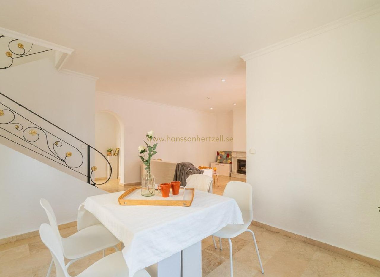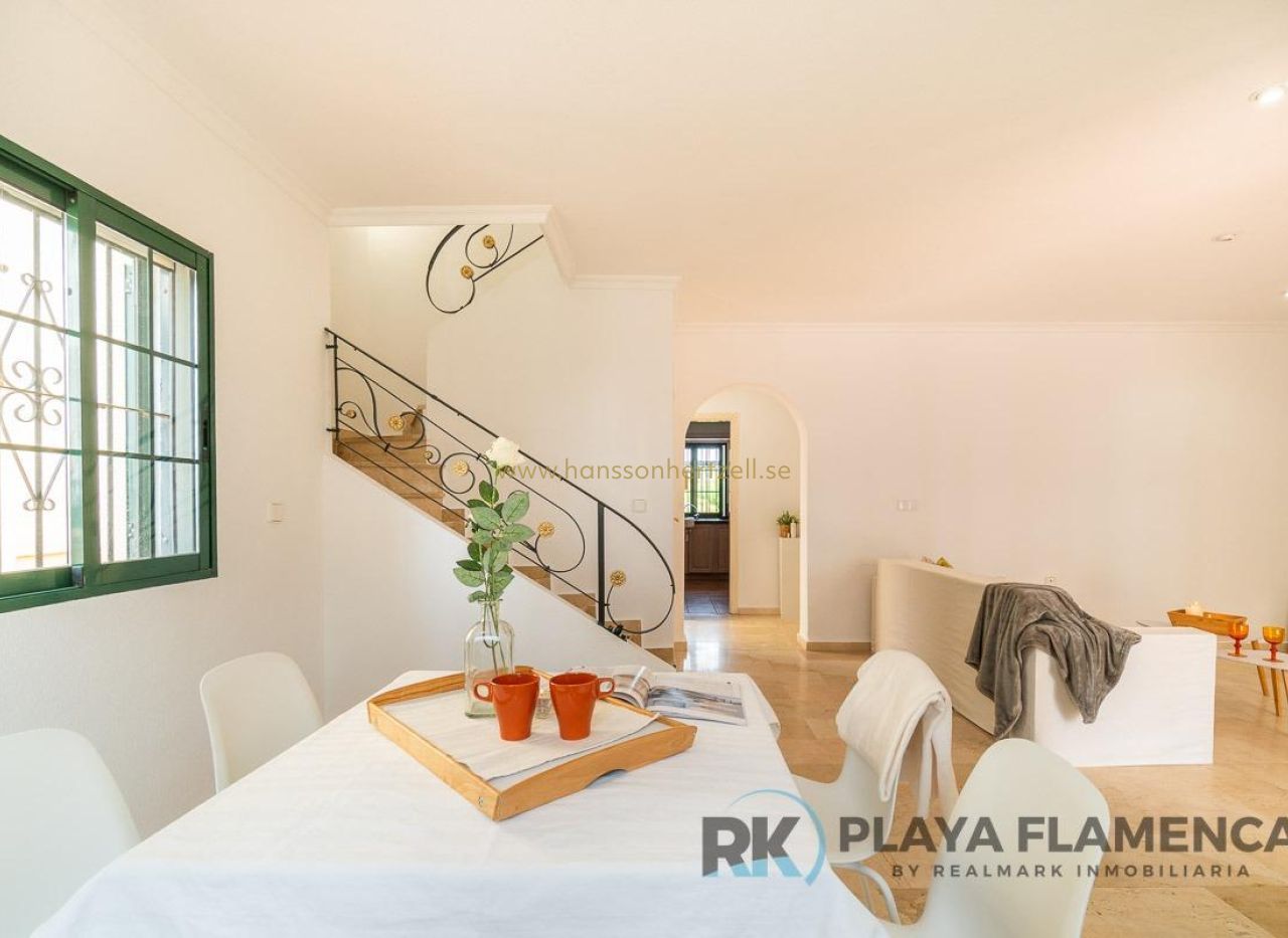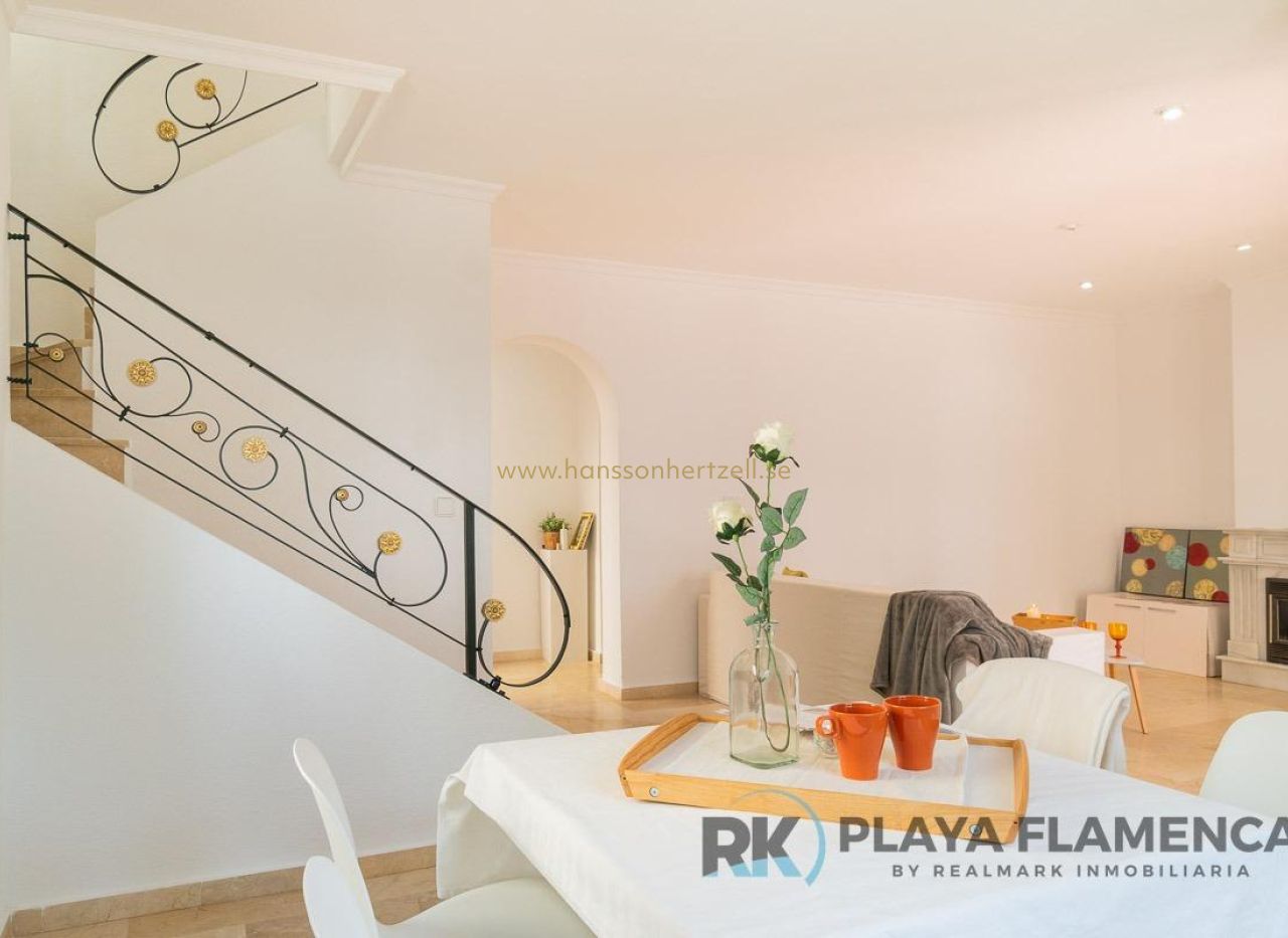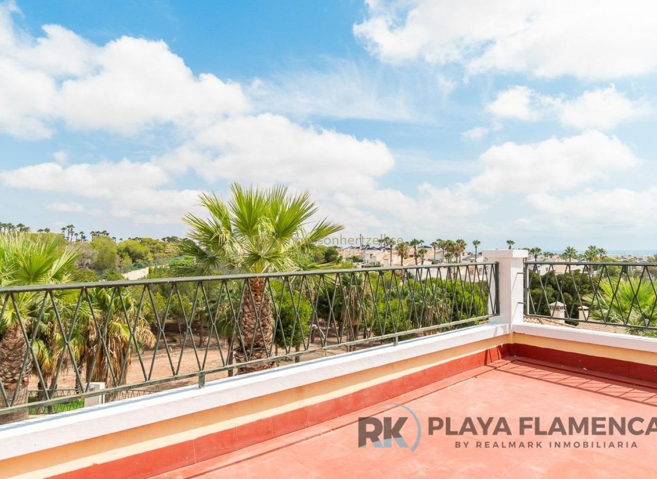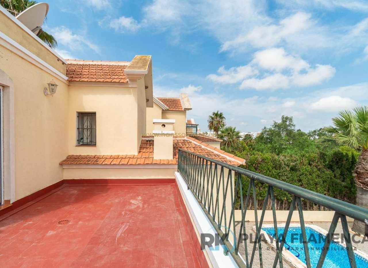 I ett av de lugnaste och mest exklusiva områdena i VillaMartin-området, mycket nära tre golfbanor och med egen trädgård och pool, ligger denna vackra villa med utsikt över grönområden, perfekt för en stor familj.~Fastigheten ligger nära tre golfbanor: Las Ramblas, Campoamor och Villamartín. Den har också enkel tillgång till avfarten från motorväg AP-7, med direkta förbindelser till flygplatserna i Alicante (ca 40 km) och Murcia (ca 40 km).~Den har en gemensam pool med trädgårdar, där du kan njuta av solbad och bad med resten av grannarna. Den har också en egen trädgård och kaklade terrasser, samt en pool i behov av renovering.~Villans storlek är idealisk för dem som söker utrymme, eller för att underhålla gäster och vänner; med sina 3 sovrum, 2 badrum och en rymlig tomt och trädgårdsområde.~Den 410 kvadratmeter stora tomten är perfekt för att ha utrymme och en känsla av självständighet, med sin stenlagda trädgård på framsidan med en bilinfart och en stenlagd bakgård med fri utsikt. Men eftersom den är stenlagd och inte har många träd och växter kräver den inte mycket underhåll eller arbete. Villan vetter mot söder på sin huvudfasad, terrasser och solarium, så den har sol praktiskt taget hela dagen. Denna villa är utan tvekan mångas dröm.~Och husets planlösning: från trädgården nås, som nämnts, den första terrassen, som vetter mot syd-sydväst. Den har sol hela dagen, men samtidigt, eftersom den är öppen mot trädgården och gatan, släpper den in en frisk bris. Denna rymliga terrass, med plats för soffor och bord, leder till husets huvudentré med en säkerhetsdörr, som öppnar sig mot det rymliga och ljusa vardagsrummet och matsalen med öppen spis. Det finns också ett separat kök med egen dörr och fönster, så att du kan laga mat utan att behöva oroa dig för lukt och fett som kommer in i resten av huset.~På bottenvåningen finns också ett rymligt sovrum med inbyggd garderob och ett badrum med duschkabin. Det betyder att om familjen har en äldre person eller någon med rörelsehinder kan de bo ensamma på denna våning utan att behöva gå upp och ner för trappor.~~Första våningen, som nås via den tvåvånings inre trappan med enkel åtkomst, leder till de andra två sovrummen med inbyggda garderober och direkt tillgång till det stora solariet och balkongen. Denna våning har också ett andra badrum, den här gången med badkar för avkopplande dopp och inbyggda möbler.~~Det betyder att varje våning har sitt eget badrum, sovrum och utrymme att njuta av både utomhus och inomhus, med terrasser, vilket gör det till det perfekta hemmet för en stor familj.~~~Bostaden är värd ett besök för sin rymlighet, sitt ljus, sin närhet till alla bekvämligheter och golfbanan, och sitt lugn.