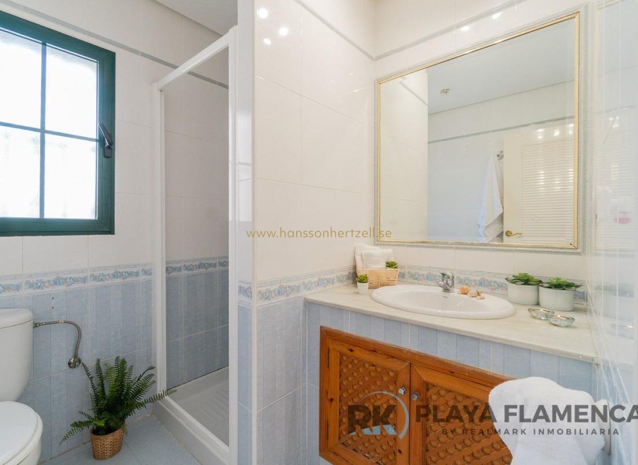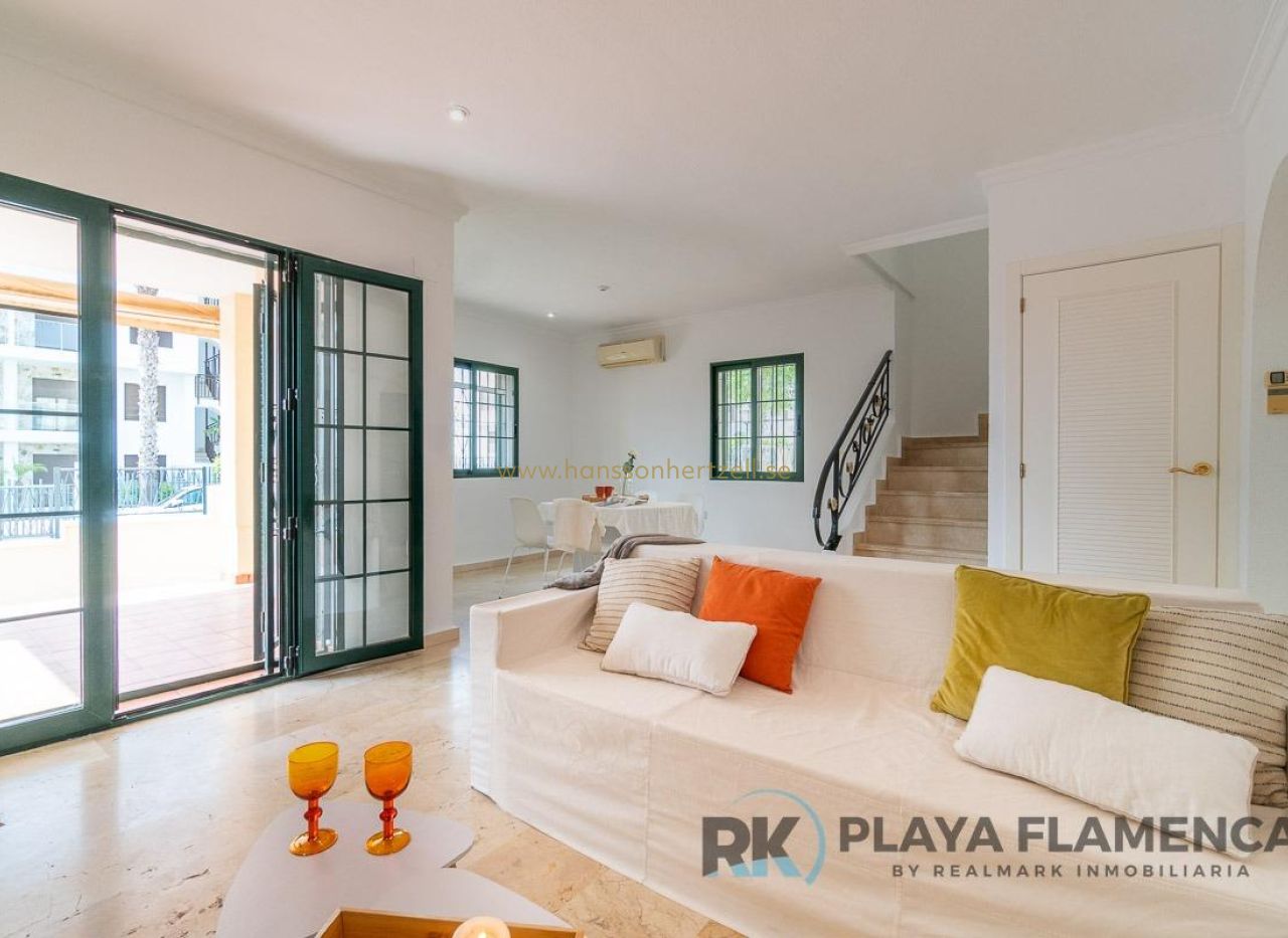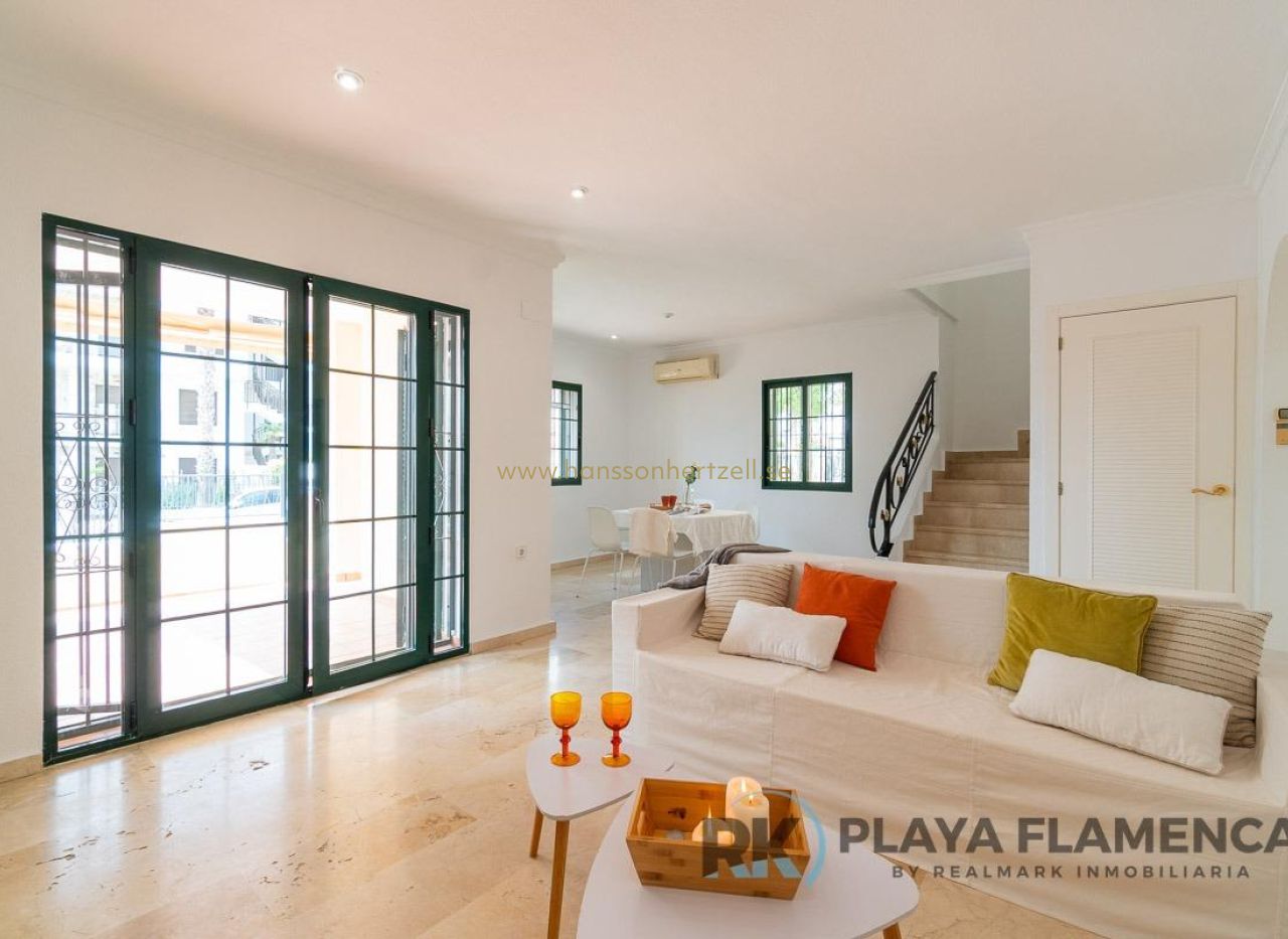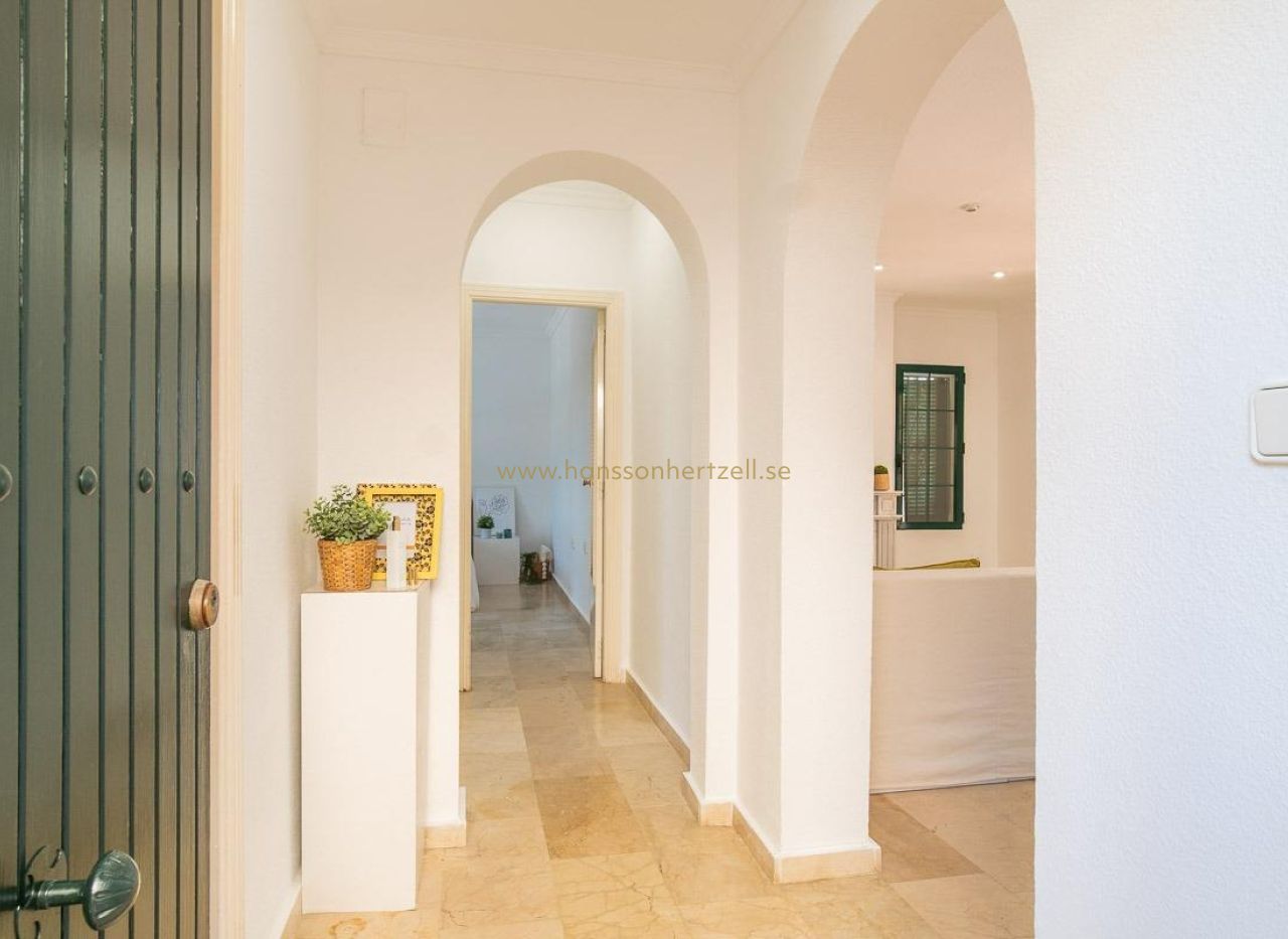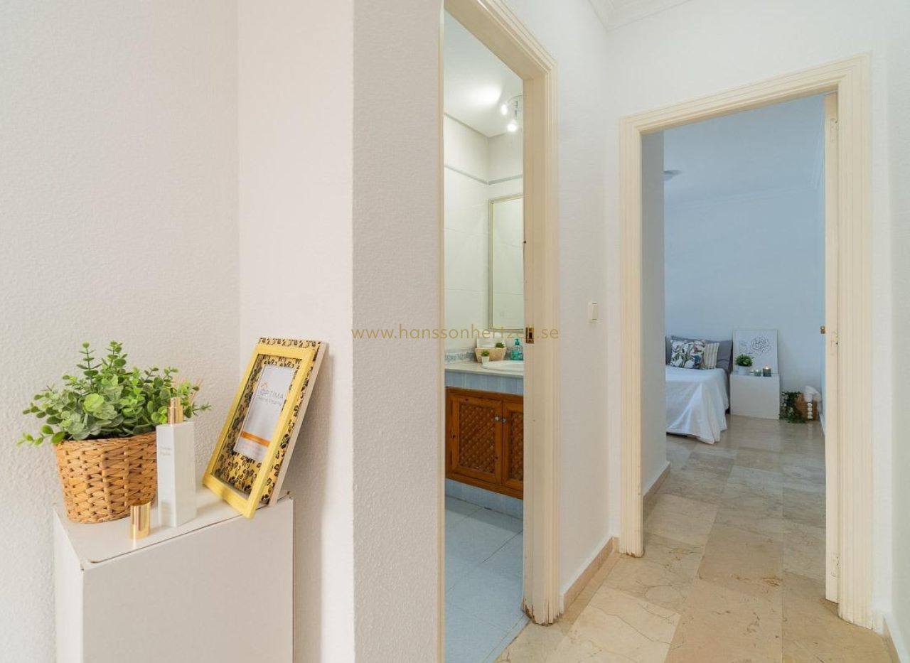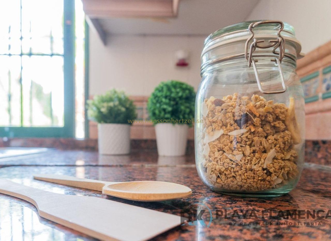 I ett av de lugnaste och mest exklusiva områdena i VillaMartin-området, mycket nära tre golfbanor och med egen trädgård och pool, ligger denna vackra villa med utsikt över grönområden, perfekt för en stor familj.~Fastigheten ligger nära tre golfbanor: Las Ramblas, Campoamor och Villamartín. Den har också enkel tillgång till avfarten från motorväg AP-7, med direkta förbindelser till flygplatserna i Alicante (ca 40 km) och Murcia (ca 40 km).~Den har en gemensam pool med trädgårdar, där du kan njuta av solbad och bad med resten av grannarna. Den har också en egen trädgård och kaklade terrasser, samt en pool i behov av renovering.~Villans storlek är idealisk för dem som söker utrymme, eller för att underhålla gäster och vänner; med sina 3 sovrum, 2 badrum och en rymlig tomt och trädgårdsområde.~Den 410 kvadratmeter stora tomten är perfekt för att ha utrymme och en känsla av självständighet, med sin stenlagda trädgård på framsidan med en bilinfart och en stenlagd bakgård med fri utsikt. Men eftersom den är stenlagd och inte har många träd och växter kräver den inte mycket underhåll eller arbete. Villan vetter mot söder på sin huvudfasad, terrasser och solarium, så den har sol praktiskt taget hela dagen. Denna villa är utan tvekan mångas dröm.~Och husets planlösning: från trädgården nås, som nämnts, den första terrassen, som vetter mot syd-sydväst. Den har sol hela dagen, men samtidigt, eftersom den är öppen mot trädgården och gatan, släpper den in en frisk bris. Denna rymliga terrass, med plats för soffor och bord, leder till husets huvudentré med en säkerhetsdörr, som öppnar sig mot det rymliga och ljusa vardagsrummet och matsalen med öppen spis. Det finns också ett separat kök med egen dörr och fönster, så att du kan laga mat utan att behöva oroa dig för lukt och fett som kommer in i resten av huset.~På bottenvåningen finns också ett rymligt sovrum med inbyggd garderob och ett badrum med duschkabin. Det betyder att om familjen har en äldre person eller någon med rörelsehinder kan de bo ensamma på denna våning utan att behöva gå upp och ner för trappor.~~Första våningen, som nås via den tvåvånings inre trappan med enkel åtkomst, leder till de andra två sovrummen med inbyggda garderober och direkt tillgång till det stora solariet och balkongen. Denna våning har också ett andra badrum, den här gången med badkar för avkopplande dopp och inbyggda möbler.~~Det betyder att varje våning har sitt eget badrum, sovrum och utrymme att njuta av både utomhus och inomhus, med terrasser, vilket gör det till det perfekta hemmet för en stor familj.~~~Bostaden är värd ett besök för sin rymlighet, sitt ljus, sin närhet till alla bekvämligheter och golfbanan, och sitt lugn.