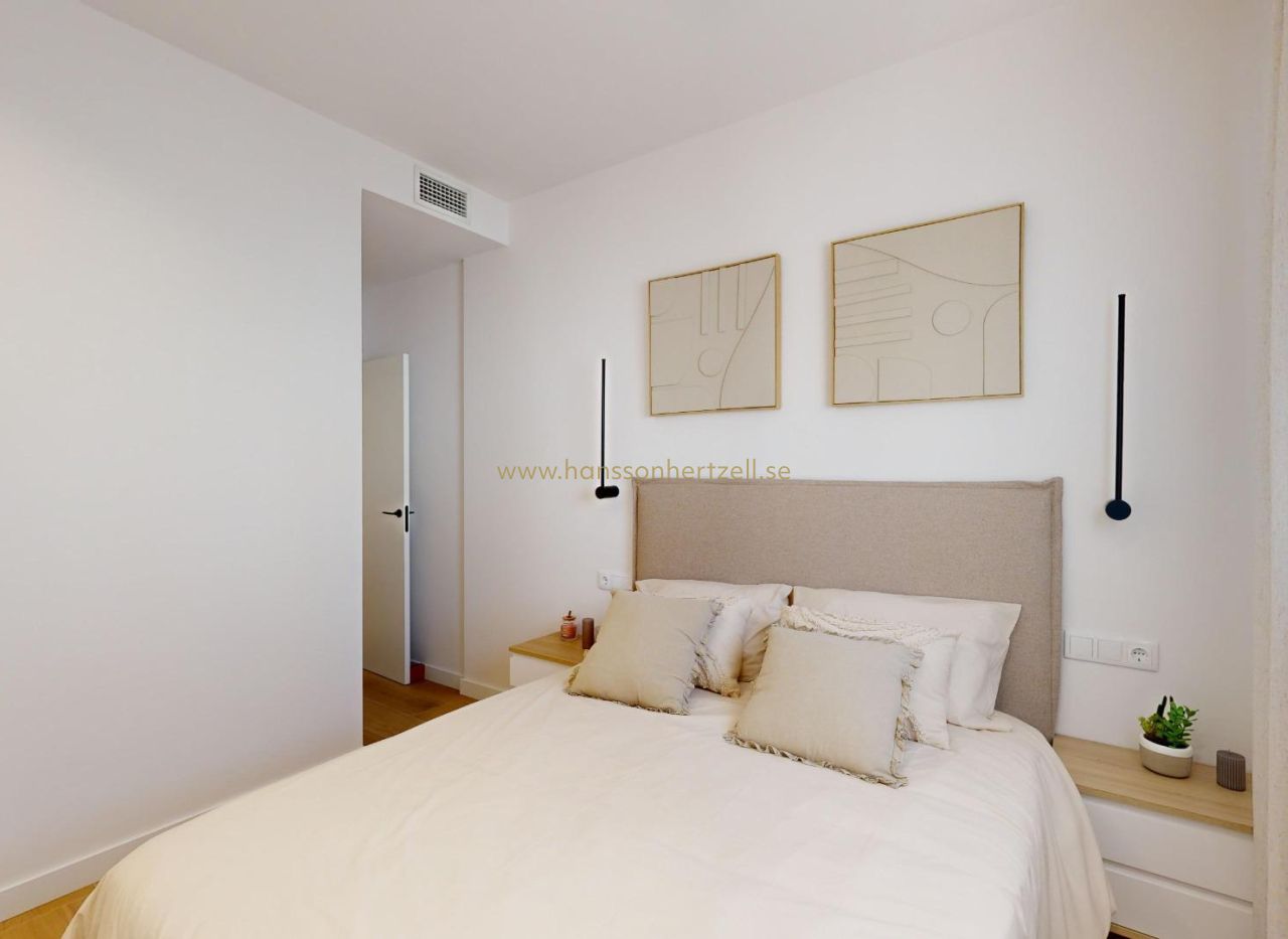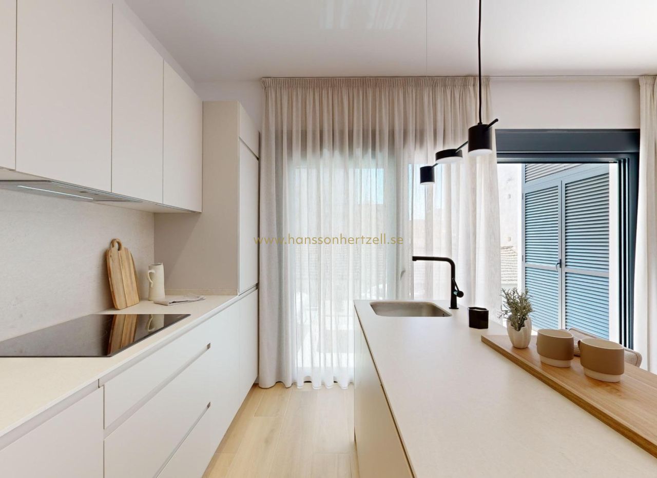 Nybyggda takvåningar i Guardamar del Segura med privat solarium Modernt boende i hjärtat av Guardamar Upptäck detta exklusiva nya bostadsområde i centrum av Guardamar del Segura, en charmig kuststad på Costa Blanca Syd, känd för sina 11 km sandstränder och stora tallskogar. Detta bostadsområde erbjuder modern design, utmärkt finish och ett oslagbart läge bara 550 m från stranden och nära alla tjänster såsom stormarknader, stadshus, vårdcentral, busstation, restauranger och butiker. Rymliga bostäder med privat solarium Takvåningarna har 3 sovrum med inbyggda garderober, 2 badrum (ett ensuite), ett öppet kök integrerat i vardagsrummet och direkt tillgång till en stor terrass. Varje bostad har också ett privat solarium på taket med förråd, perfekt för att njuta av solen hela dagen. Parkering finns i en närliggande byggnad. Exklusiva gemensamma utrymmen Bostadsområdet erbjuder välplanerade gemensamma utrymmen för avkoppling och fritid: Solarium på taket med sittplatser och lekplats för barn Hiss för enkel åtkomst Livsstil i Guardamar del Segura Guardamar är mycket mer än en stranddestination; det är en livlig stad med service och aktiviteter året runt. Varje onsdag arrangerar staden en populär veckomarknad som lockar besökare från omgivningarna. Marinan erbjuder vattensporter och aktiviteter året runt, medan sportanläggningen har tennisbanor, paddelbanor, fotbollsplaner och en uppvärmd inomhuspool. Det lokala biblioteket erbjuder också gratis Wi-Fi och offentliga datorer. Strategiskt läge på Costa Blanca Detta bostadsområde har ett utmärkt läge med bra förbindelser till närliggande attraktioner: Guardamar-stranden: 550 m Golfbanor: 6,5 km Alicante–Elche internationella flygplats: 20 km Torrevieja: 12 km Alicantes centrum: 35 km Köpcentrum som La Zenia Boulevard: 25 km Ett perfekt hem eller en perfekt investeringsmöjlighet Med sitt privilegierade läge, moderna design och närhet till både stranden och viktiga tjänster är dessa nybyggda lägenheter i Guardamar del Segura idealiska som permanentbostad, semesterbostad eller investering. Kontakta oss idag för att boka en visning och säkra ditt nya hem vid Medelhavet.