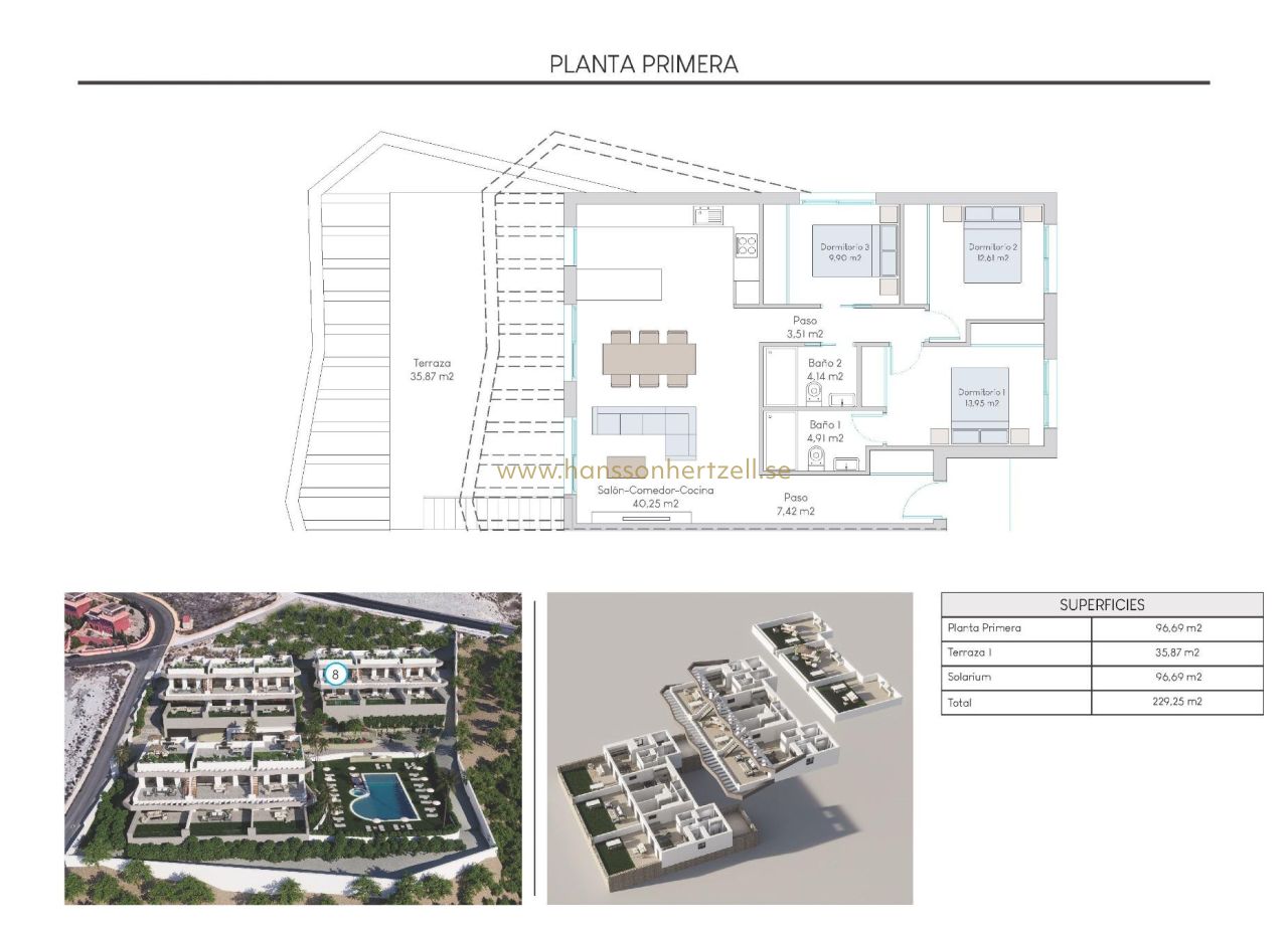 NYBYGGT BOSTADSOMRÅDE I FINESTRAT Nybyggt unikt och exklusivt bostadsområde med högt läge i Balcon de Finestrat. Detta komplex av moderna bungalows med 2 och 3 sovrum, alla med 2 badrum, kök med öppen planlösning med vardagsrum och matsal. Bungalower på översta våningen med privat solarium och bungalower på bottenvåningen med privat trädgård och möjlighet till privat pool mot en extra kostnad. Fastigheterna har massor av naturligt ljus och designerö i köket. Hiss i alla bostäder. Hållbar konstruktion med energicertifikat A. Varje fastighet har privat parkering. Gym för inomhusfitness. Bio-hälsosamt område för sport. Gemensam pool. LED-belysning inomhus och utomhus. Material och varumärken av hög kvalitet. Fastigheterna har tillgång till en stor pool och njuter av ett av de bästa lägena på Costa Blanca. Det är en fantastisk möjlighet och privilegium att kunna leva med denna miljö av golf och strand, nära till alla bekvämligheter av alla tjänster som anses vara en av de bästa platserna att investera. Finestrat ligger i Marina Baixa-regionen på Costa Blanca. Benidorm ligger bara fem minuters bilresa från fastigheterna och erbjuder alla tjänster du behöver, inklusive butiker, barer, restauranger, stormarknader, banker, apotek och flera privata internationella skolor. Nära till stränderna Levante, Poniente och Cala de Finestrat, med mer än 6 km längd som är bland de bästa i Europa som tilldelats av Europeiska unionen med blå flaggor. Alla fritidstjänster som temaparkerna Aqua Natura, Terra Mítica, Terra Natura, Aqualandia och Mundomar, Sierra Cortina och Villaitana Golfbanor, vandring och klättring i Puig Campana en ojämförlig naturlig miljö eller njut av nautiska sporter. Avstånd till havet 4 km, till flygplatsen 26 km och till golfbanan 1 km. Komplexet ligger 40 minuter från Alicante flygplats.