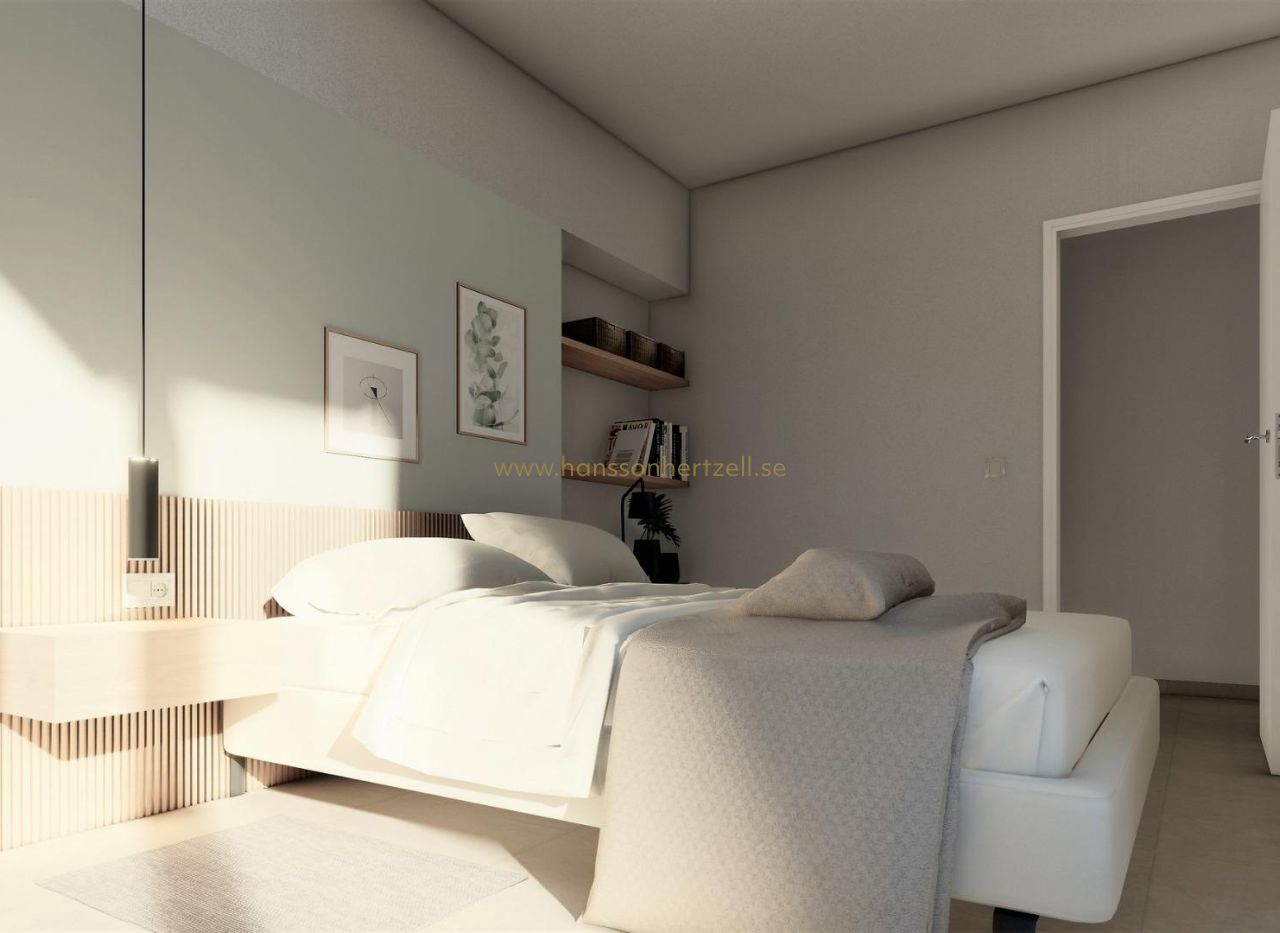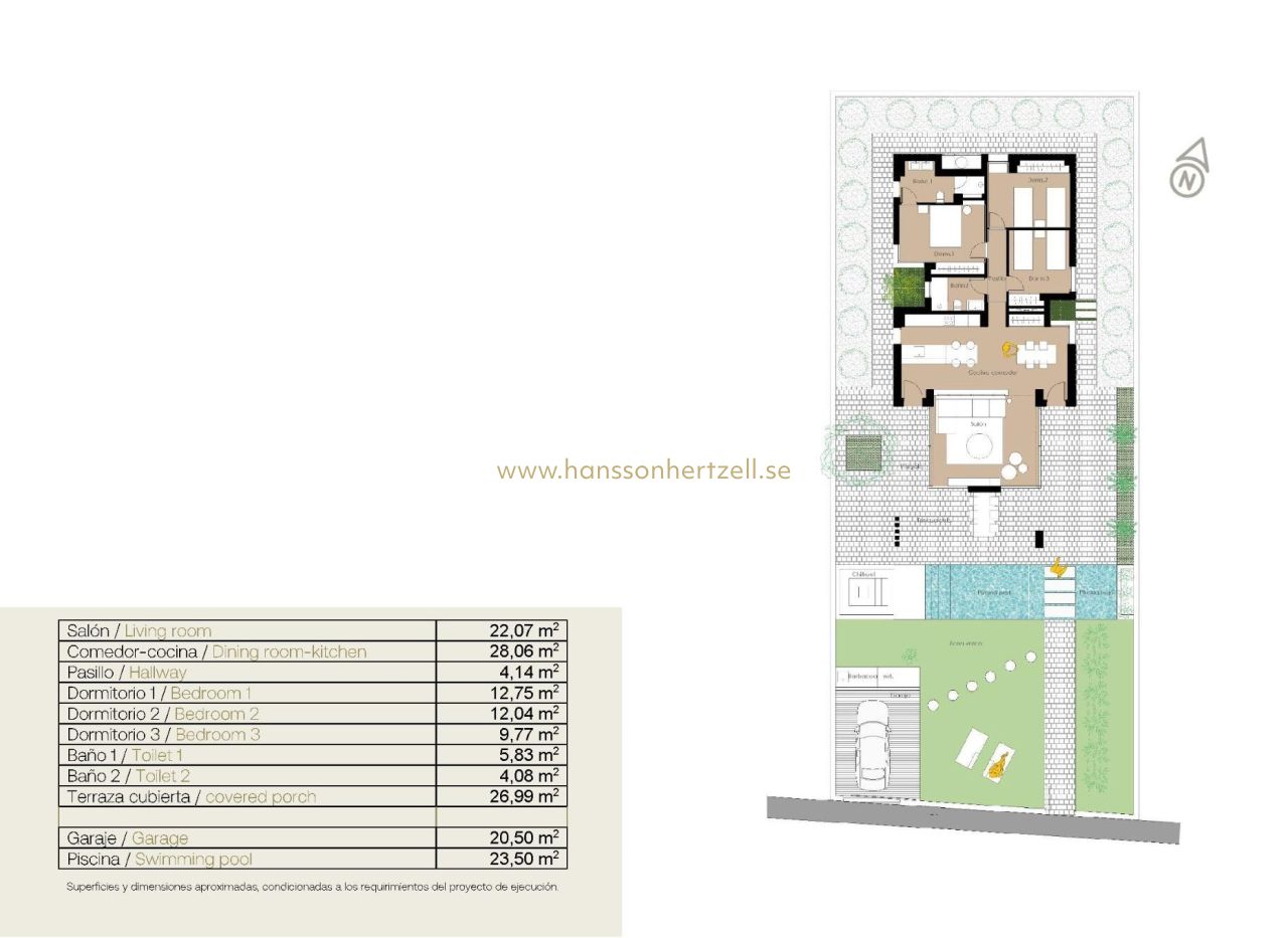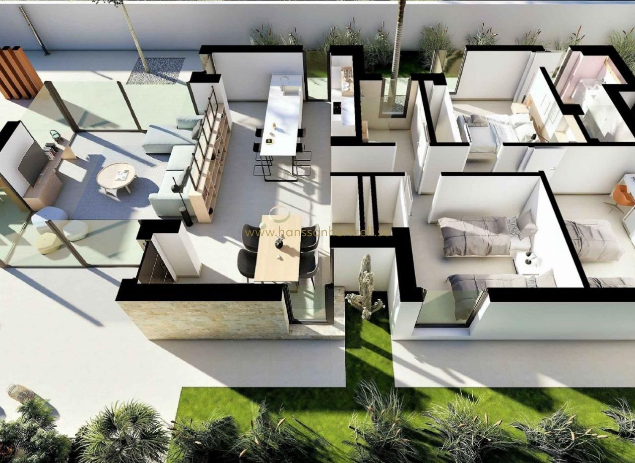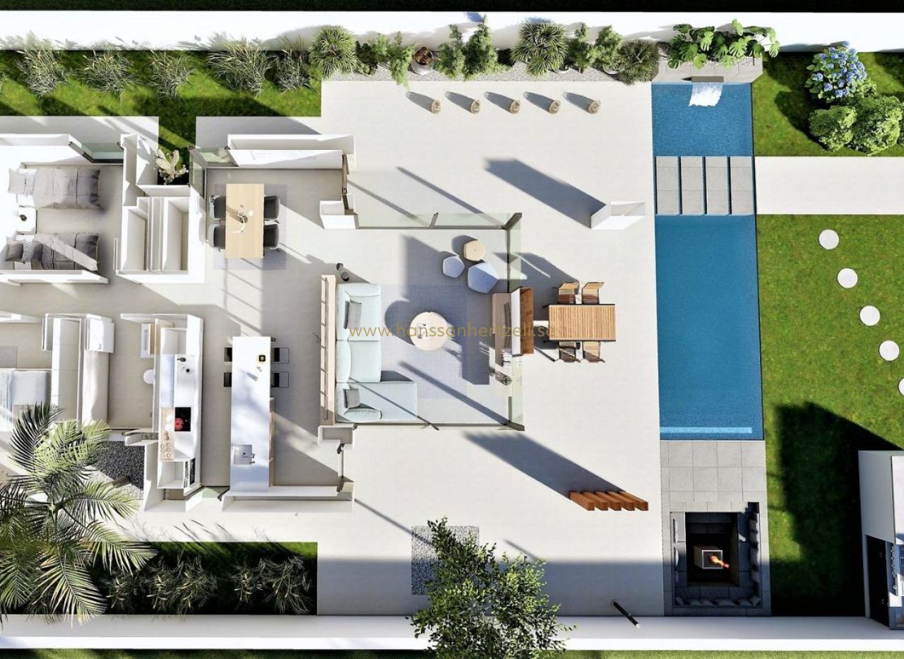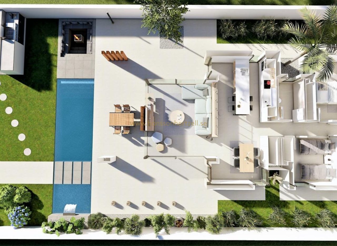 NYBYGGDA VILLOR I SAN FULGENCIO Nybyggda villor San Fulgencio, bara 5 km från stranden. Villorna har 3 sovrum, 2 badrum och rymligt kök, matsal, vardagsrum, pool med vattenfall och två pooler: splash pool som mäter 1,95x2,60 m och 0,6 m djup, och pool som mäter 5,60x2,60 m, mellan 1 och 1,5 m variabelt djup. En stor veranda i söderläge gör att vardagsrummet fortsätter med utsidan och öppnar upp till ett modernt och funktionellt utomhusutrymme där du kan njuta av den privata poolen, grill, chillout och det stora trädgårdsområdet som omger det. Möblernas enkla och tydliga linjer bidrar till att de integreras med resten av huset. Trädetaljer tillför värme till atmosfären. Badrummen där färg kombineras med naturliga och varma toner, skapar en mysig atmosfär, som tillsammans med det direkta förhållandet till utsidan gör att du kan ansluta till naturen och uppnå stora stunder av avkoppling. Det stora sovrummet har en privat uteplats, som tillsammans med ljuset som tränger in genom fönstren skapar en avkopplande atmosfär, perfekt för vila och avkoppling. San Fulgencio är en trevlig by med flera restauranger och butiker och läget är mycket bra med sin närhet till de fantastiska stränderna i La Marina och den något större staden Guardamar. Staden San Fulgencio ligger cirka 30 minuter från Alicante-Elche flygplats, 6 km från närmaste golfbana och bara 5 km från närmaste strand.