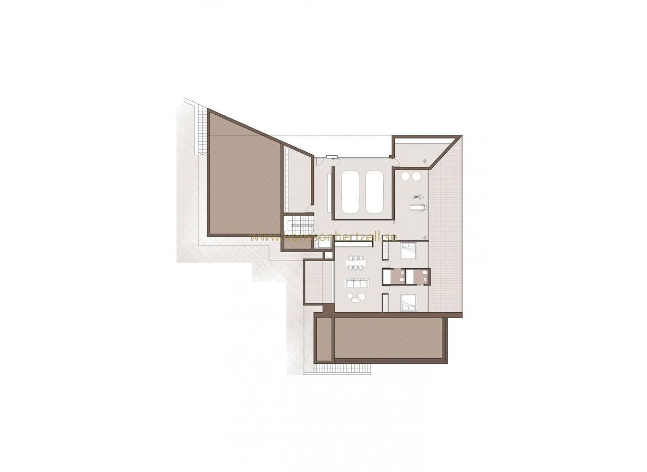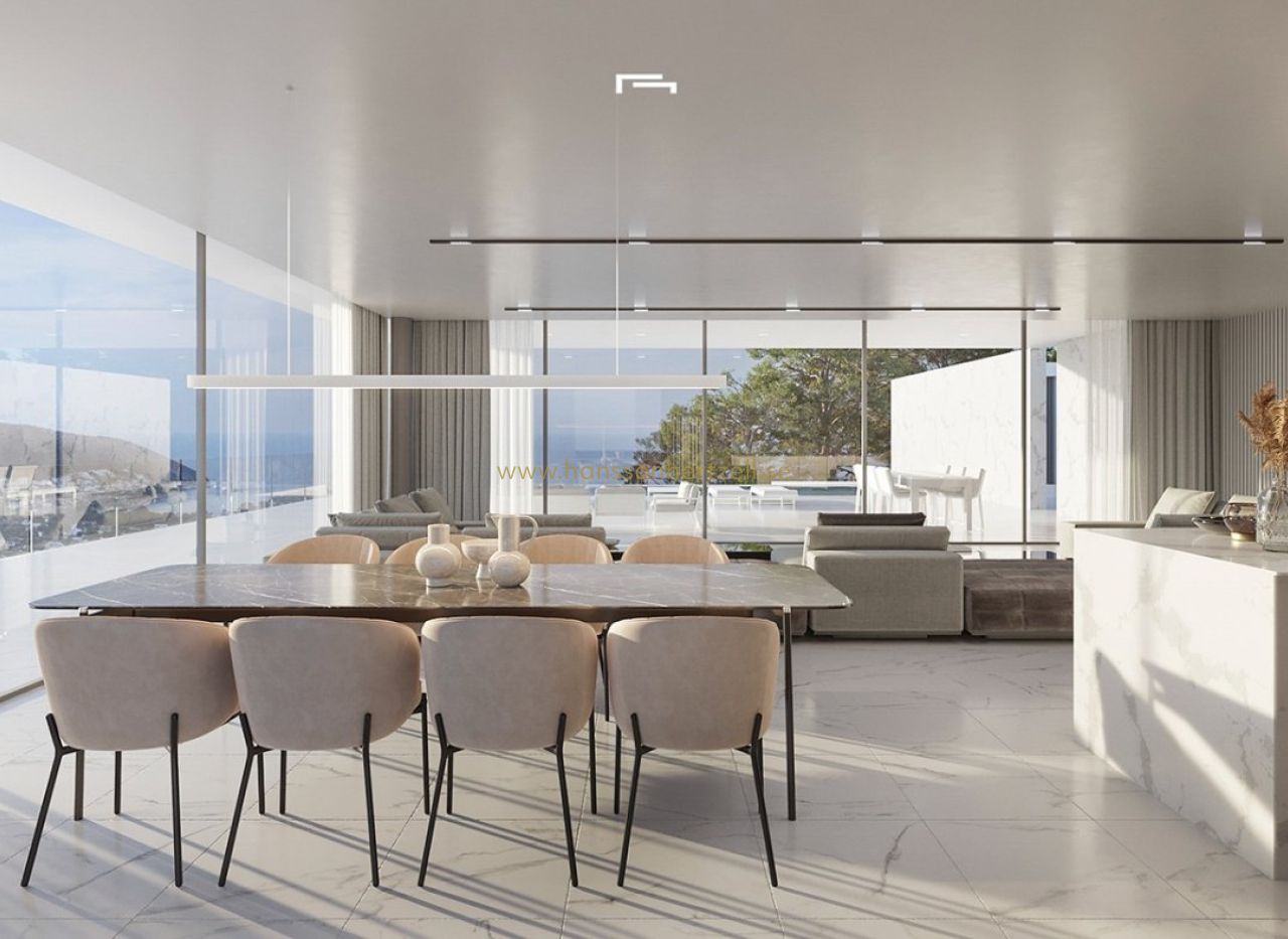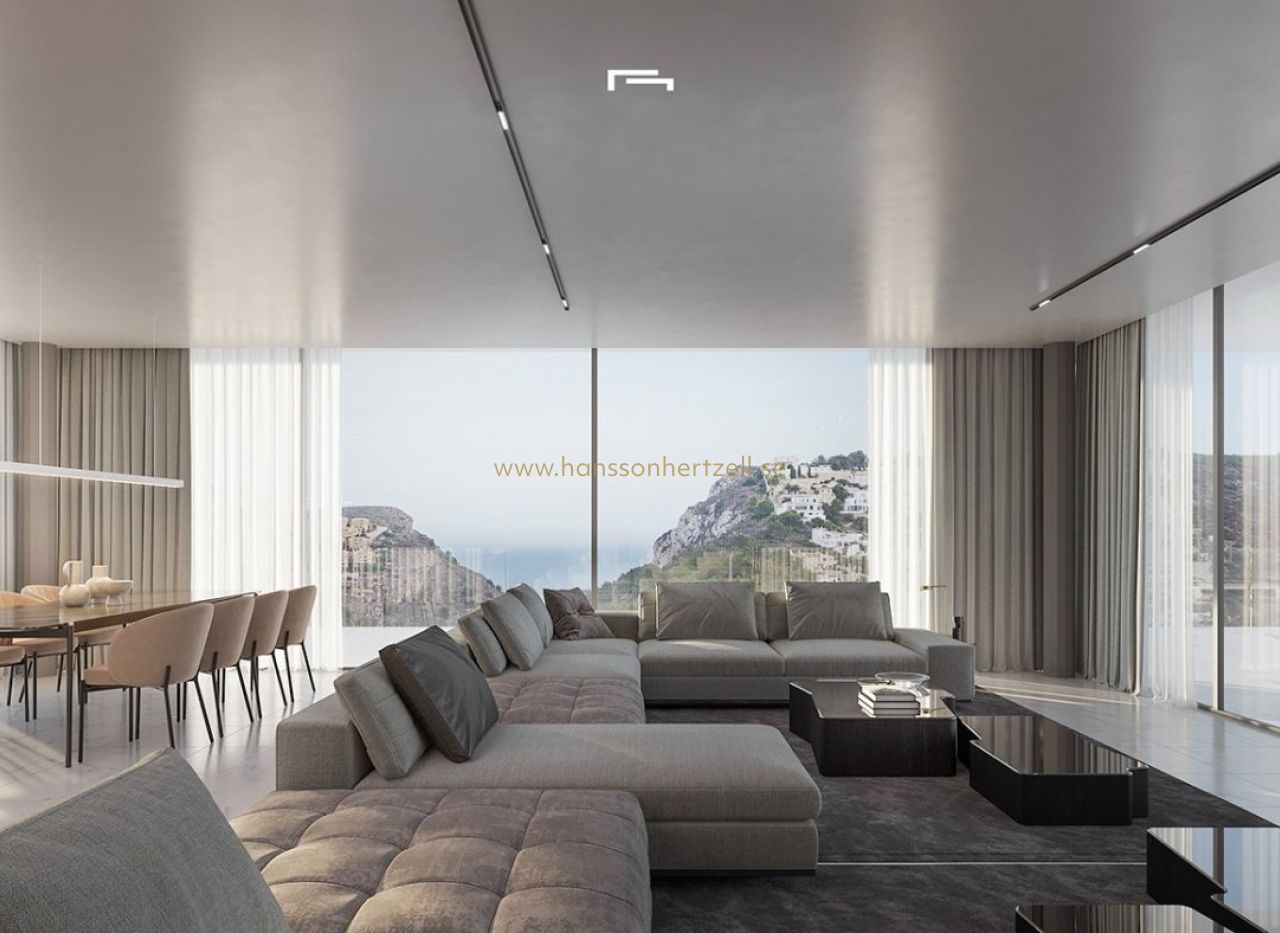 LYXIG NYBYGGD VILLA MED HAVSUTSIKT I MORAIRA Nybyggd lyxvilla med havsutsikt i Moraira. Villan uttrycker de inre utrymmena genom enkla, rena och framträdande geometrier. Den nås via en ramp och trappor som är integrerade i marken och som stöder den övre delen av huset på en stensockel som ger ingång till vardagsrummet. På bottenvåningen finns ett garage, en generös hall med tillträde bredvid en stor källare samt förråd och gym. På övervåningen finns sovrummen huvudrummen i huset, alla med badrum en suite och ett stort öppet utrymme på mer än 90m2 för att rymma ett flytande utrymme av kök matsal och vardagsrum i en 180º panoramautsikt över landskapet. Allt detta utrymme är omgivet av en rymlig terrass, i den främre delen på vilken faller en veranda öppen på mer än 50m2, projicerar ut mot utsidan av husets interiör och förvandlar det till ett unikt utrymme. Ett unikt geometriskt stycke som ger några imponerande vyer över landskapet och har praktiskt och noggrant sätt programmet och funktionaliteten inuti. Husets geometriska renhet och design överförs från den arkitektoniska kompositionen till utförandet av minsta detalj. Toppmoderna tekniska och konstruktionslösningar har valts för att överföra den senaste utvecklingen på marknaden till hemmet. Allt detta för att uppnå ett lyxigt hem med maximala fördelar och med en utsökt design. Moraira är en liten stad med bra restauranger, barer och gott om stormarknader runt omkring. Det finns en mycket trevlig strand precis intill staden som är utmärkt för familjer. Från strandpromenaden har man en fantastisk utsikt över Penon Ifach på andra sidan bukten i Calpe. Kustvägen dit är väl värd att gå med spektakulära vyer. Moraira ligger ungefär 1 timme och 15 minuter norrut på A7 från Alicantes flygplats och är ganska lätt att ta sig till. Det är ungefär lika långt eller lite mindre söderut från Valencias flygplats.