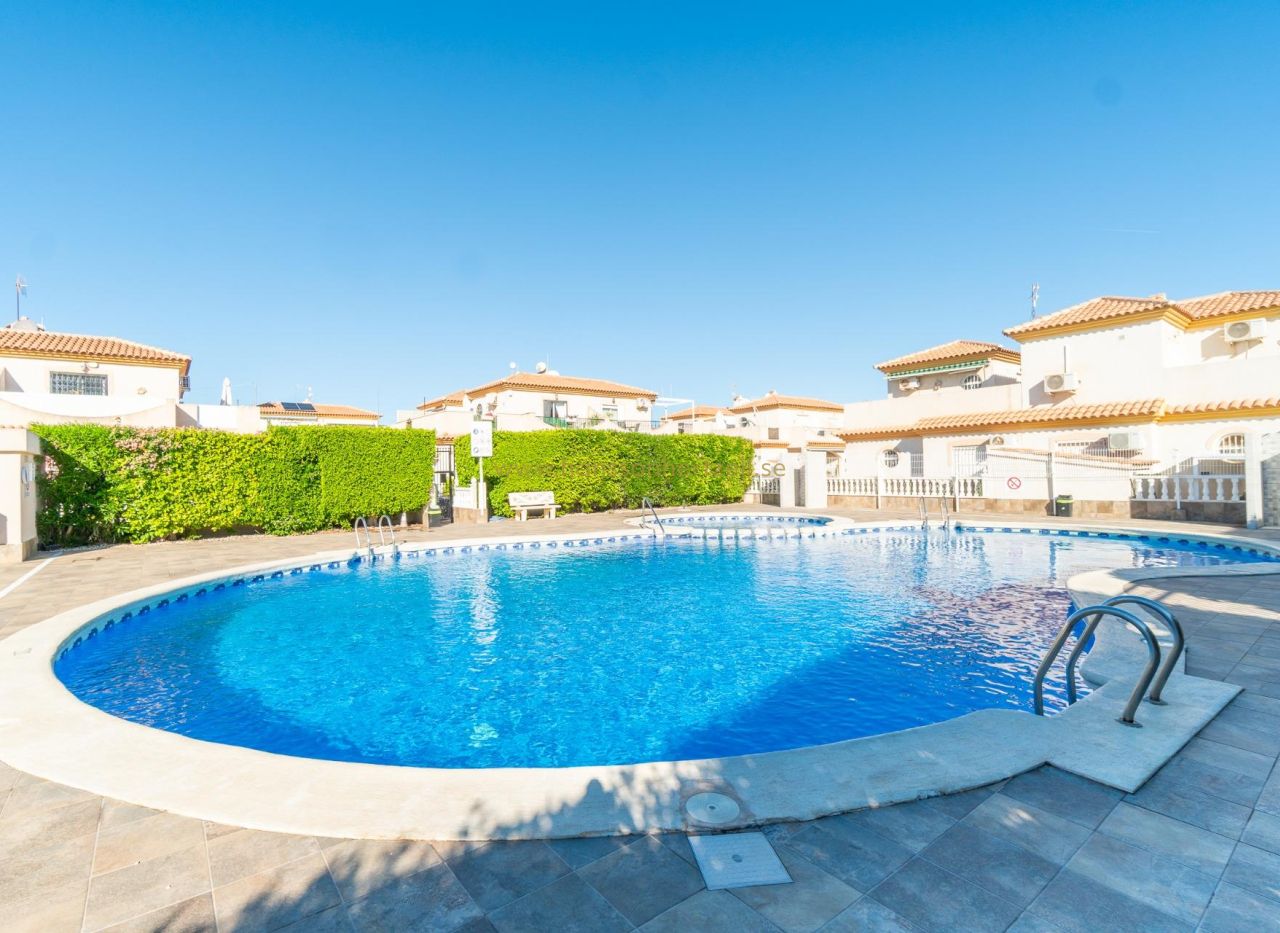 Detta förtjusande hus i Playa Flamenca förkroppsligar det mediterrana kustlivet i hjärtat av Orihuela Costa. De 63m² byggda ytan maximerar utrymmeseffektivitet medan den imponerande 45m² terrassen utökar ditt vardagsrum under den spanska solskenen, skapande den perfekta miljön för avslappnad utomhusmys.