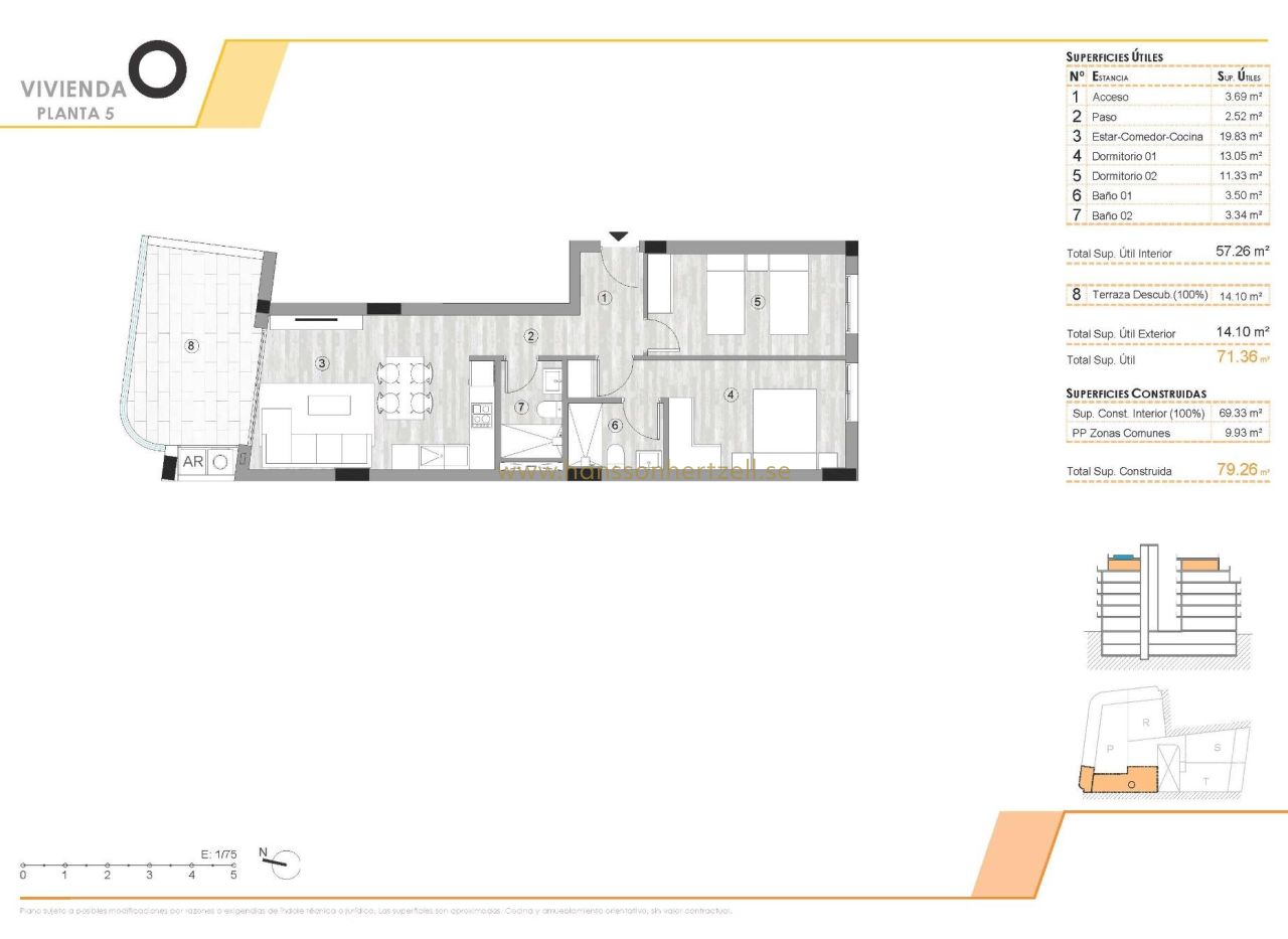 Nybyggda lägenheter i hjärtat av Torrevieja, bara 400 m från Playa del Cura Bäst läge i centrala Torrevieja Denna nya bostadsbyggnad har ett oslagbart läge i centrala Torrevieja, bara 400 m från Playa del Cura. Omgiven av butiker, stormarknader, restauranger och dagliga tjänster erbjuder den allt du behöver inom gångavstånd. Området har också tillgång till parker, fritidsområden och grönområden, vilket skapar en perfekt balans mellan urban bekvämlighet och avkoppling. Moderna bostäder med 2 och 3 sovrum Bostadsområdet erbjuder ett urval av lägenheter med 2 och 3 sovrum, inklusive takvåningar, varav några med privata solterrasser. Varje bostad är designad i modern stil med öppen planlösning, stora terrasser och integrerade kök i amerikansk stil. Badrummen är fullt utrustade med möbler, duschväggar och golvvärme. Köken har vitvaror och varje lägenhet har förinstallation för luftkonditionering. Valfri underjordisk parkering och förråd finns tillgängliga. Resortliknande faciliteter för välbefinnande Boende kan njuta av en rad exklusiva bekvämligheter. På bottenvåningen finns ett fullt utrustat gym, perfekt för dagliga träningspass. Solterrassen på taket är en verklig oas för avkoppling med solstolar, finsk bastu och minipool. Både hiss och trappor leder direkt till taket för maximal bekvämlighet och tillgänglighet. Bo i en unik natur- och kustmiljö Torrevieja är känt för sitt varma medelhavsklimat, med en genomsnittlig årstemperatur på 20 °C, vilket gör det till en perfekt plats att bo på året runt. Staden är känd för sina naturliga saltlaguner och den skyddade naturparken La Mata och Torrevieja, som ligger bara 4 km från anläggningen. Dess rosa och gröna sjöar, natursköna vandringsleder och rika biologiska mångfald erbjuder en hälsosam och inspirerande livsstil. Avstånd till viktiga sevärdheter Playa del Cura 0,4 km Torrevieja Marina 1 km La Mata naturpark 4 km Villamartin Golf 8 km Alicante flygplats 45 km Murcia flygplats 60 km Upplev den medelhavska livsstilen Missa inte chansen att äga ett modernt hem i en av Costa Blancas mest eftertraktade kuststäder. Kontakta oss idag för att boka en visning och säkra din plats i detta exceptionella nya bostadsområde.
