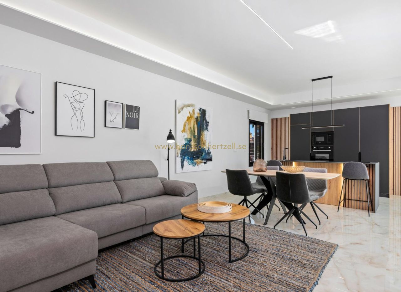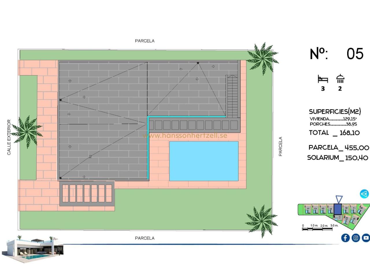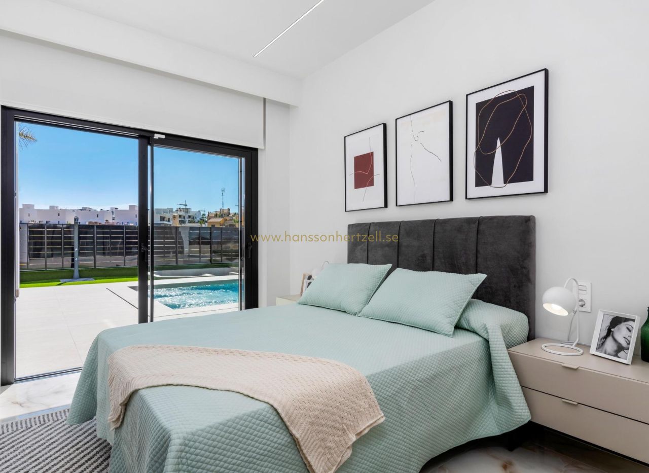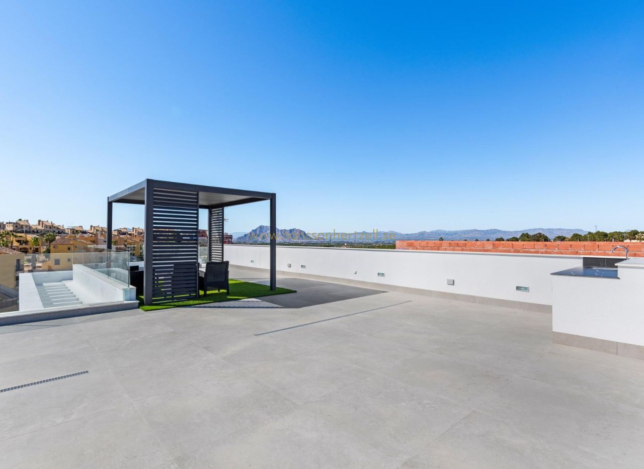 Nybyggda lyxvillor i La Finca Golf, Algorfa Exklusiva envåningsvillor intill Golf La Finca i södra Costa Blanca Upptäck detta exklusiva nybyggnadsprojekt med 11 fristående villor beläget inom det prestigefyllda La Finca Golf Resort i Algorfa, ett av de mest eftertraktade områdena i Vega Baja, Costa Blanca South. Omgivet av gröna landskap, citrusodlingar och böljande fairways erbjuder denna plats lugn, avskildhet och en högkvalitativ medelhavslivsstil, samtidigt som den ligger nära alla viktiga tjänster och attraktioner vid kusten. Moderna villor i ett plan med privat pool och solarium Varje villa är omsorgsfullt utformad i ett plan och erbjuder komfort och funktionalitet i hela huset. Fastigheterna har 3 rymliga sovrum och 2 moderna badrum, ett öppet kök i amerikansk stil och ett ljust vardagsrum och matrum med stora fönster som vetter direkt mot terrassen och den privata trädgården. Utomhus har varje villa en privat pool, parkeringsplats på tomten och ett imponerande privat solarium på 150 kvm, perfekt för att njuta av solen året runt. För köpare som önskar extra utrymme finns möjlighet att lägga till en källare eller ett fjärde sovrum på övervåningen mot en extra kostnad, så att du kan anpassa hemmet efter dina personliga behov. Högkvalitativa specifikationer och eleganta ytbehandlingar Dessa villor är byggda med förstklassiga material och ytbehandlingar för att garantera komfort, effektivitet och modern stil. Funktionerna inkluderar en förstärkt säkerhetsdörr, motoriserade fönsterluckor, fullt utrustade kök med vitvaror och badrum med möbler, speglar och duschväggar. Solariet på taket levereras med ett sommarkök och pergola, vilket skapar den perfekta miljön för utomhusmåltider och avkoppling. Ett LED-belysningspaket för interiör och exteriör ingår också, vilket förbättrar både design och atmosfär. Utmärkt läge i La Finca Golf Resort La Finca Golf Resort är känt för sin mästerskapsgolfbana, lyxhotell, spafaciliteter, restauranger och idrottsområden, allt i en säker och välskött miljö. Algorfa är en charmig spansk by med en avslappnad atmosfär, lokala butiker och traditionella restauranger, medan närliggande städer erbjuder ett bredare utbud av tjänster. Viktiga avstånd La Finca Golf Club: på plats Guardamar del Seguras stränder: 15 km Torrevieja och Orihuela Costas shoppingcenter: 15 km Almoradi, Benijofar och Ciudad Quesada: 5 till 10 km Alicantes internationella flygplats: 35 km Medelhavslivsstil och smart investering Med över 300 soldagar per år, utmärkta vägförbindelser och närhet till stränder, golfbanor och affärsområden är dessa villor idealiska som permanentbostad, semesterbostad eller investeringsmöjlighet på Costa Blanca. Säkra din nya villa i La Finca Golf idag Missa inte chansen att äga en modern villa i en av de mest exklusiva golfresorterna i Algorfa. Kontakta oss idag för mer information eller för att boka en privat visning.