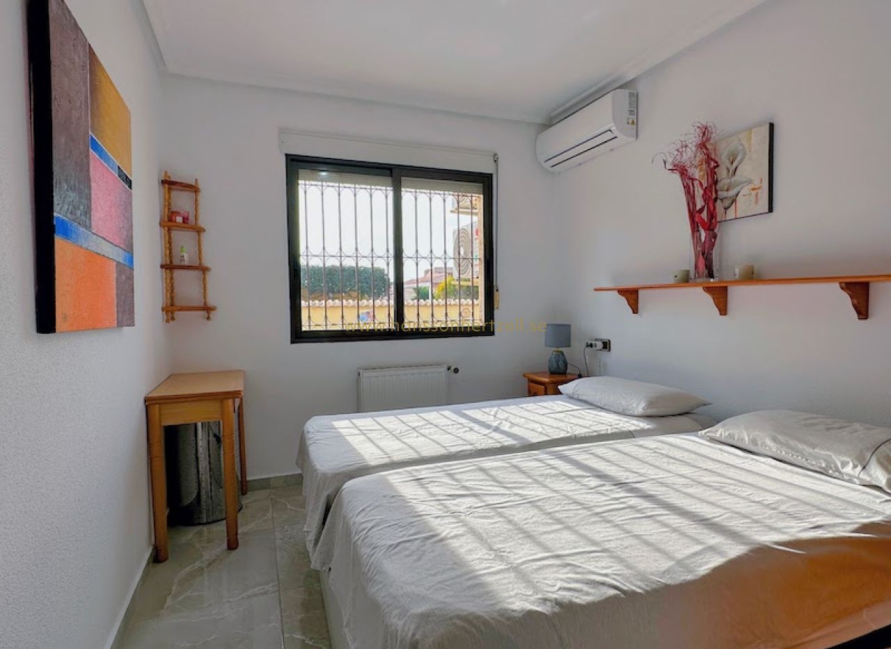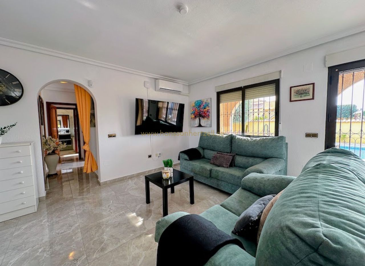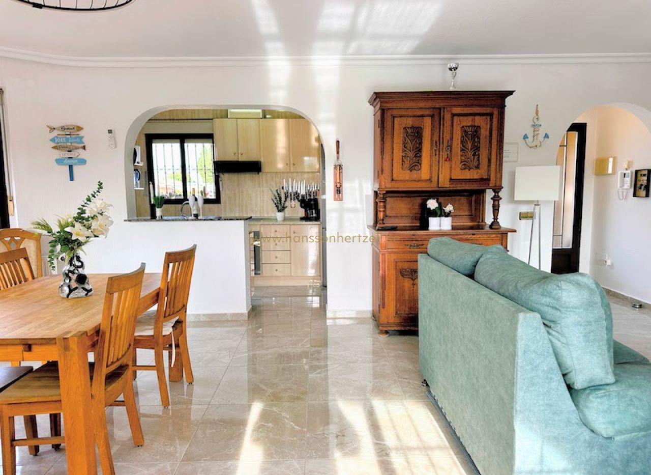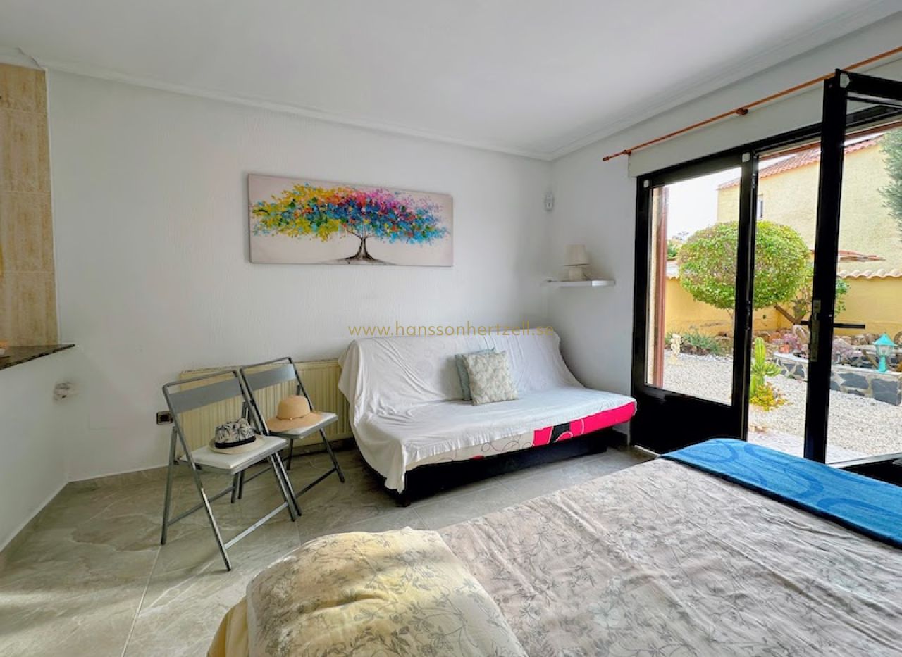 Huvudbostaden har tre bekväma sovrum och två badrum, inklusive ett en-suite med renoverade armaturer. Det öppna vardagsrummet flyter sömlöst in i ett integrerat kök med ett rymligt skafferi, vilket skapar ett idealiskt utrymme för familjesammankomster. Stora glasdörrar öppnas mot den söderläge terrassen, som översvämmar hemmet med naturligt medelhavs ljus och leder direkt till det inbjudande poolområdet.