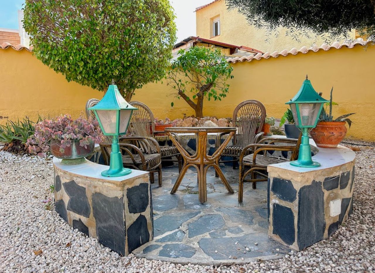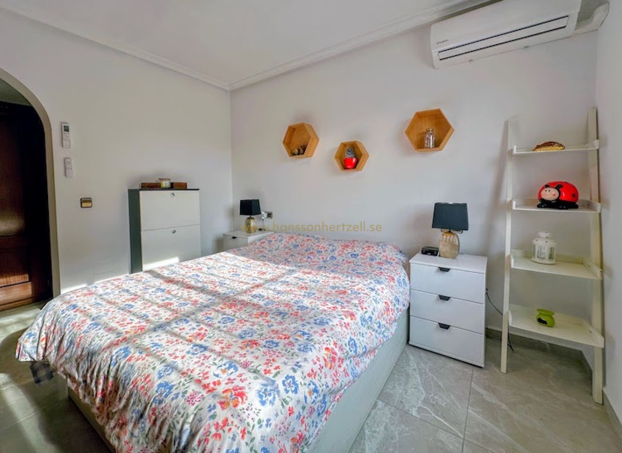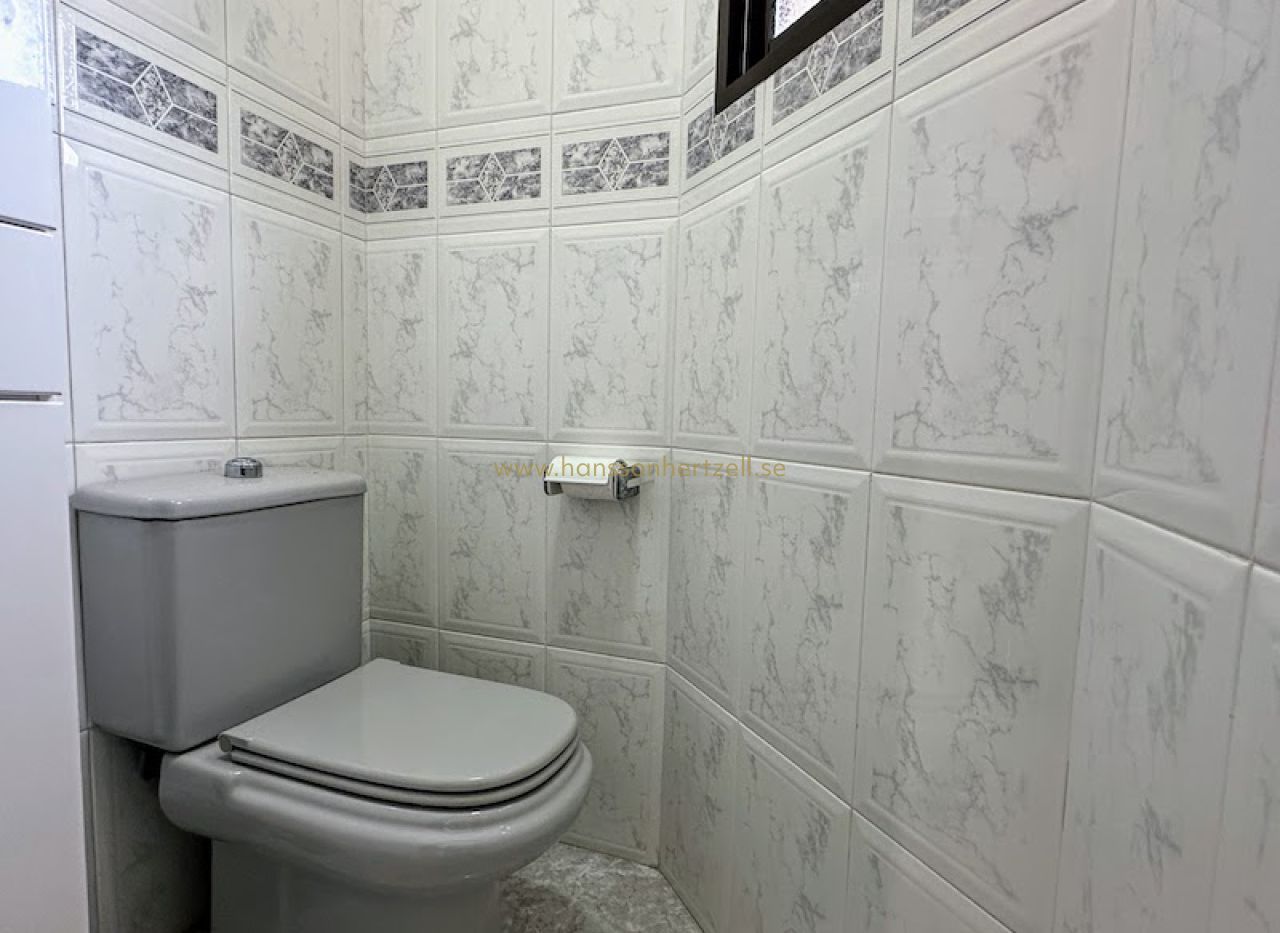 Huvudbostaden har tre bekväma sovrum och två badrum, inklusive ett en-suite med renoverade armaturer. Det öppna vardagsrummet flyter sömlöst in i ett integrerat kök med ett rymligt skafferi, vilket skapar ett idealiskt utrymme för familjesammankomster. Stora glasdörrar öppnas mot den söderläge terrassen, som översvämmar hemmet med naturligt medelhavs ljus och leder direkt till det inbjudande poolområdet.