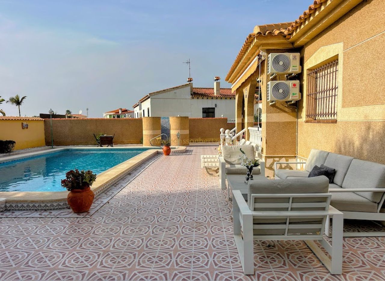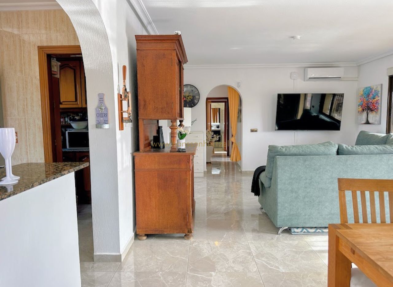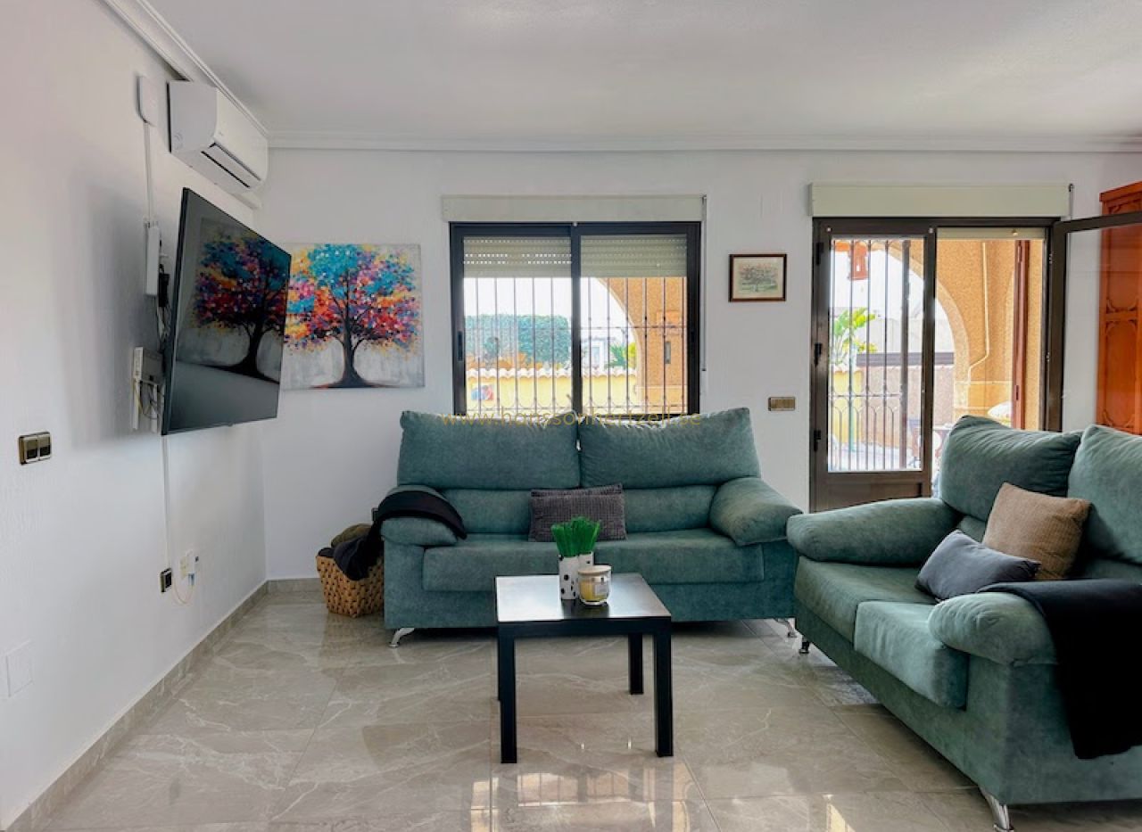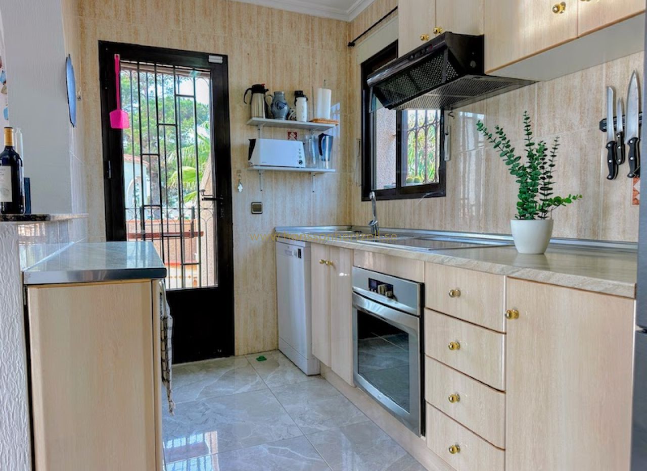 Huvudbostaden har tre bekväma sovrum och två badrum, inklusive ett en-suite med renoverade armaturer. Det öppna vardagsrummet flyter sömlöst in i ett integrerat kök med ett rymligt skafferi, vilket skapar ett idealiskt utrymme för familjesammankomster. Stora glasdörrar öppnas mot den söderläge terrassen, som översvämmar hemmet med naturligt medelhavs ljus och leder direkt till det inbjudande poolområdet.