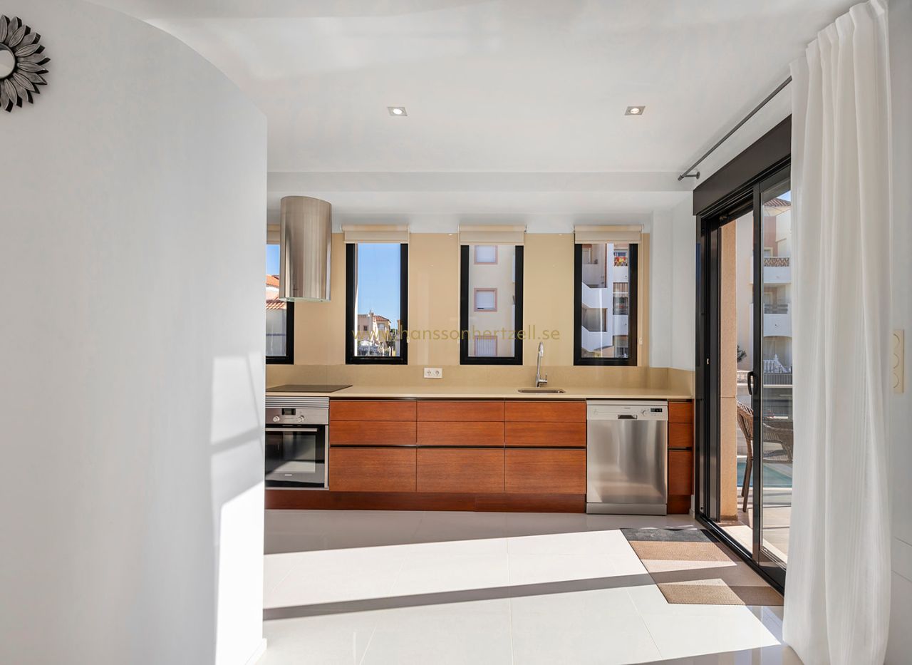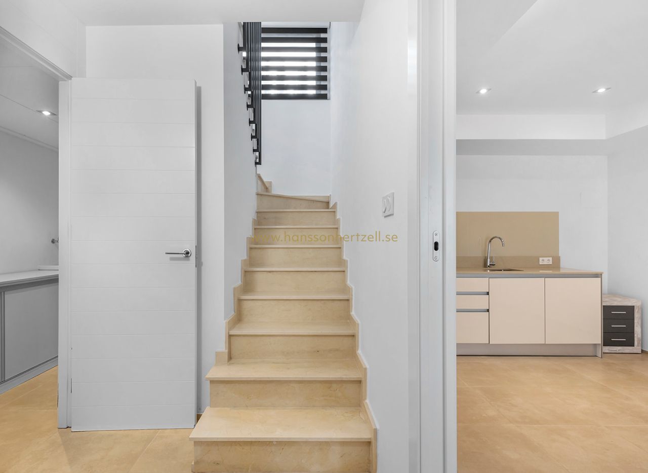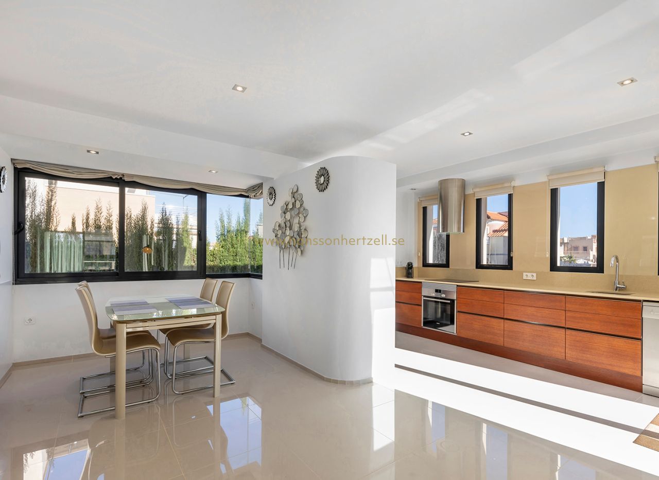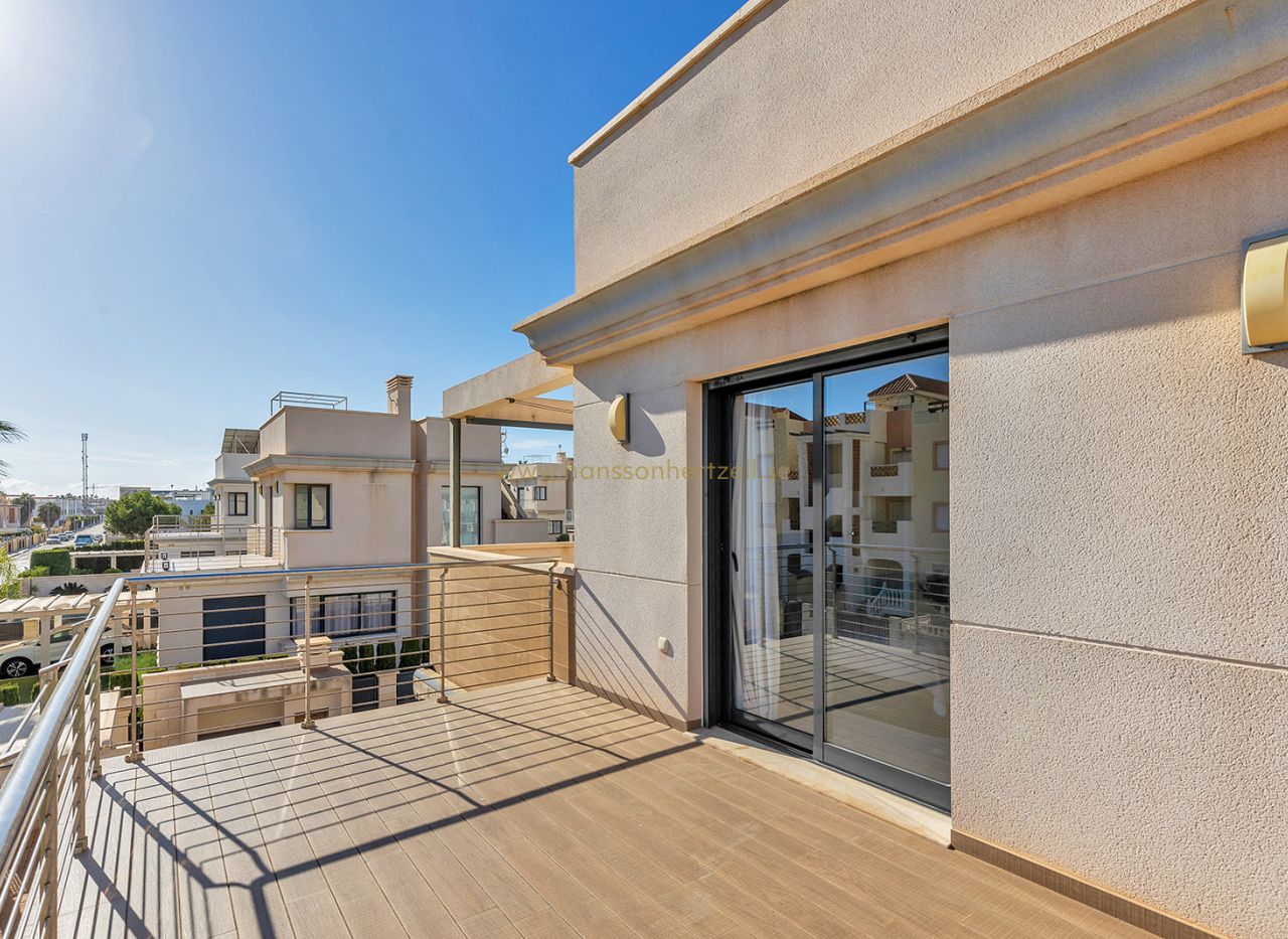 Exteriören har en privat swimmingpool och spektakulärt 46m² solarium på översta våningen, perfekt för att njuta av medelhavsklimatet. Villan levereras fullt möblerad och redo att njutas av i detta exklusiva bostadsområde i La Zenia.