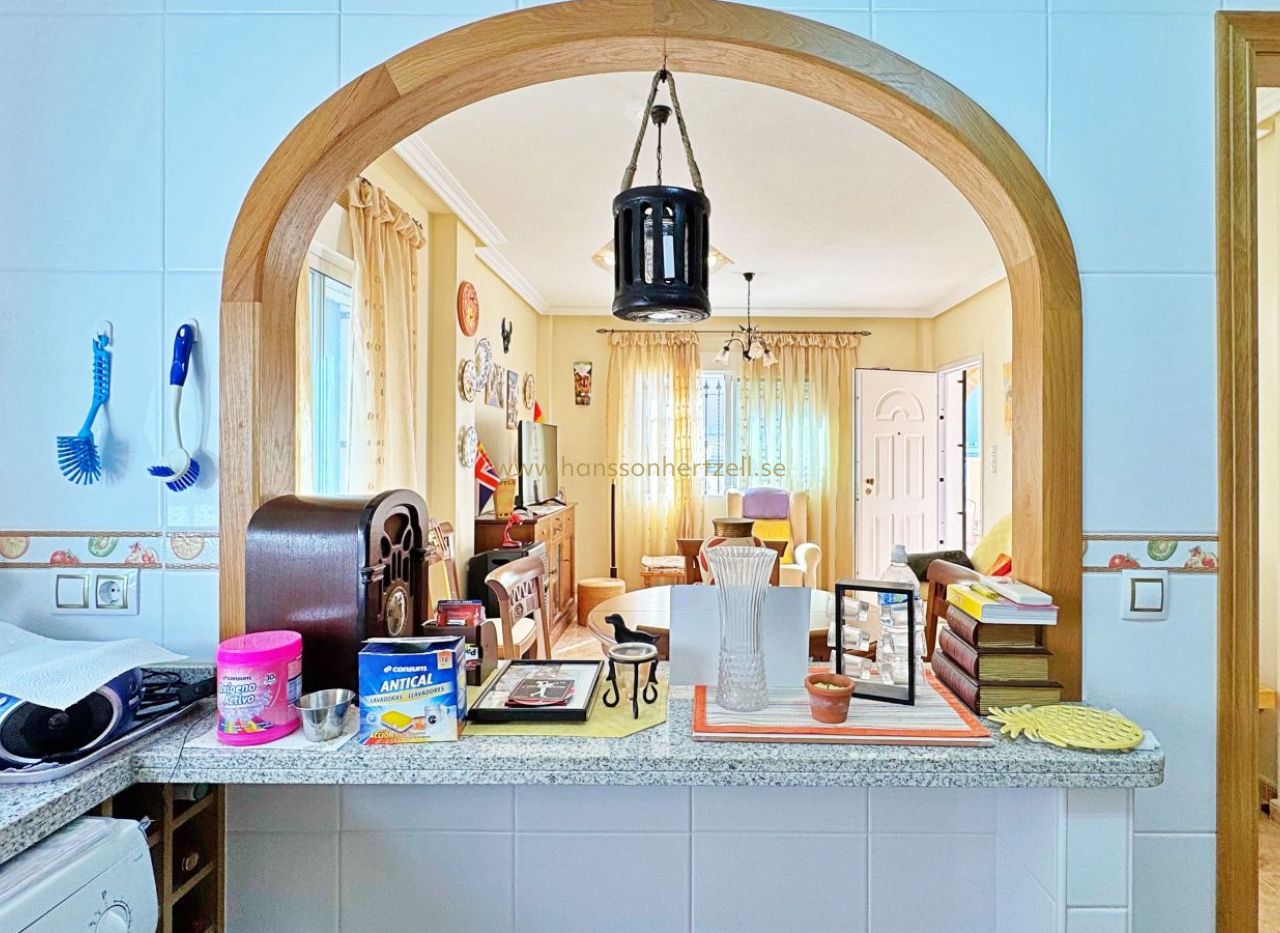 Den inre layouten består av ett ljust vardagsrum-matsal, oberoende utrustat kök, tre rymliga sovrum och två kompletta badrum. Fastigheten levereras fullt möblerad med kvalitetsfinish och inbyggda garderober. Varje rum är designat för att maximera komfort och funktionalitet på Costa Blanca.