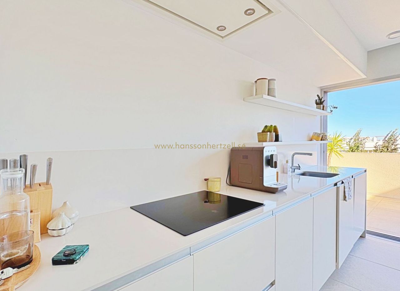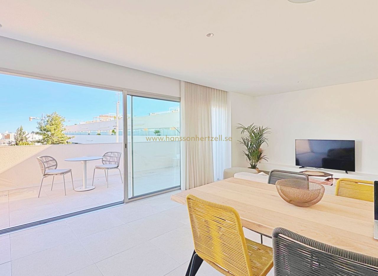 Exklusiv penthouse 3 sovrum, 2 badrum i Los Balcones, Torrevieja. 84m² plus 75m² solarium för €360.000. Underjordisk parkering inkluderad, utsikt över Medelhavet och Rosa Saltsjöar. 4km från strand, fullt möblerad.