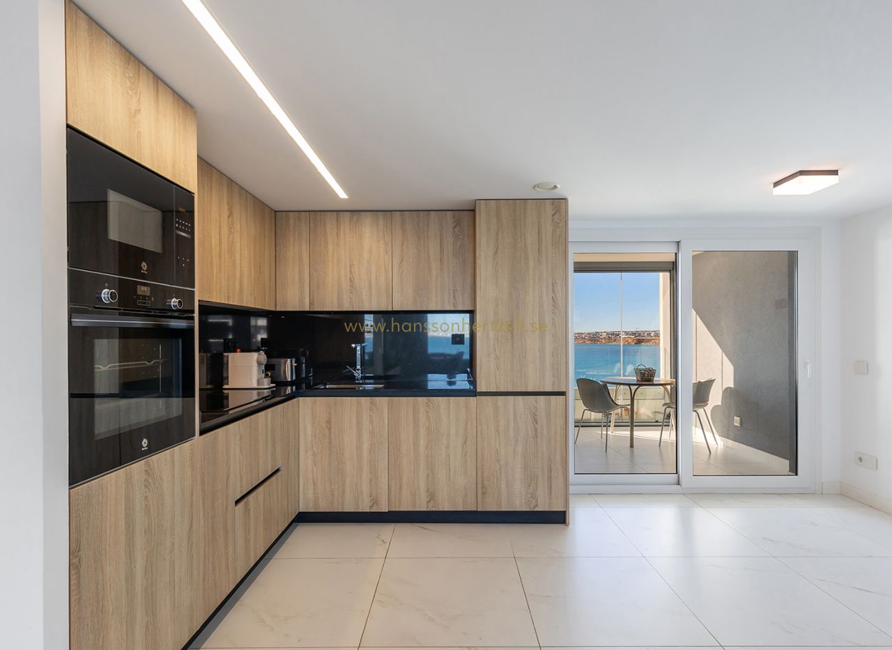 Upptäck denna exklusiva 2-rums, 2-badrum lägenhet på 5:e våningen i det prestigefyllda Posidonia komplexet i Punta Prima, Torrevieja. Med 122m² byggd yta och belägen bara 50 meter från havet, erbjuder denna unika fastighet obehindrad utsikt över Torreviejas bukt och nord-syd orientering för naturligt ljus hela dagen.
