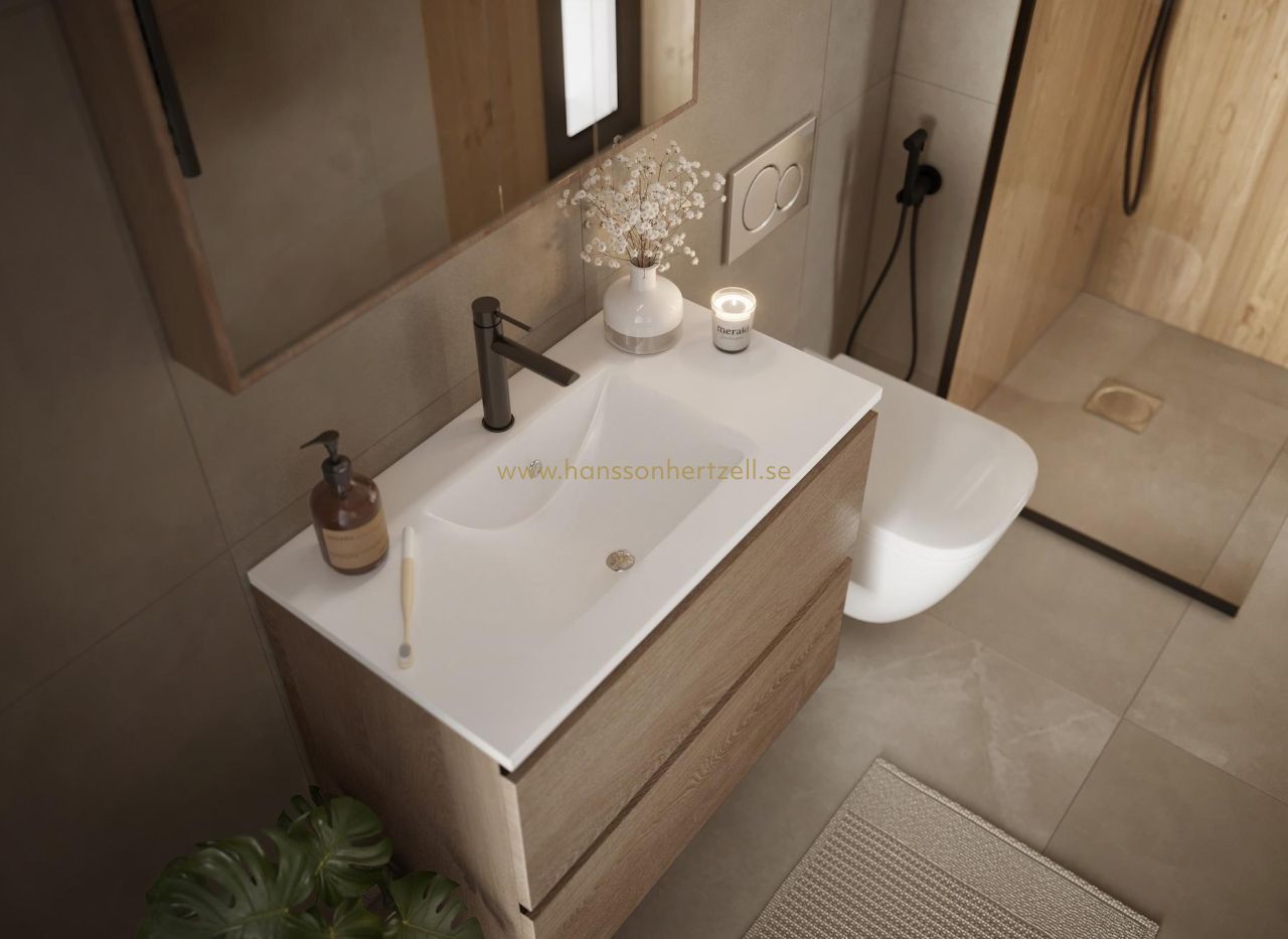 Nya hus i skandinavisk stil i Aguas Nuevas Torrevieja Exklusivt nytt bostadsprojekt Välkommen till detta spännande nya bostadsprojekt i Aguas Nuevas, ett av de mest eftertraktade områdena i Torrevieja. Detta moderna projekt omfattar totalt 31 bostäder, inklusive 16 eleganta lägenheter och 15 rymliga villor, alla designade med högkvalitativa material och planlösningar anpassade till det moderna medelhavslivet. Projektet kombinerar komfort, design och ett utmärkt läge nära havet och alla dagliga bekvämligheter. Skandinaviskinspirerad design och naturligt ljus Husen är inspirerade av skandinavisk arkitektur, med öppna planlösningar, rena linjer och stora fönster som fyller varje rum med naturligt ljus. Denna design skapar ljusa, luftiga och välkomnande hem med en stark känsla av rymd och komfort, idealiska för både permanent boende och semester på Costa Blanca. Moderna lägenheter med privata utomhusområden Lägenheterna har 2 sovrum och 2 badrum, inklusive ett master bedroom med eget badrum. Lägenheterna på bottenvåningen har privata trädgårdar, medan lägenheterna på mellanvåningarna och takvåningarna har generösa terrasser som är perfekta för uteservering och avkoppling. Alla lägenhetshus är utrustade med hissar, vilket garanterar komfort och tillgänglighet för alla boende. Rymliga villor med privat pool Villorna har 3 sovrum och 3 badrum fördelade på två våningar samt ett privat solarium. Varje villa har en privat pool och golvvärme som drivs av aerotermisk energi, vilket ger komfort och energieffektivitet året runt. Dessa bostäder är perfekta för dig som söker avskildhet, utrymme och en förstklassig livsstil nära stranden. Kvalitetsdetaljer och gemensamma utrymmen Alla bostäder har elektriska persienner, pansrade entrédörrar, fullt utrustade badrum med möbler, spegel och elektrisk handdukstork, aerotermiskt system för varmvatten, fullt installerad luftkonditionering, privat parkering och ett interiörbelysningspaket. De gemensamma utrymmena inkluderar en vacker pool, ett fullt utrustat gym och praktiska parkeringsplatser för bilar och cyklar, vilket uppmuntrar till en aktiv och avslappnad livsstil. Utmärkt läge i Torrevieja Aguas Nuevas är ett väl etablerat bostadsområde känt för sin utmärkta infrastruktur, stormarknader, restauranger och närhet till kusten. Stranden ligger bara 0,8 km bort, medan Torreviejas livliga centrum med sin strandpromenad, småbåtshamn och fritidsaktiviteter ligger bara några minuter bort med bil eller buss. Området har ett hälsosamt medelhavsklimat och är omgivet av naturområden och saltsjöar. Avstånd till sevärdheter Stranden 0,8 km Torrevieja Marina 3 km La Mata-stranden 2,5 km Las Salinas naturpark 2 km Villamartin Golf 10 km Alicante flygplats 42 km Ditt nya hem på Costa Blanca Denna nya bostadsutveckling i Aguas Nuevas erbjuder ett utmärkt tillfälle att köpa ett högkvalitativt hem till ett konkurrenskraftigt pris i ett av Torreviejas mest eftertraktade områden. Kontakta oss idag för att få mer information eller boka ett besök och säkra ditt nya hem vid Medelhavet.