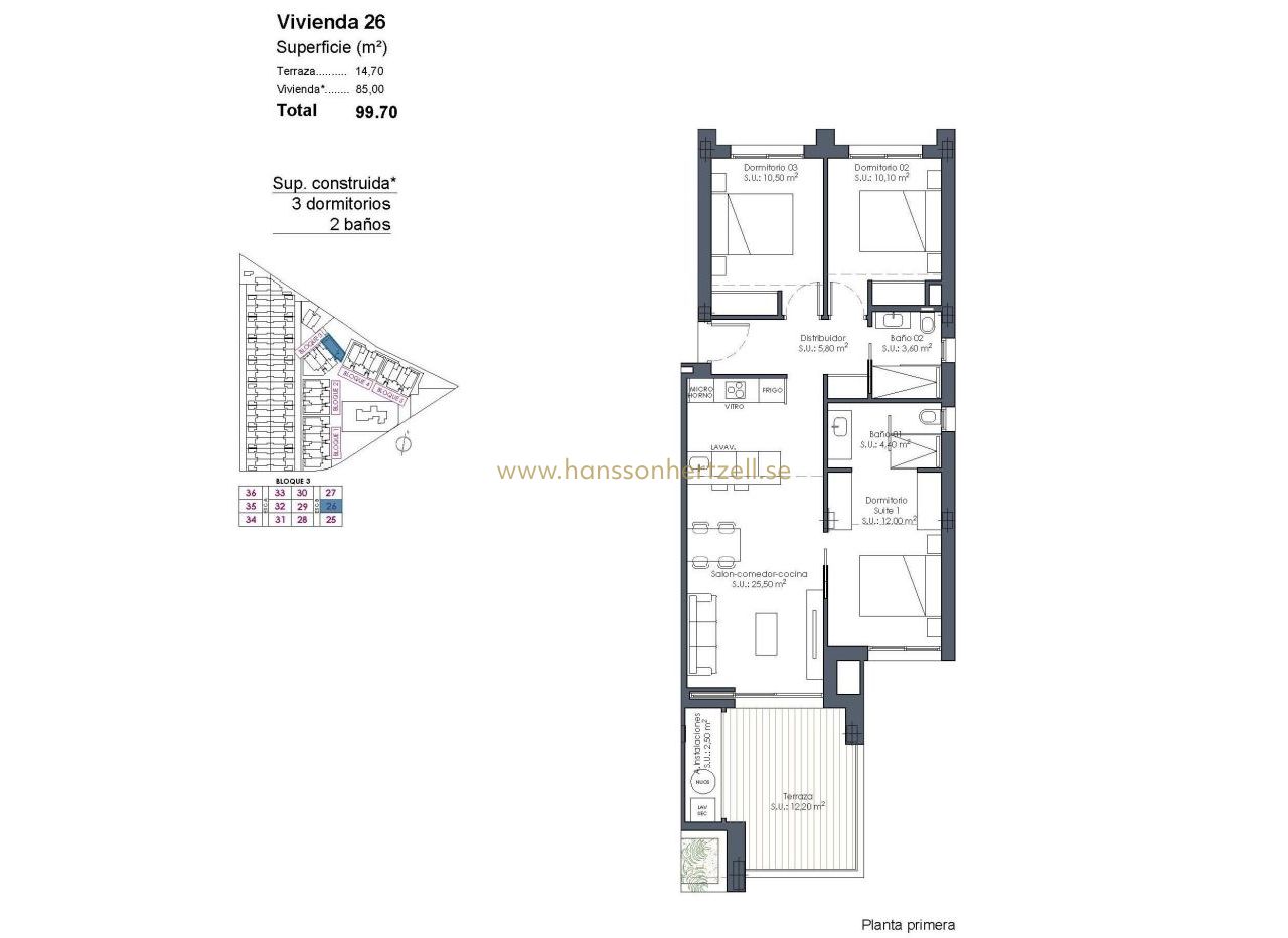 Nybyggda semesterlägenheter vid La Serena Golf-Los Alcazares nära stranden Modernt boende vid golfbanan på Costa Calida Upptäck denna exklusiva nybyggda semesteranläggning vid La Serena Golf i Los Alcazares. Detta moderna bostadsområde består av 66 eleganta lägenheter med 2 eller 3 sovrum och 2 badrum, varav ett är en suite, utformade för att erbjuda komfort, elegans och en exceptionell medelhavslivsstil bara 300 meter från Mar Menor. Los Alcazares är en charmig kuststad känd för sin avslappnade atmosfär, sandstränder och långa strandpromenad. Med mer än 300 soldagar per år erbjuder området en perfekt miljö för utomhusliv, vattensporter och golf. Staden erbjuder också ett brett utbud av restauranger, butiker, småbåtshamnar och idrottsanläggningar, vilket gör den till en mycket eftertraktad destination för både permanent boende och semesterbostäder. Lägenheter med terrasser, trädgårdar och privata solarium Bostadskomplexet erbjuder flera olika typer av fastigheter som passar olika livsstilar. Köpare kan välja mellan lägenheter på bottenvåningen med privata trädgårdar, lägenheter på mellanvåningen med rymliga terrasser eller takvåningar med terrasser och stora solarium på taket. Solarium har en utomhusdusch och erbjuder möjlighet att lägga till ett sommarkök och privat jacuzzi, vilket skapar en idealisk plats för avkoppling och underhållning medan man njuter av den öppna utsikten över golfbanan och det omgivande landskapet. Varje bostad har designats med ljusa interiörer och öppna vardagsrum som smidigt ansluter till utomhusområdena. Resortliknande bekvämligheter och exceptionella gemensamma utrymmen En av de mest utmärkande egenskaperna hos detta projekt är dess resortliknande koncept. Boende kan njuta av en spektakulär lagunliknande pool på cirka 190 m2 med strandliknande tillgång och relaxavdelningar med balinesiska sängar. Ytterligare gemensamma faciliteter inkluderar anlagda trädgårdar, ett spaområde, gym och bastu i källarplanet. Komplexet erbjuder även en lekplats, två petanquebanor och gemensamma toaletter nära poolområdet, vilket skapar en välkomnande miljö för boende och gäster. Högkvalitativa ytbehandlingar och moderna funktioner Lägenheterna är byggda med moderna material och högkvalitativa specifikationer utformade för komfort och stil. Fullt utrustat kök med vitglasade vitvaror Badrum med tvättställ, duschväggar och bakgrundsbelysta speglar Motoriserade fönsterluckor Grundläggande belysningspaket Fullt installerad luftkonditionering Underjordisk parkeringsplats för varje fastighet Underjordisk cykelparkering och valfria förråd Utmärkt läge nära stranden och golfbanan Mar Menor-stranden 0,3 km La Serena Golf intill anläggningen Los Alcazares centrum 2 km Cartagena 22 km Murcia 40 km Region de Murcia internationella flygplats 30 km Alicante Elche flygplats 90 km Det lugna och grunda vattnet i Mar Menor är perfekt för simning, segling och paddelsurfing året runt. Säkra ditt hem på La Serena Golf Resort Dessa moderna lägenheter kombinerar strandnära boende, utsikt över golfbanan från de flesta lägenheterna och resortliknande bekvämligheter i ett av de mest attraktiva områdena på Costa Calida. Kontakta oss idag för att få mer information eller boka ett besök och säkra ditt nya hem i La Serena Golf-Los Alcazares.