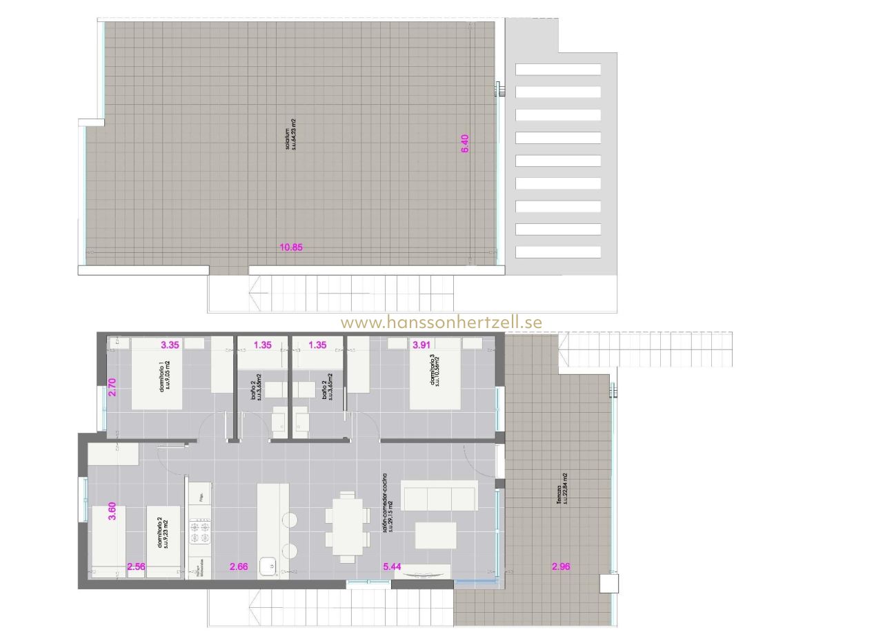Nybyggda bungalower med trädgård eller solarium nära stranden i Pilar de la Horadada Moderna medelhavshus designade för komfort Upptäck detta exklusiva nybyggda bostadsområde i Pilar de la Horadada, som erbjuder moderna bungalower mindre än 2 km från stranden. Dessa hus är designade för att kombinera komfort, stil och funktionalitet och är perfekta för åretruntboende, semester eller som en smart investering på Costa Blanca. I komplexet kan du välja mellan bungalower på bottenvåningen med privata trädgårdar och bungalower på översta våningen med privata solarium på taket. Varje fastighet är omsorgsfullt utformad för att maximera utomhuslivet och dra nytta av det medelhavsklimatet. Rymliga bostäder med 2 sovrum och högkvalitativa ytbehandlingar Varje bungalow har 2 sovrum och 2 badrum, varav ett är en-suite, samt en privat parkeringsplats i det underjordiska garaget. Bostäderna är byggda med kvalitetsmaterial och moderna ytbehandlingar som garanterar energieffektivitet och hållbarhet. Viktiga funktioner inkluderar: Förinstallation för luftkonditionering Aluminiumfönster med dubbla glasrutor och motoriserade fönsterluckor Säkerhetsdörr för trygghet Aerotermiskt system för effektiv varmvattenproduktion Inbyggda garderober i alla sovrum Fullt utrustade badrum med möbler och duschväggar Dessa specifikationer ger ett bekvämt och praktiskt hem som passar alla årstider. Privat gemenskap med pool och anlagda trädgårdar Bostadsområdet är privat och säkert, med vackert anlagda gemensamma trädgårdar och en stor gemensam pool. Detta skapar en trevlig och avkopplande miljö där boende kan koppla av och njuta av det utmärkta klimatet. Bostadsområdet ligger strax utanför stadskärnan, vilket gör att boende kan promenera till stormarknader, restauranger, barer, skolor och viktiga tjänster utan att behöva bil. Utmärkt läge nära stränder och tjänster Pilar de la Horadada är en charmig spansk stad i den sydligaste delen av Costa Blanca, känd för sin livliga atmosfär, lokala butiker, traditionella torg och vänliga gemenskap. Sandstränderna Torre de la Horadada Beach och Mil Palmeras Beach ligger bara 2 km bort och erbjuder fin gyllene sand, en vacker strandpromenad och en småbåtshamn. Området är också idealiskt för cykling, promenader och utomhussporter. Avstånd till viktiga sevärdheter Lo Romero Golf 5 km La Zenia Boulevard 15 km Murcia Corvera flygplats 40 km Alicante flygplats 55 km Torre de la Horadada marina 3 km Boka ditt nya hem idag Missa inte denna möjlighet att äga en helt ny bungalow nära stranden i ett av de mest eftertraktade områdena på Costa Blanca. Kontakta oss idag för mer information och för att boka en visning.