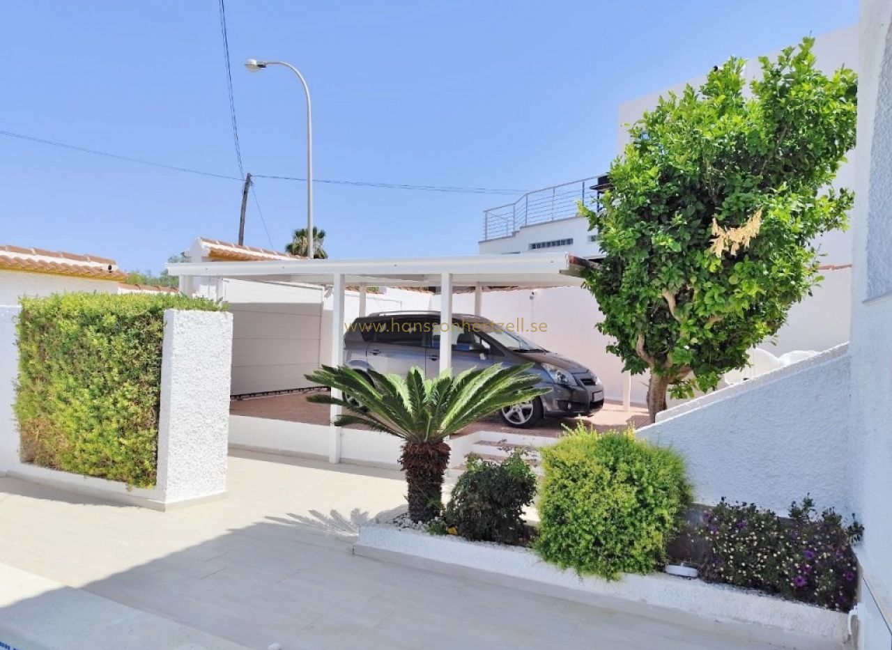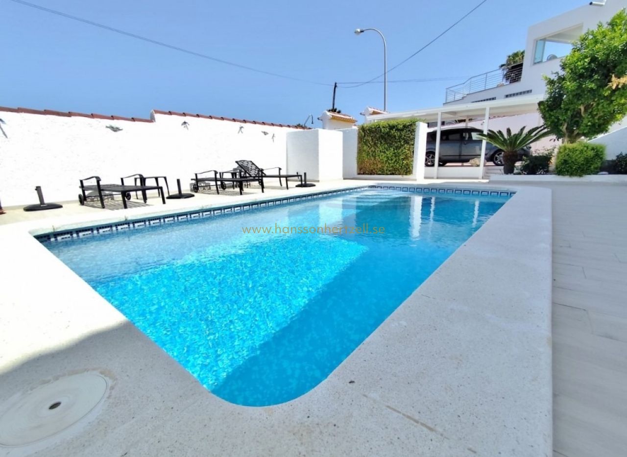 Denna fristående villa i San Miguel de Salinas erbjuder 187 m² boyta på en tomt om 625 m², till ett pris av 425 000 €. Fastigheten har en privat pool, en takterrass med utsikt över havet och saltsjöarna utanför Torrevieja, och säljs fullt möblerad och inflyttningsklar. Mil Palmeras strand ligger bara 12 minuters bilkörning bort och Alicante-Elche flygplats nås på ungefär 35 minuter.