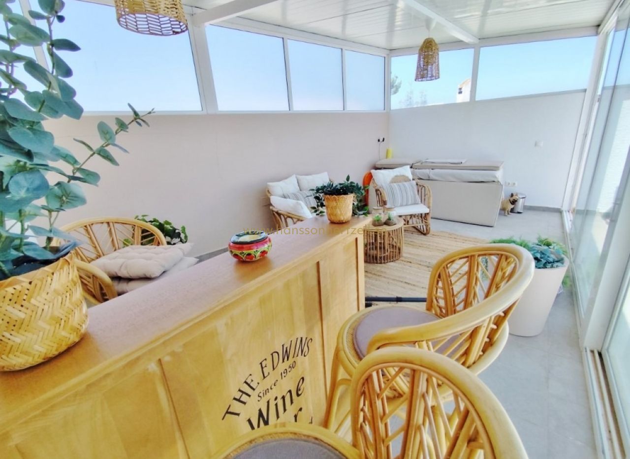 Utomhus är fastigheten lika imponerande. En privat pool är trädgårdens naturliga mittpunkt, kompletterad av en täckt terrass, en inglasad terrass, en bakre balkong, en främre balkong, en innergård, en grillplats, ett förvaringsutrymme och ett utomhusbadrum. Automatisk bevattning håller trädgården lättskött, och markiser ger välkommen skugga under sommarmånaderna. Carport för två bilar ingår. Takterrassen kröner fastigheten med en panoramautsikt över Medelhavet och de ikoniska saltsjöarna runt Torrevieja — ett av Costa Blancas mest karaktäristiska landskap.