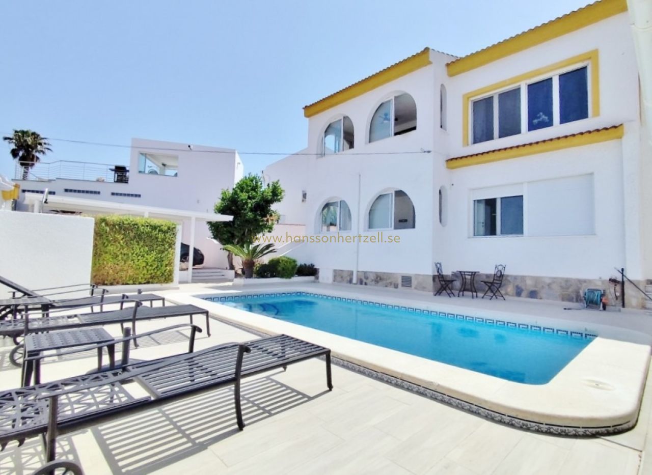Ja — med tillhörande turistlicens (Vivienda de Uso Turístico, VUT), utfärdad av de valencianska myndigheterna. En villa av denna storlek, med privat pool, fyra sovrum och havsutsikt från takterrassen, är väl lämpad för semesteruthyrning. Liknande fastigheter i södra Costa Blanca uppnår vanligtvis 1 200–1 800 €/vecka under högsäsong och 500–800 €/vecka under mellansäsong. Långtidsuthyrning ger typiskt 1 200–1 600 €/månad för en fastighet av denna storlek i området.