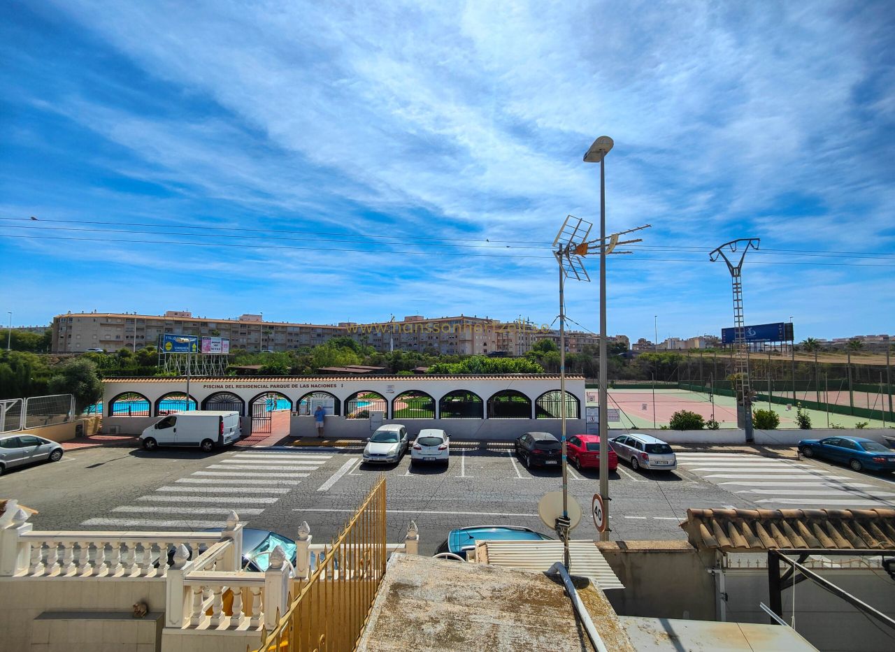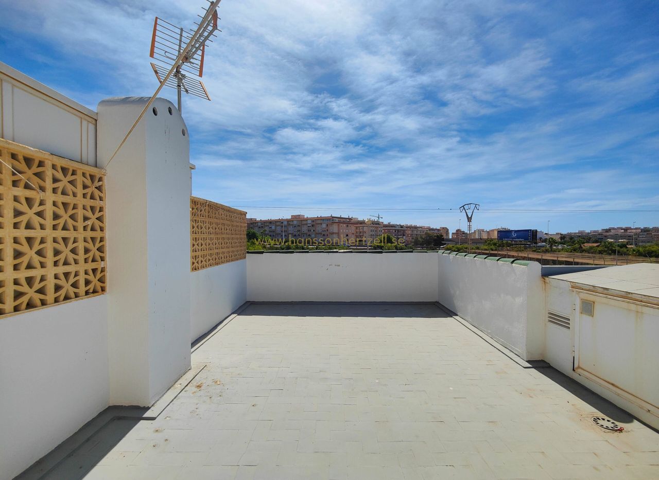 Charmant bungalow au dernier étage avec solarium privé à Torrevieja, situé dans l'exclusive urbanisation Parque de las Naciones. Cette propriété de 50m² se trouve à seulement 200 mètres de la plage Playa del Cura et offre une excellente opportunité d'investissement à €159,500.