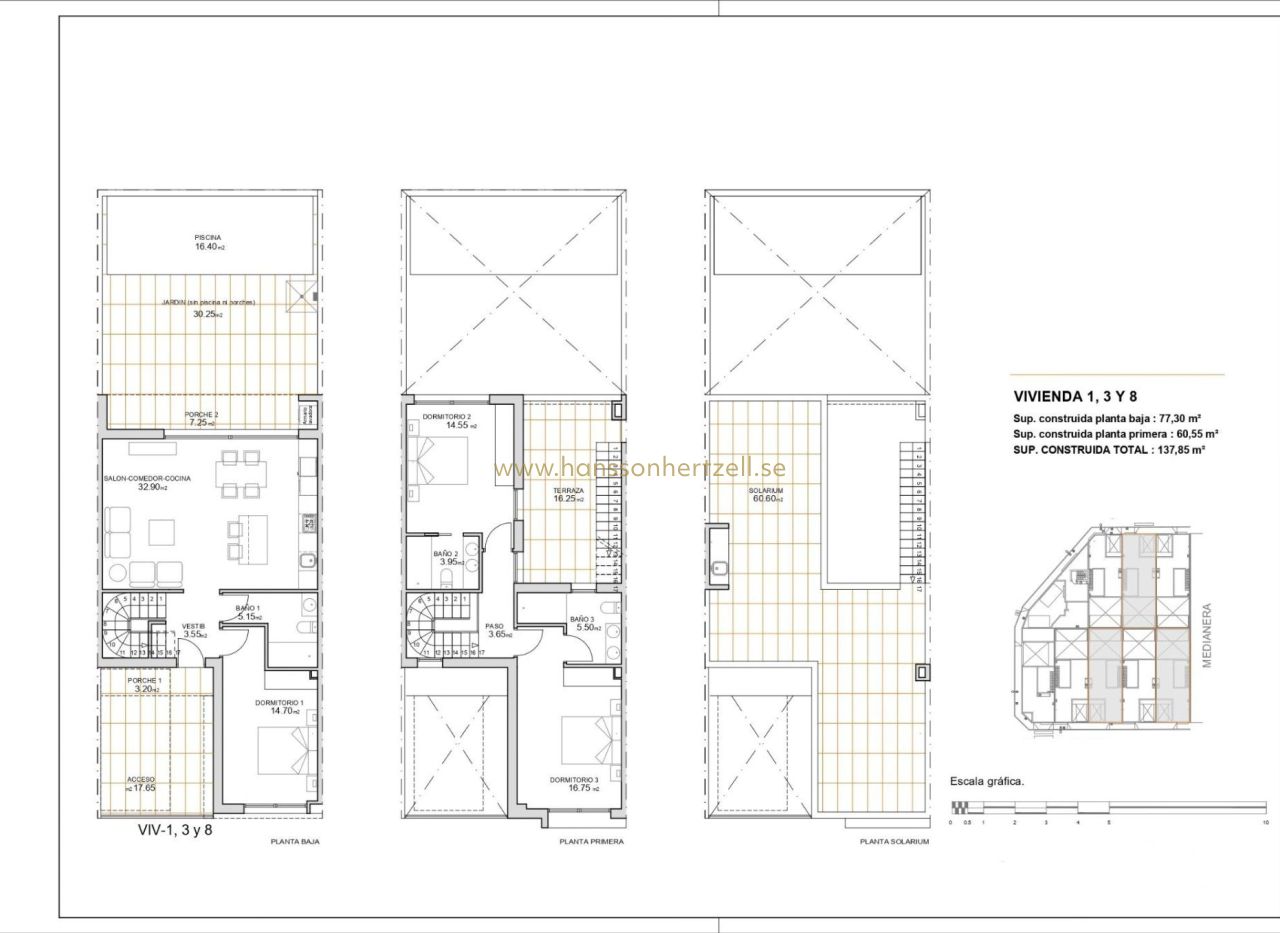 Maisons de ville nouvellement construites à San Javier - Design moderne et emplacement privilégié Maisons de ville au design contemporain avec piscine privée Découvrez ce complexe exclusif de 9 maisons de ville flambant neuves à San Javier, Murcie, conçues pour offrir un maximum de confort et un style de vie moderne. Chaque propriété dispose d'une piscine privée, d'une terrasse, d'un solarium et d'une place de parking, ce qui constitue un espace idéal pour se détendre et profiter de la vie tout au long de l'année. Les maisons ont été construites avec des matériaux de haute qualité et une conception ouverte qui tire le meilleur parti de la lumière naturelle. Elles sont parfaites à la fois pour une résidence permanente et pour une maison de vacances sur la Costa Cálida. Distribution et équipement de haute qualité Chaque maison de ville dispose de 3 chambres spacieuses avec placards et commodes. 3 salles de bains entièrement équipées avec meubles, miroirs et écrans. Cuisine ouverte, entièrement équipée et avec des produits blancs inclus. Salon-salle à manger spacieux, avec de grandes fenêtres qui donnent sur la terrasse. Piscine privée avec douche et jardin avec gazon artificiel. Solarium avec cuisine d'été, idéal pour profiter du climat méditerranéen. Pré-installation de l'air conditionné à chaque étage. Menuiserie extérieure en PVC avec double vitrage, garantissant une isolation thermique et acoustique. Porte d'entrée sécurisée, pour une plus grande tranquillité et protection. Situation stratégique à San Javier San Javier est une ville côtière qui dispose d'un large éventail de services, d'installations sportives et d'espaces de loisirs. L'emplacement de cette résidence permet un accès rapide à : Plages de la Mar Menor - à seulement 5 minutes en voiture. Plages de la mer Méditerranée - à 10 minutes. Terrains de golf - Diverses options dans la région, idéales pour les amateurs de golf. Centres commerciaux et services - Tout ce dont vous avez besoin est à quelques minutes. Aéroport de Murcia-Corvera - à 30 minutes. Aéroport d'Alicante - à 45 minutes. Profitez du meilleur climat et de la meilleure qualité de vie à San Javier San Javier est une excellente option pour ceux qui recherchent une propriété proche de la mer, avec un climat privilégié et l'accès à toutes sortes d'activités de plein air. Ne manquez pas l'occasion d'acheter l'une de ces maisons exclusives. Contactez-nous dès aujourd'hui pour plus d'informations ou pour programmer une visite.