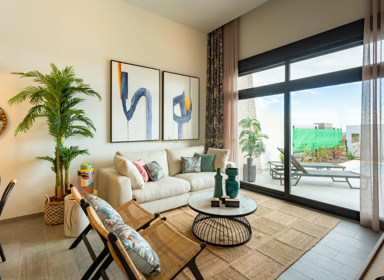 Villas jumelées neuves avec piscine privée à La Finca Golf Resort Algorfa Villas modernes dans un prestigieux complexe de golf sur la Costa Blanca Découvrez ces élégantes villas jumelées neuves situées dans le complexe exclusif La Finca Golf Resort à Algorfa, l'un des quartiers résidentiels les plus prisés de la Costa Blanca Sud. Entouré par la nature, des terrains de golf et des paysages paisibles, ce complexe offre un équilibre parfait entre tranquillité et proximité des services essentiels, des plages et des installations de loisirs. La Finca Golf Resort est réputé pour son parcours de golf de championnat, son hôtel de luxe, ses restaurants et ses installations de bien-être. La ville voisine d'Algorfa a conservé son charme espagnol traditionnel tout en offrant un accès pratique aux grandes destinations côtières telles que Torrevieja et les belles plages du sud de la Costa Blanca. Villas élégantes de plain-pied avec des agencements spacieux Chaque villa offre environ 105 m² de surface construite sur des terrains généreux de 450 m². Les maisons sont conçues de plain-pied pour maximiser le confort et l'accessibilité tout en offrant des espaces de vie lumineux et ouverts. La propriété comprend trois chambres spacieuses avec placards intégrés et deux salles de bains modernes, dont une chambre principale avec salle de bains attenante. Les salles de bains sont équipées de miroirs et de douches à l'italienne avec parois en verre pour un design épuré et contemporain. La cuisine ouverte s'intègre parfaitement au salon et à la salle à manger et comprend un bar pratique pour le petit-déjeuner, créant un espace lumineux et fonctionnel, idéal pour la vie quotidienne et les réceptions. Une buanderie séparée ajoute un confort supplémentaire à la maison. Un escalier extérieur mène au grand solarium privé sur le toit, offrant un espace extérieur supplémentaire pour se détendre et profiter du climat méditerranéen. Piscine privée et style de vie méditerranéen en plein air De grandes portes coulissantes en verre relient le salon intérieur à la terrasse extérieure et au jardin paysager. Chaque villa comprend une piscine privée, créant un environnement parfait pour se détendre l'après-midi, prendre ses repas en plein air et profiter du climat chaud de la Costa Blanca. Les maisons sont également équipées d'une climatisation centrale entièrement installée pour assurer un confort tout au long de l'année. Emplacement privilégié à proximité des plages, des terrains de golf et des commodités Ces villas sont idéalement situées à quelques pas du terrain de golf et à proximité de nombreuses destinations clés de la région. Terrain de golf La Finca Golf Resort à quelques pas Plages de Guardamar del Segura à 20 km Centre commercial Zenia Boulevard à 15 km Torrevieja à 20 km Aéroport d'Alicante Elche à 40 km Aéroport international de la région de Murcie à 55 km La région est également entourée d'autres terrains de golf, de parcs naturels et de promenades côtières, offrant un excellent cadre de vie aux amateurs de golf et aux amoureux de la plage. Réservez votre villa au La Finca Golf Resort Ces villas jumelées neuves allient un design moderne, un espace de vie extérieur privé et un emplacement privilégié dans un complexe de golf. Contactez-nous dès aujourd'hui pour obtenir plus d'informations ou pour planifier une visite et découvrir votre nouvelle maison au La Finca Golf Resort à Algorfa.