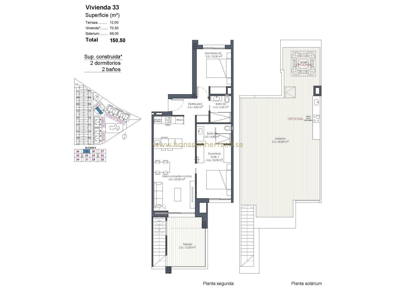 Nieuwbouw resortappartementen bij La Serena Golf-Los Alcazares vlakbij het strand Modern wonen aan de golfbaan aan de Costa Calida Ontdek dit exclusieve nieuwbouwresort bij La Serena Golf in Los Alcazares. Dit moderne project bestaat uit 66 stijlvolle appartementen met 2 of 3 slaapkamers en 2 badkamers, waarvan één en suite, ontworpen om comfort, elegantie en een uitzonderlijke mediterrane levensstijl te bieden op slechts 300 meter van de Mar Menor. Los Alcazares is een charmant kustplaatsje dat bekend staat om zijn ontspannen sfeer, zandstranden en lange boulevard. Met meer dan 300 dagen zon per jaar biedt de omgeving een perfecte omgeving voor buitenactiviteiten, watersporten en golf. Het stadje biedt ook een ruime keuze aan restaurants, winkels, jachthavens en sportfaciliteiten, waardoor het een zeer gewilde bestemming is voor zowel permanente woningen als vakantiehuizen. Appartementen met terrassen, tuinen en privésolaria Het wooncomplex biedt verschillende soorten woningen die passen bij verschillende levensstijlen. Kopers kunnen kiezen tussen appartementen op de begane grond met privétuinen, woningen op de middelste verdieping met ruime terrassen of penthouses met terrassen en grote solaria op het dak. De solariums zijn voorzien van een buitendouche en bieden de mogelijkheid om een zomerkeuken en een privéjacuzzi toe te voegen, waardoor een ideale ruimte ontstaat om te ontspannen en te entertainen terwijl u geniet van het open uitzicht op de golfbaan en het omringende landschap. Elke woning is ontworpen met een licht interieur en open leefruimtes die naadloos aansluiten op de buitenruimtes. Resortachtige voorzieningen en uitzonderlijke gemeenschappelijke ruimtes Een van de meest onderscheidende kenmerken van dit project is het resortachtige concept. Bewoners kunnen genieten van een spectaculair lagunezwembad van ongeveer 190 m2 met strandtoegang en ontspanningsruimtes met Balinese bedden. Extra gemeenschappelijke voorzieningen zijn onder meer aangelegde tuinen, een spa, een fitnessruimte en een sauna in de kelder. Het complex biedt ook een kinderspeelplaats, twee petanquebanen en gemeenschappelijke toiletten bij het zwembad, waardoor een gastvrije omgeving voor bewoners en gasten wordt gecreëerd. Hoogwaardige afwerking en moderne voorzieningen De appartementen zijn gebouwd met moderne materialen en hoogwaardige specificaties, ontworpen voor comfort en stijl. Volledig uitgeruste keuken met witglanzende apparatuur Badkamers met wastafels, doucheschermen en verlichte spiegels Gemotoriseerde rolluiken Basisverlichtingspakket Volledig geïnstalleerde airconditioning Ondergrondse parkeerplaats voor elke woning Ondergrondse fietsenstalling en optionele opslagruimtes Toplocatie dicht bij het strand en de golfbaan Mar Menor-strand 0,3 km La Serena Golf naast het project Centrum van Los Alcazares 2 km Cartagena 22 km Murcia 40 km Internationale luchthaven van Murcia 30 km Luchthaven Alicante Elche 90 km Het rustige en ondiepe water van de Mar Menor is het hele jaar door ideaal om te zwemmen, zeilen en paddleboarden. Verzeker uzelf van een woning in La Serena Golf Resort Deze moderne appartementen combineren wonen aan het strand, uitzicht op de golfbaan vanuit de meeste woningen en resortachtige voorzieningen in een van de meest aantrekkelijke gebieden van de Costa Calida. Neem vandaag nog contact met ons op voor meer informatie of om een bezichtiging te regelen en verzeker uzelf van uw nieuwe woning in La Serena Golf-Los Alcazares.